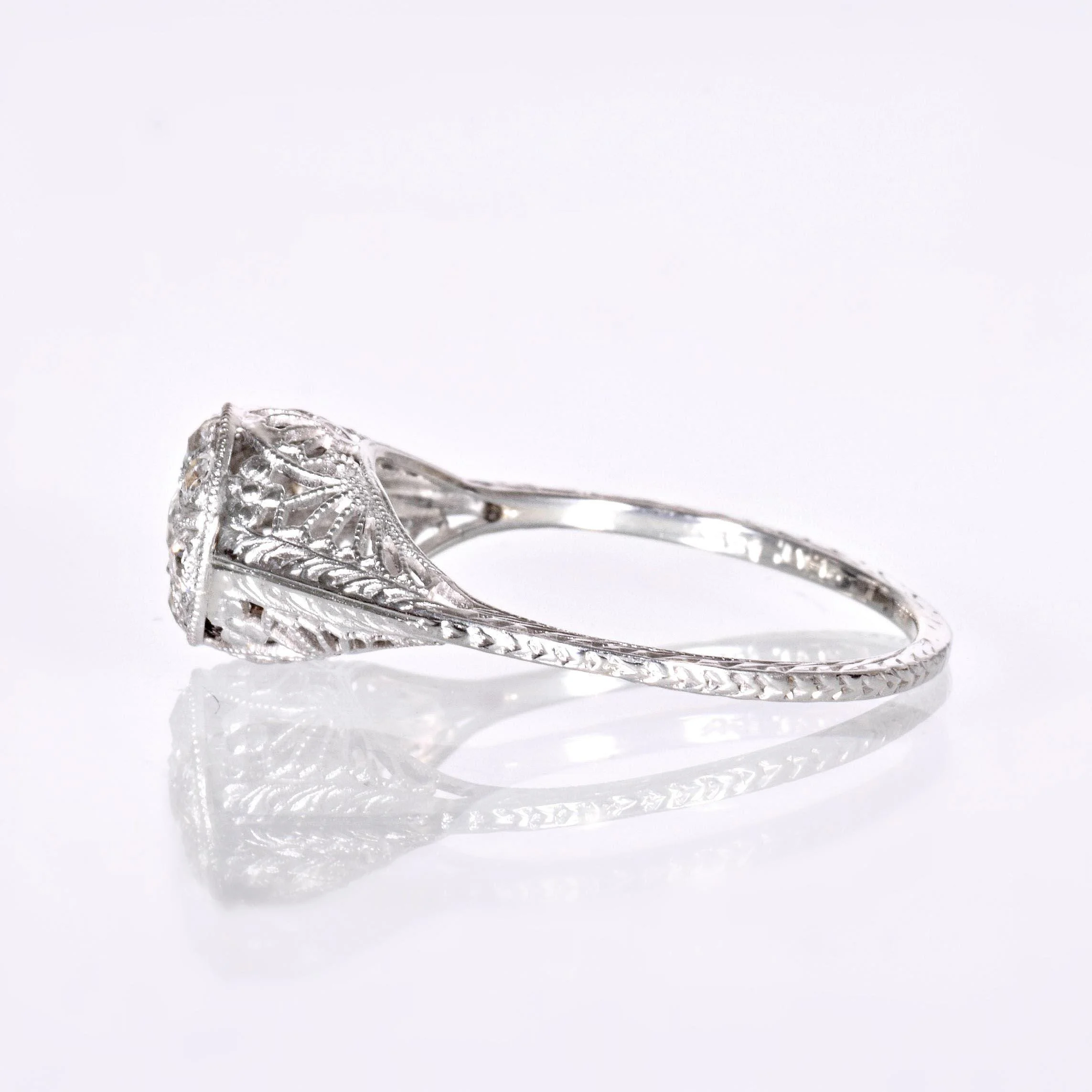 This magnificent mine-cut diamond cluster ring just glistens away within its strong, bright platinum setting from the early 1900's. Fantastic detailing make up the sensational setting, adding to the allure. Fine details include beading, open work and remarkably crisp engraving that extends all around the shank. Wear this antique beauty with or without a wedding band.