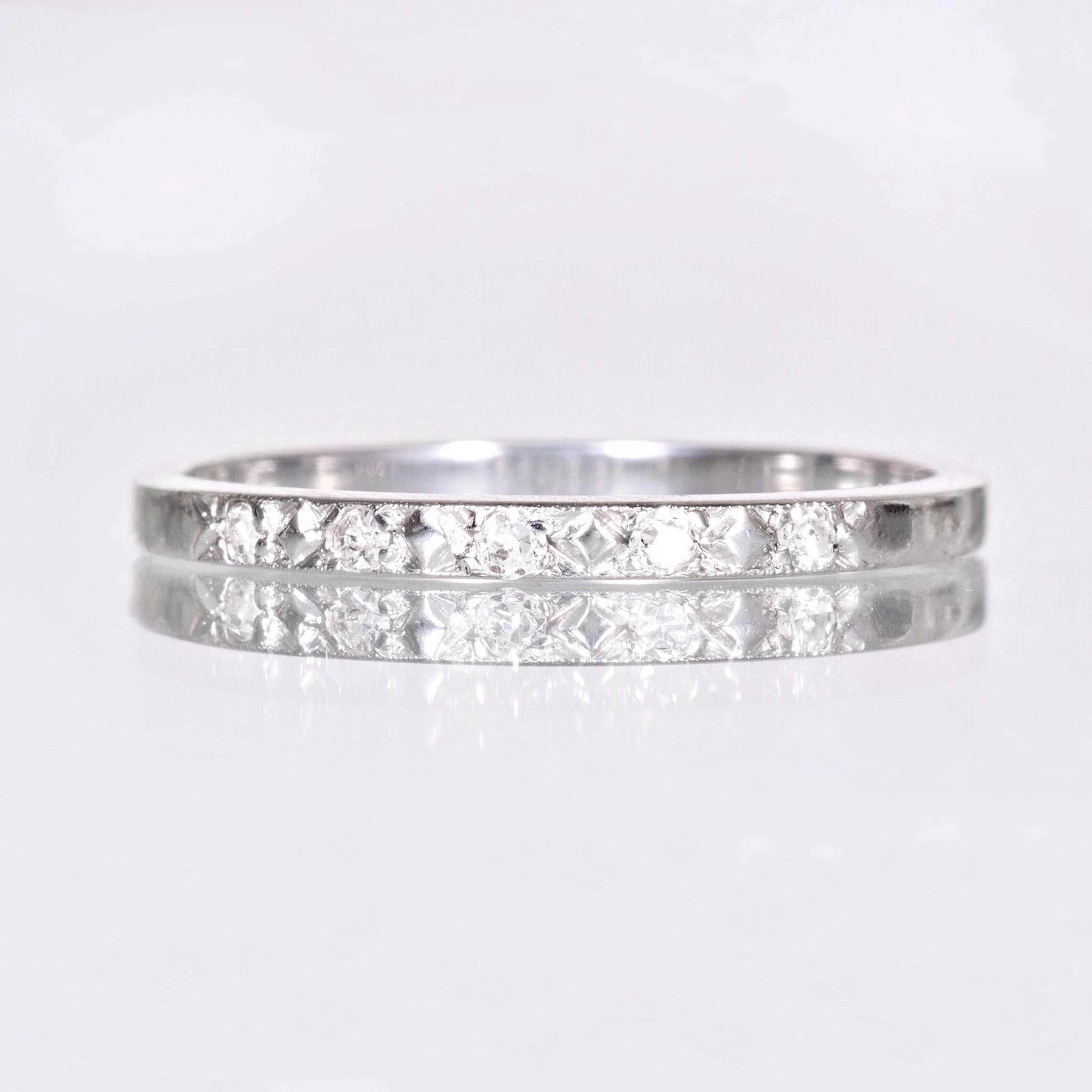 Bring on the old charm of a sweet 1920's era 18k white gold diamond wedding band! It will compliment any engagement ring or stacking combination. Sparkly enough to wear alone is this designer JR Woods band. The J. R. Woods jewelry making company began creating wedding bands in the 1850's in Brooklyn, NY.