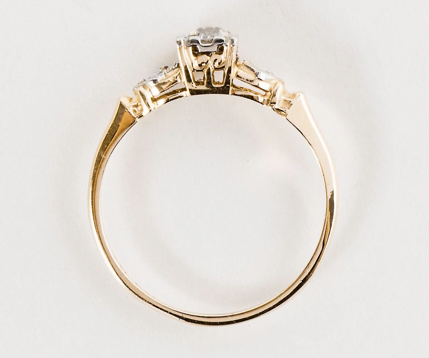 Antique Engagement Ring - Antique 1930s 14k Yellow and White Gold Diamond Engagement Ring 1930s 14k Yellow & White Gold 1 European Cut Diamond = .15ct VS2/G 2 side diamonds = .03ctw Ring Size 4-7/8 (ring is sizable) Ring measures approximately 4.3mm at center, band is 1.2mm.