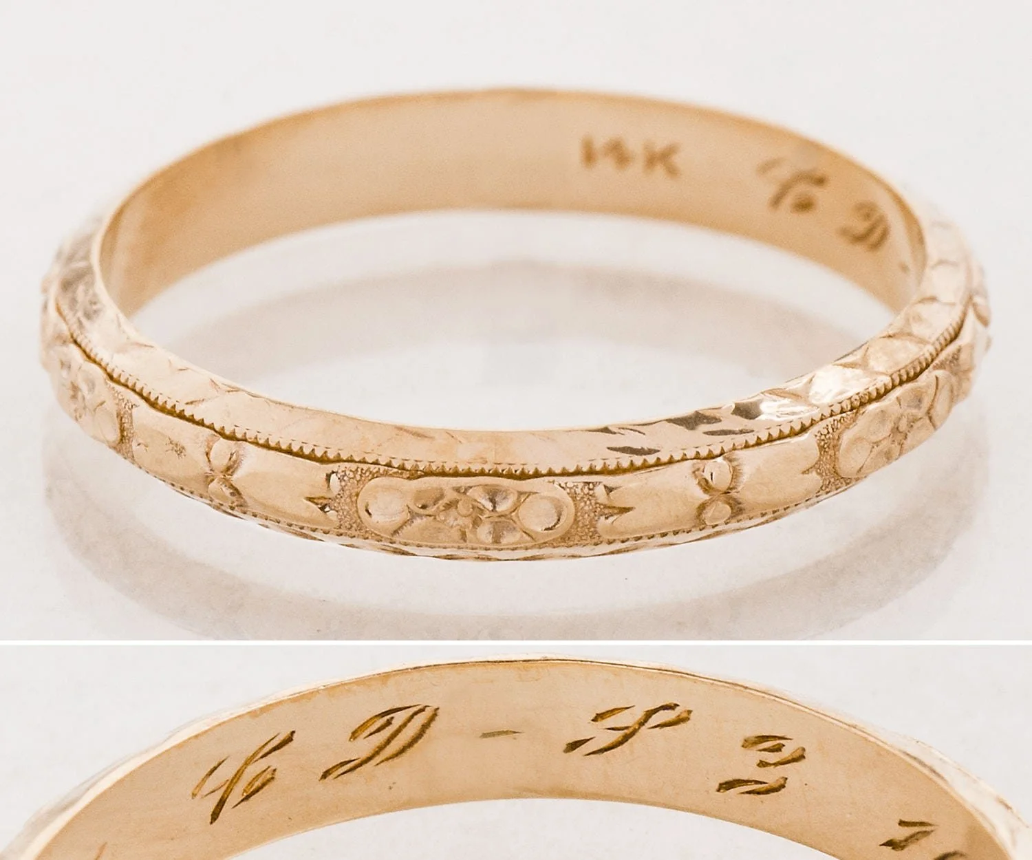 This beautiful 14 k rose gold antique wedding band can be unisex for sure. Featuring scalloped edging, fine milgrain, floral design, and above all else.....engraving on the inside! We love when the original engraving so visible. It conjures up for us a great romance of long ago. In wonderful, crisp condition!