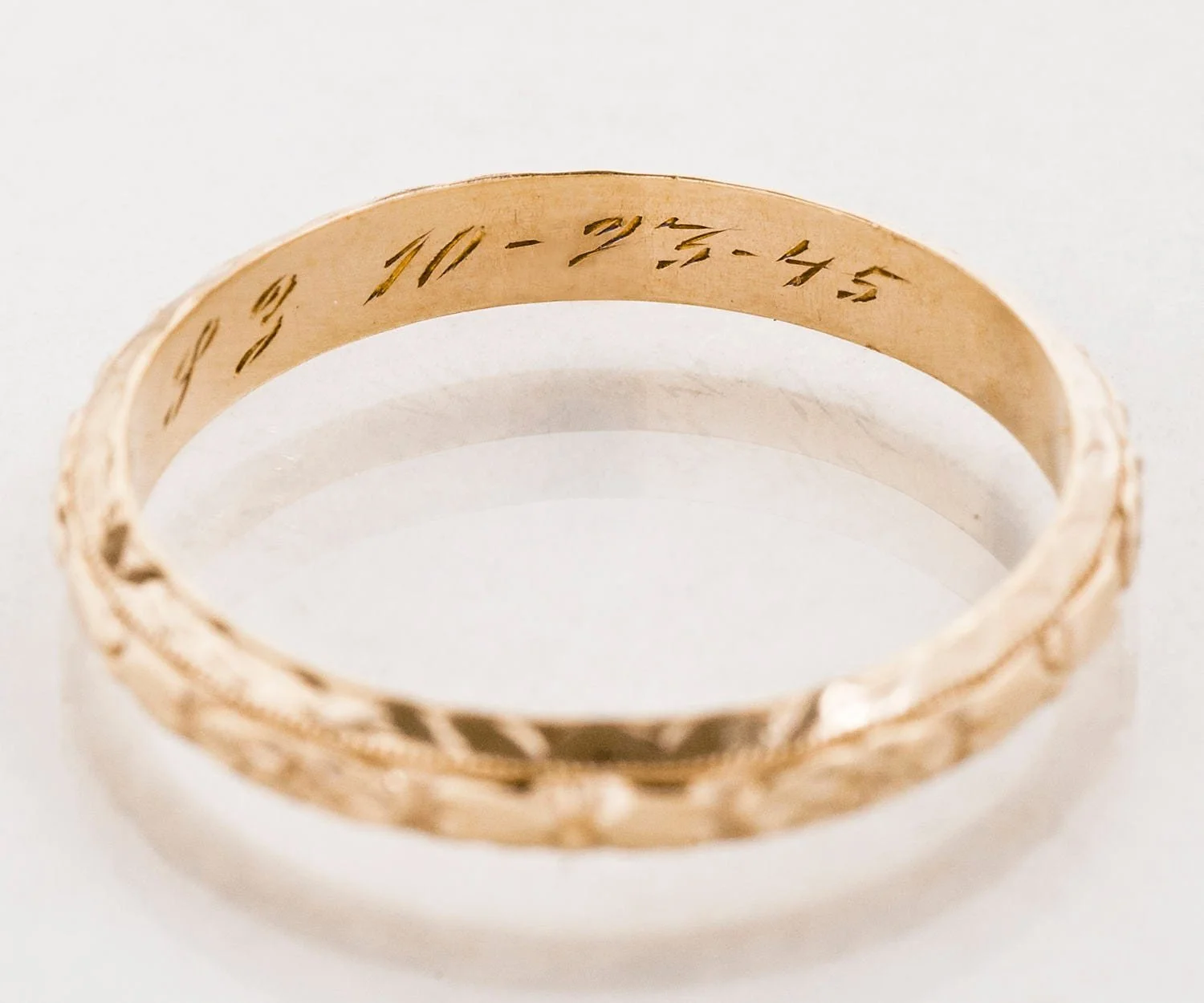 Antique Wedding Band - Antique Men's 14k Rose Gold Engraved "1945" Wedding Band 14k Rose Gold Engraved "CD - FZ 10-23-45" Ring Size 10.75 Band measures 3.6mm wide.