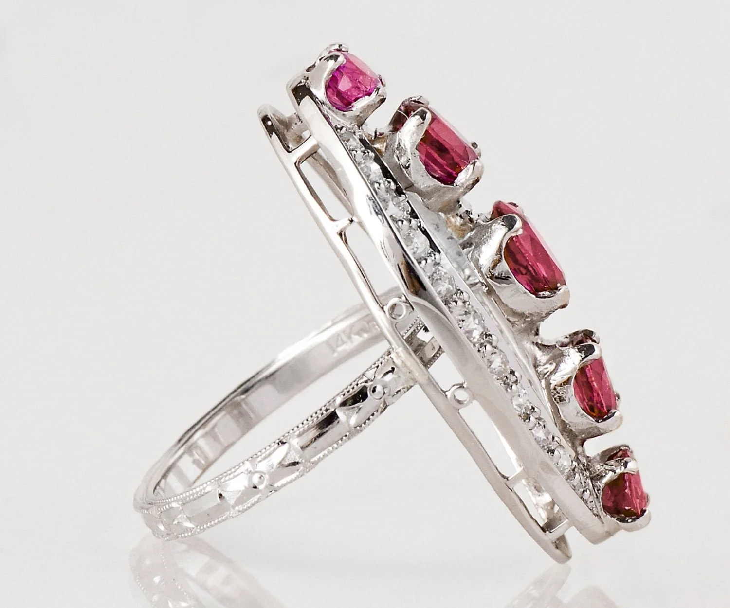 This unique conversion ring has been created from both an antique pin and antique etched wedding band. What a unique ring to give as a gift to the one you love. Featuring 5 beautiful deep fuscia pink rubies and an additional .60cts of old European cut diamonds.