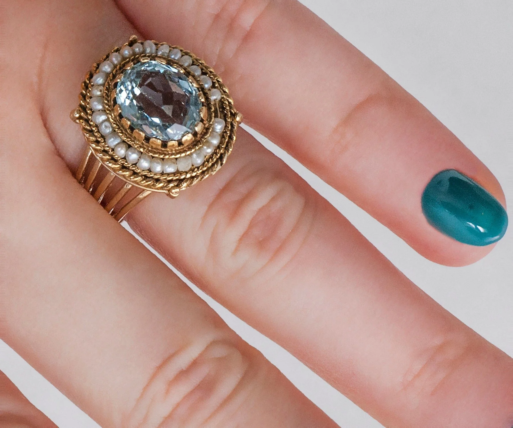 Just like the ocean, the large aquamarine stone featured here in this gorgeous 14k yellow gold antique ring is so lovely and soothing just to gaze at! Circling the secure blue stone is a ring of natural seed pearls enhancing its beauty.