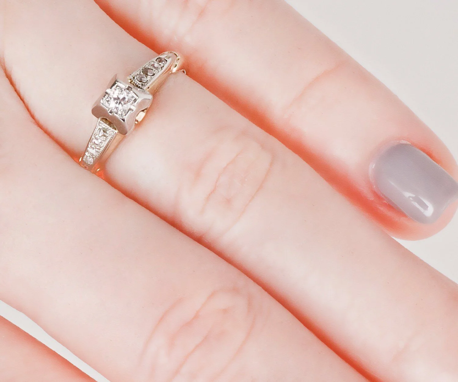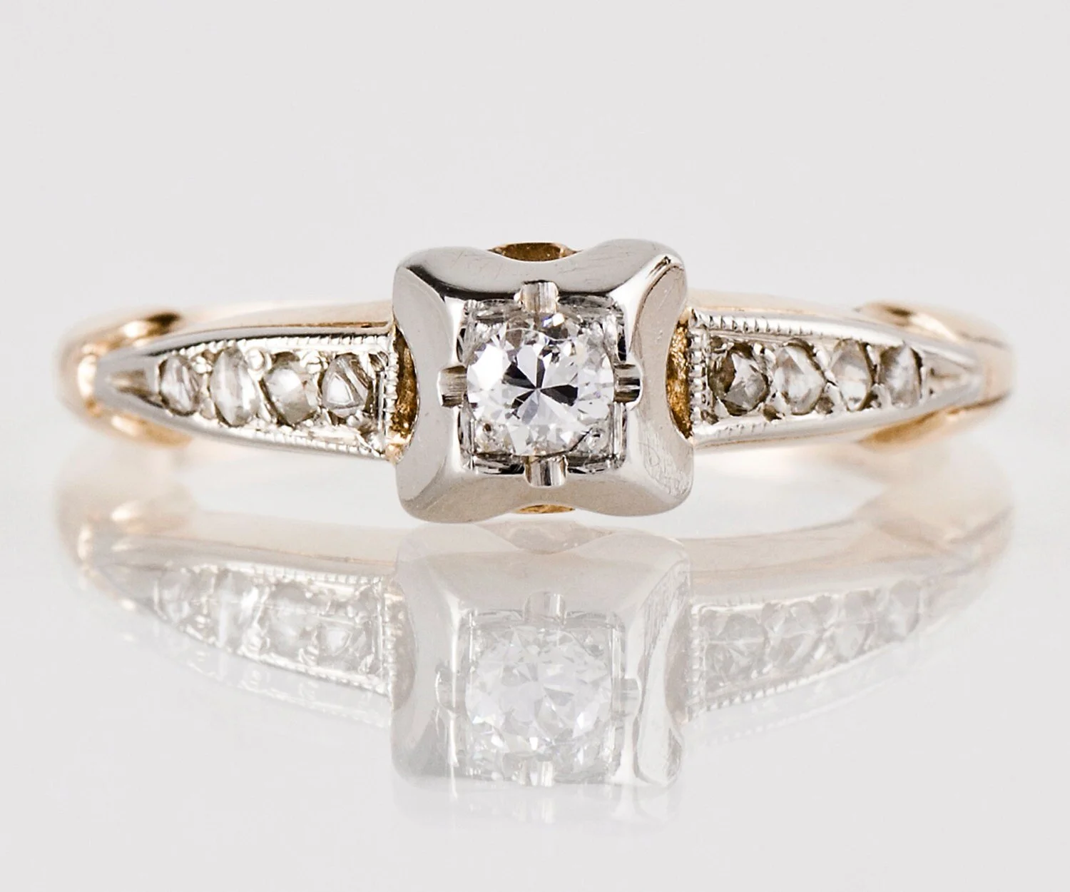This dainty two-tone engagement ring is both feminine and romantic. It would make the sweetest engagement ring for the gal who likes simplicity as well as sparkle!