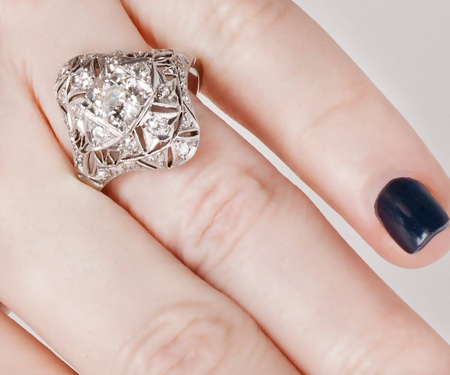 This beautiful and unique antique diamond ring has exquisite filigree work! A European cut diamonds make the ring sparkle brilliantly! The filigree allows light to pass through and illuminate the diamonds. This ring is a very special piece of history...it was beautiful 100 years ago, and will still be beautiful 100 years from now.