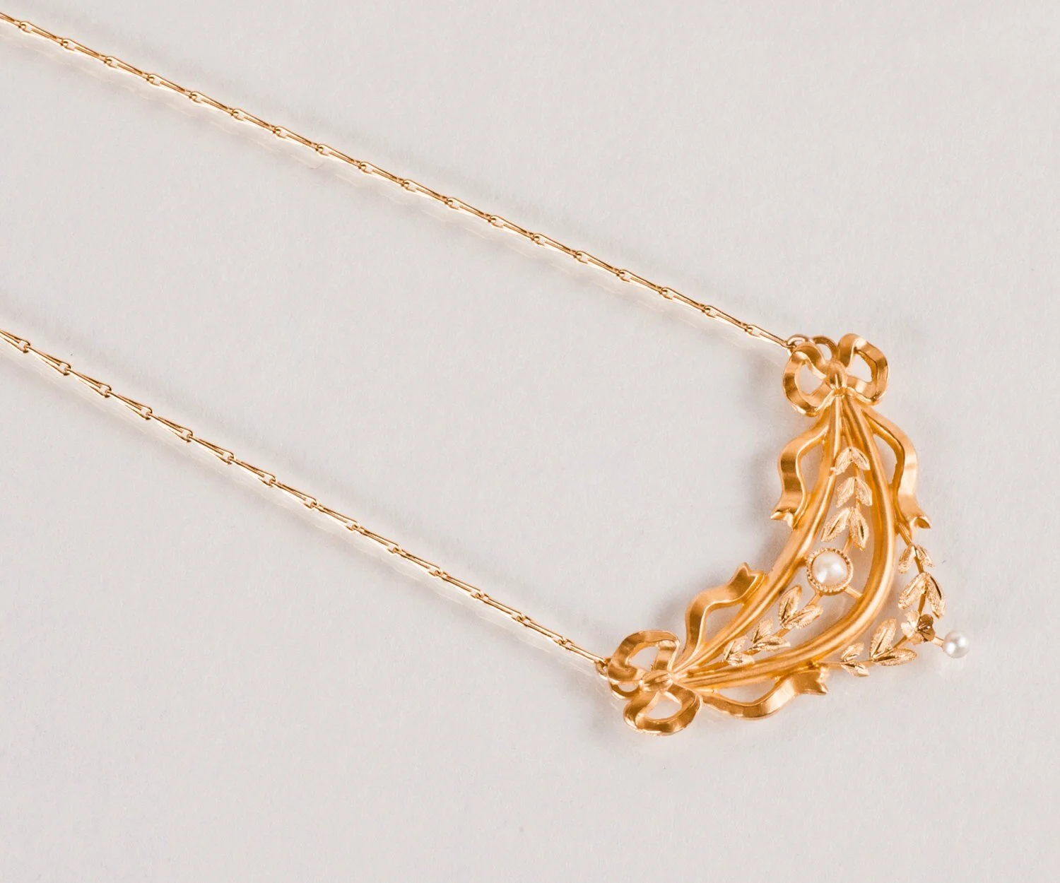 Pretty little ribbons anchor this curvy leafy free flowing design showing us a great example of the Art Nouveau design period. So feminine with 2 shimmering seed pearls, this is a very special piece and is absolutely charming around the neck.