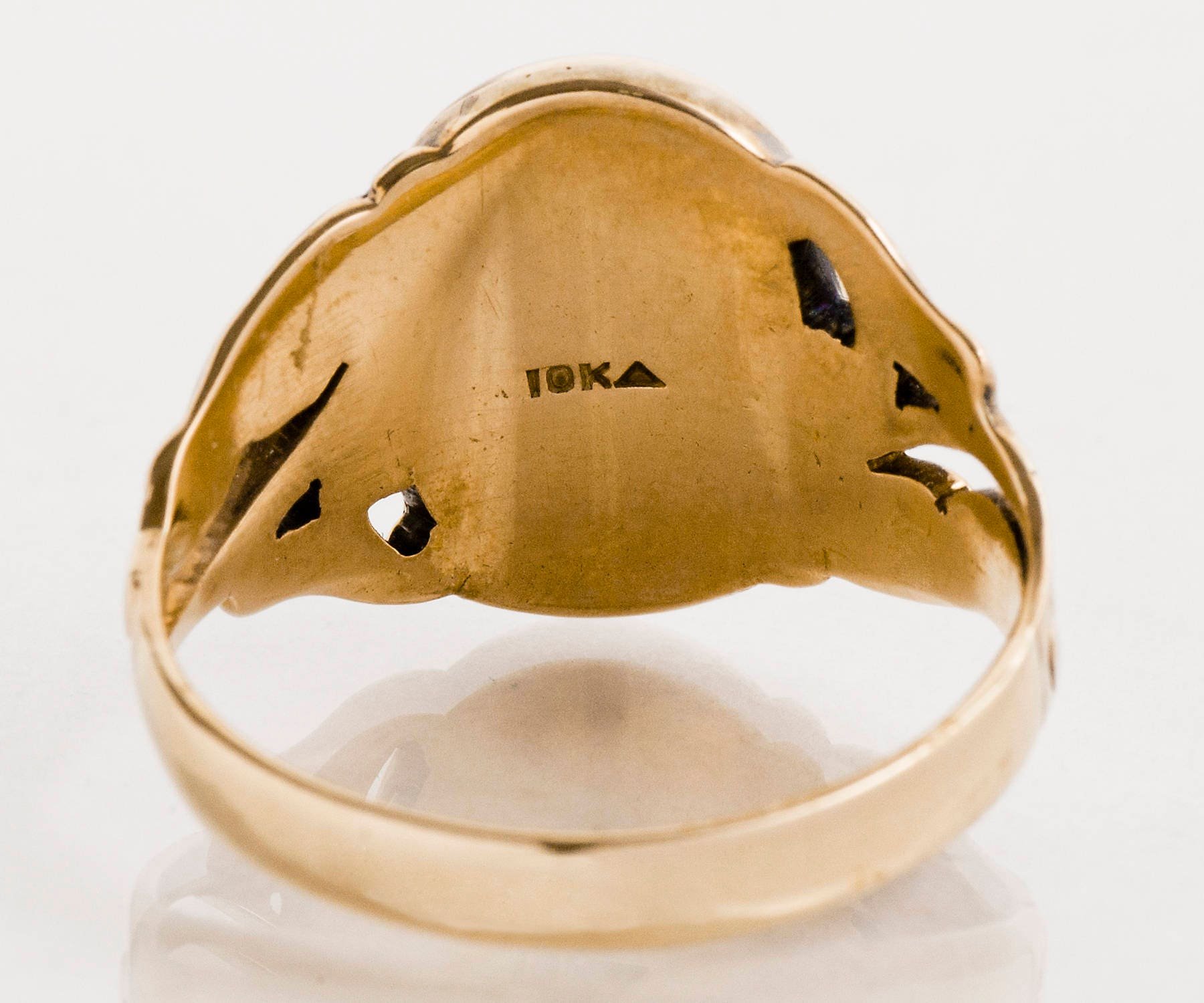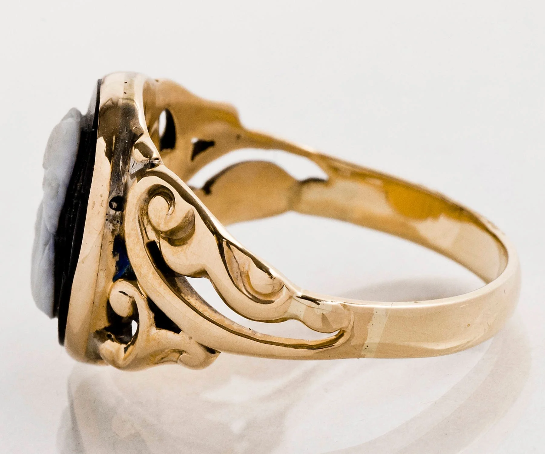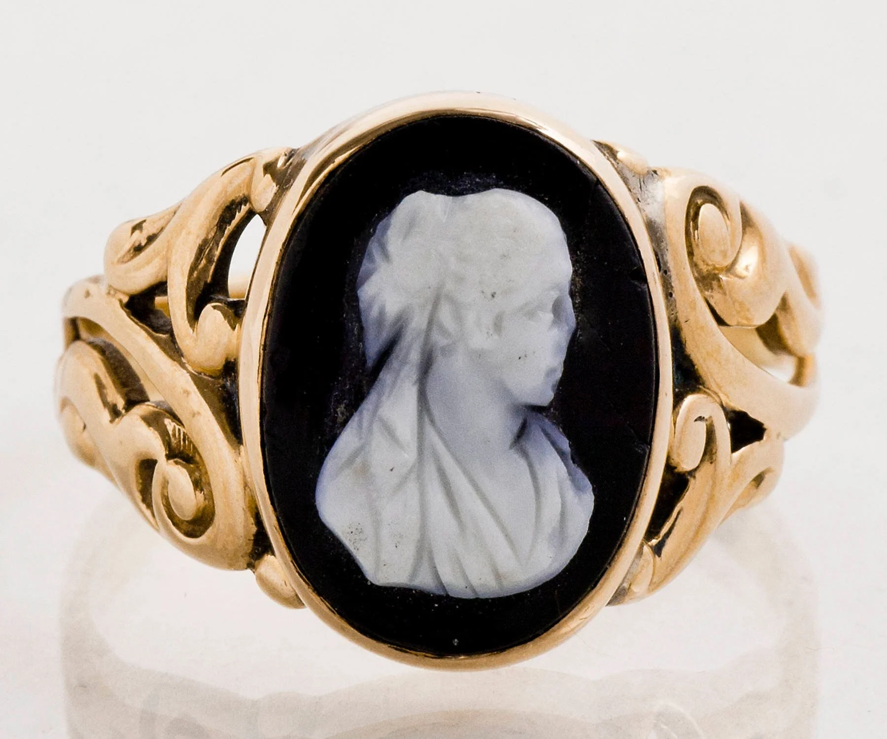Antique Black Onyx Cameo Ring: 10k Yellow Gold Swirl Band