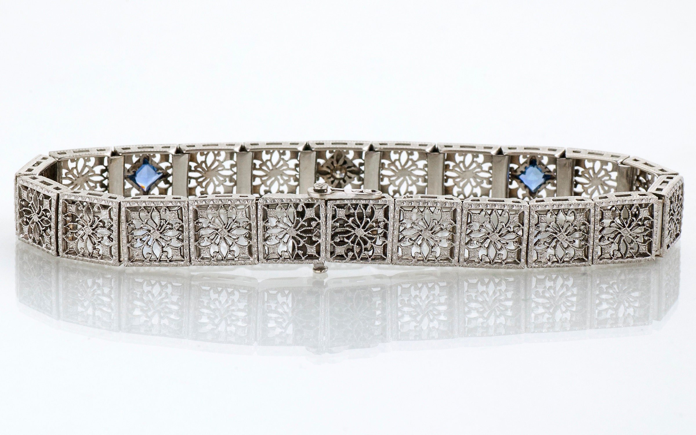 Antique Bracelet - Antique 14k White Gold Filigree Diamond & Sapphire Bracelet 14k White Gold 2 French Cut Blue Sapphires =.50ct 1 European Cut Diamond =.07ct Bracelet measures approximately 7" long and 3/8" wide.