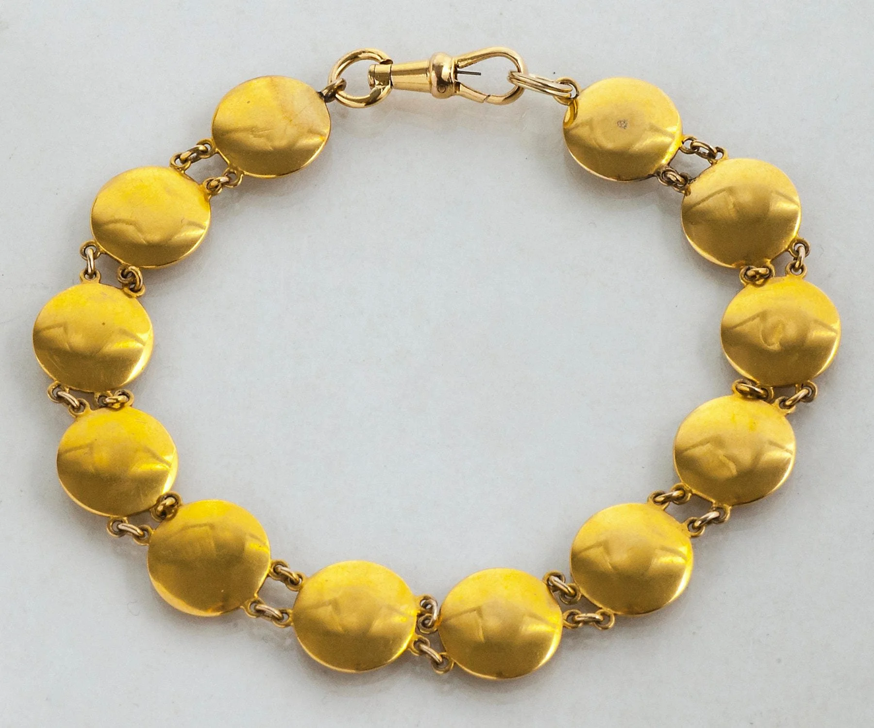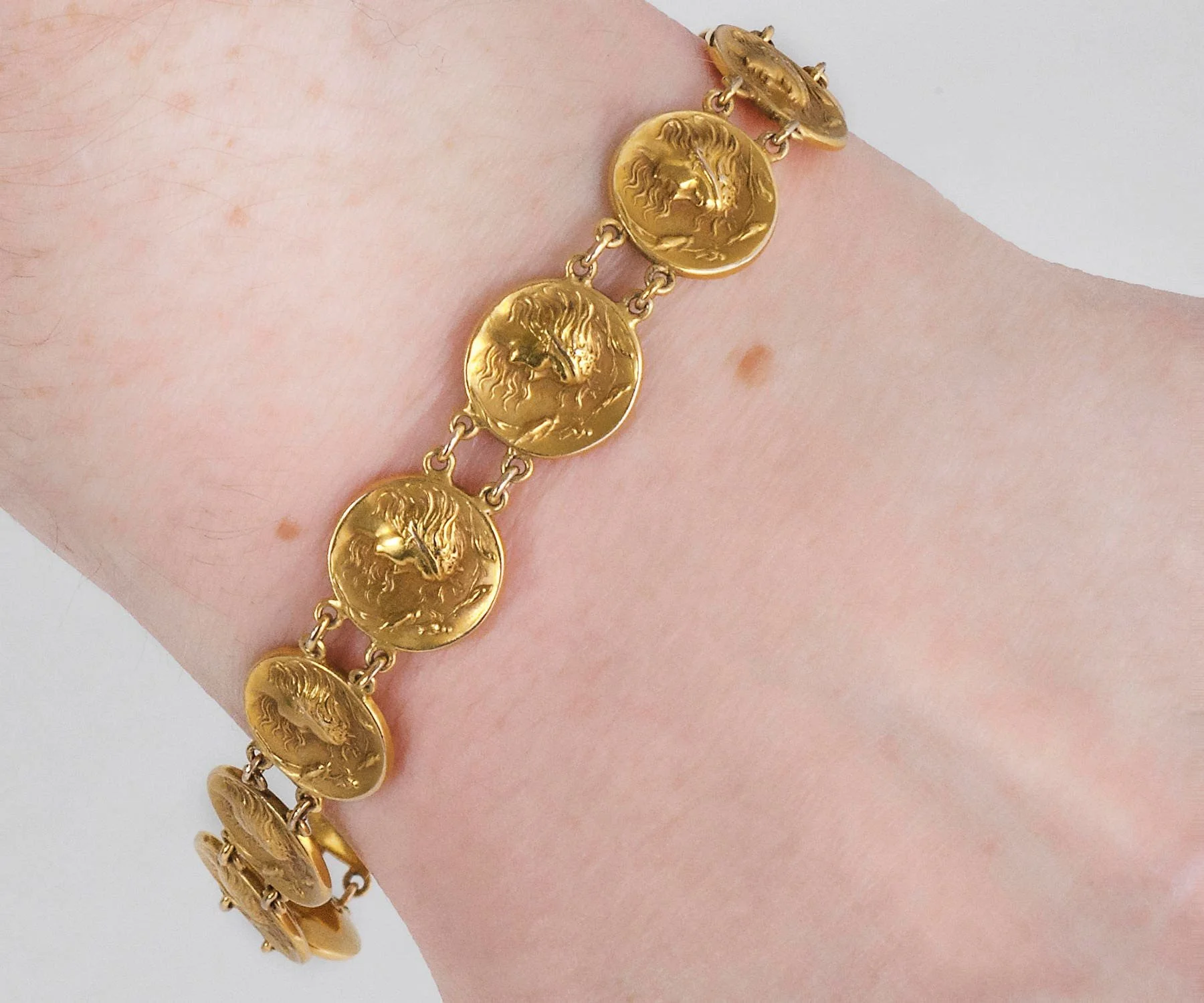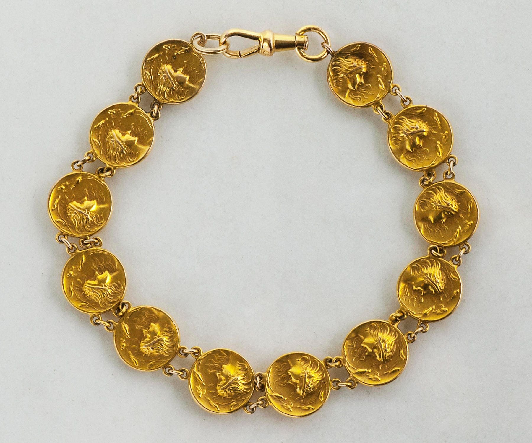 This is a wonderful, unique bracelet from the Art Nouveau period of decorative arts. This era of jewelry is known for freeform lines and feminine curves. This bracelet features round disks displaying carved ladies with flowing hair and birds. Crafted in bright and beaming 14k yellow gold. Generous size.