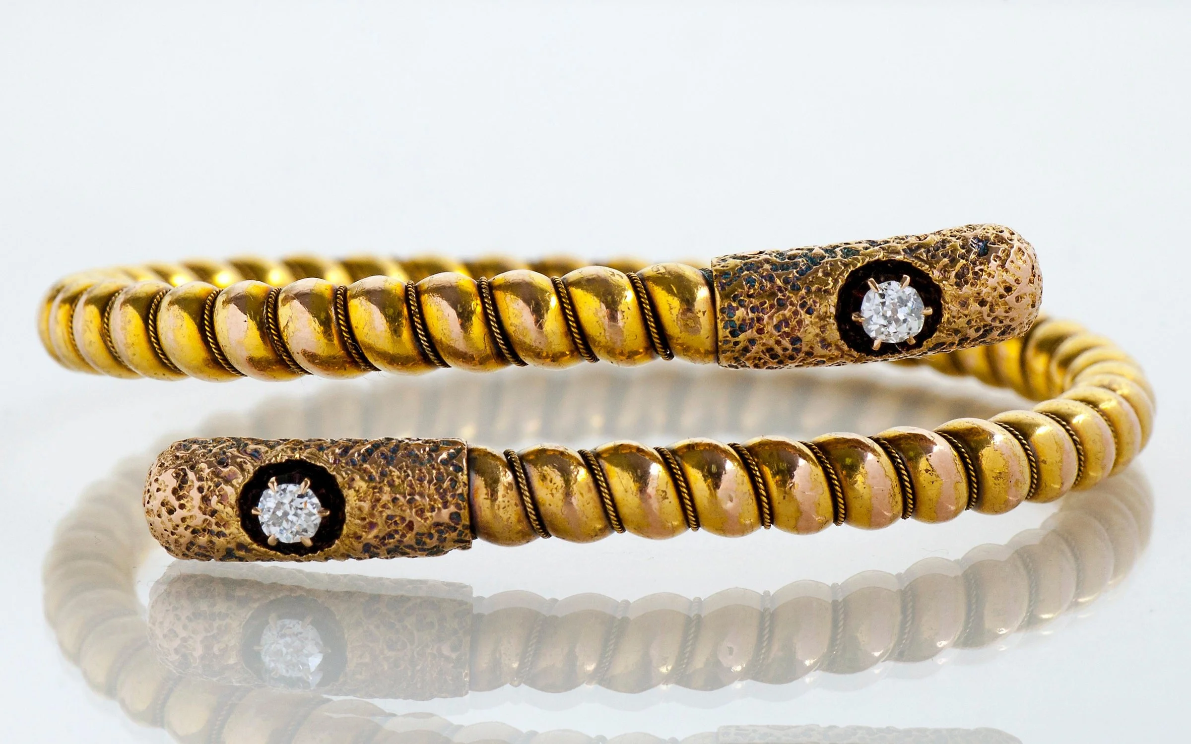 What a find we have here! A very flexible and comfortable to wear daily Victorian cuff bracelet created in both rose and yellow 15k gold. Gorgeous mine cut diamonds dot either end giving this wonderful bracelet just the right amount of shimmer!