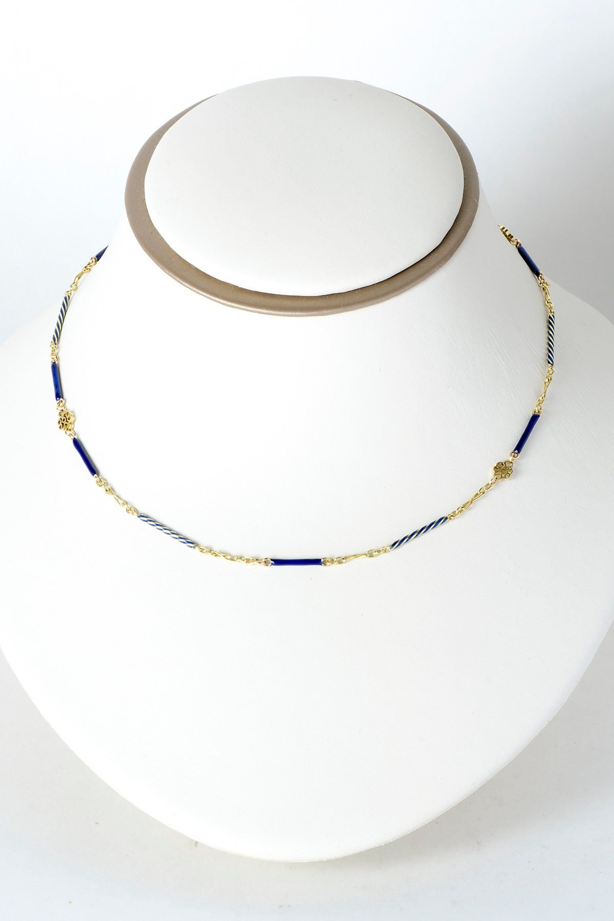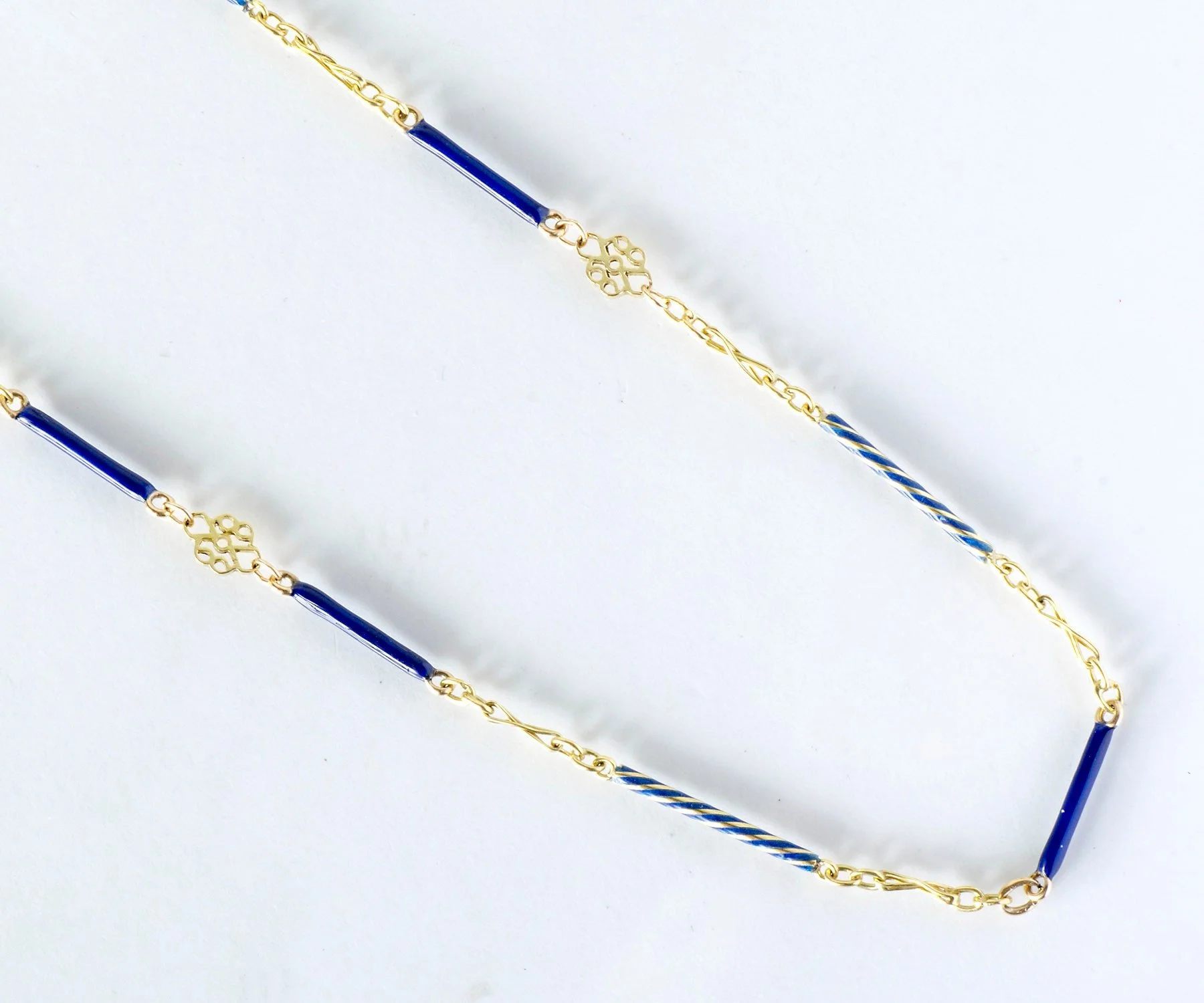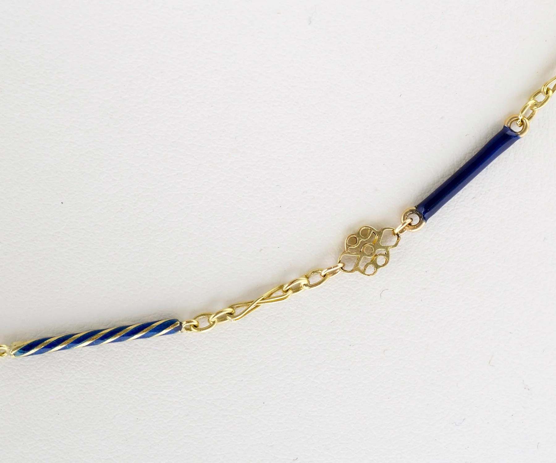 This antique chain showcasing pristine intermittent blue enamel sections connected by bright yellow decorative chain is a rare find! A 1920's treasure, and such a unique one at that!
