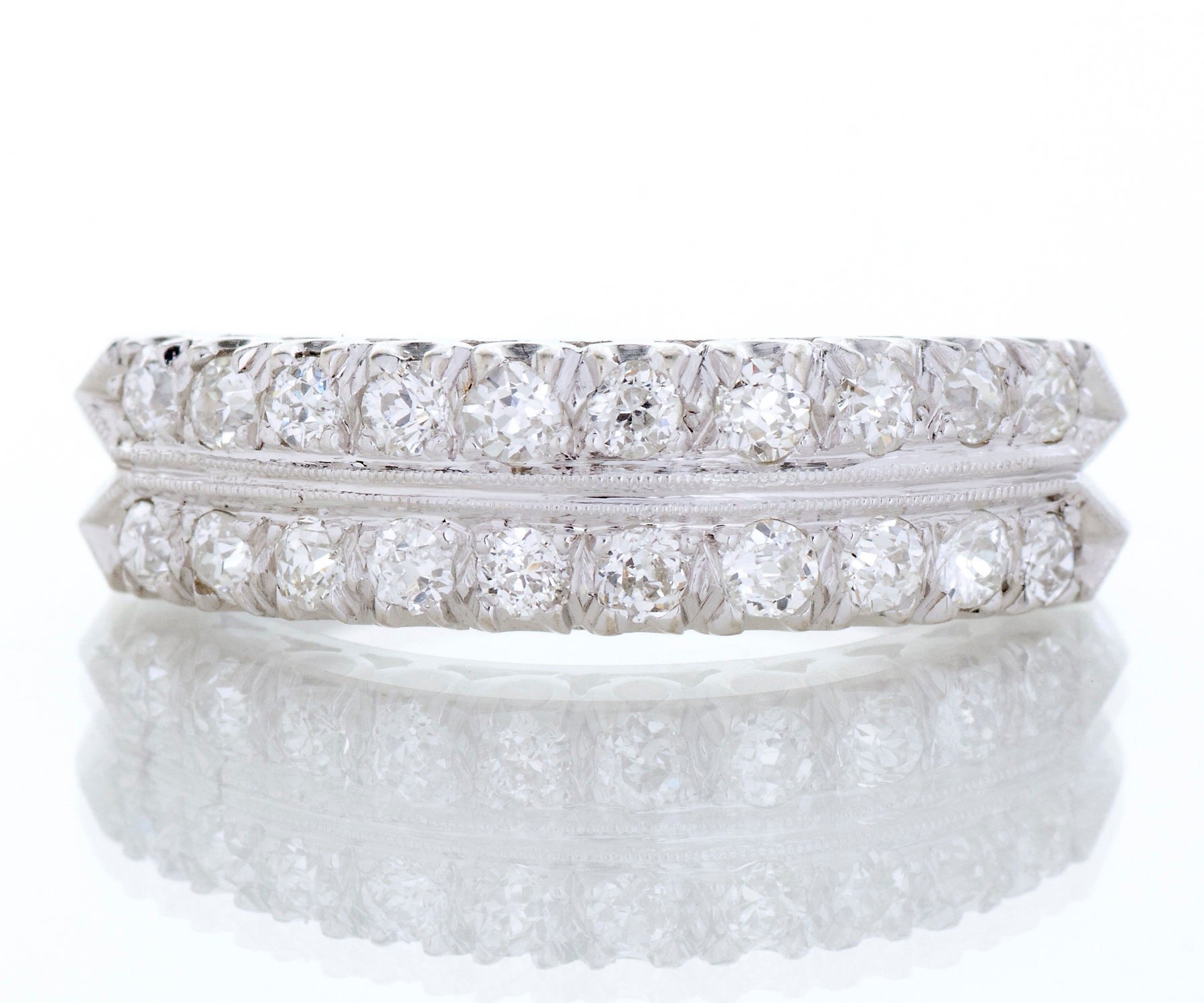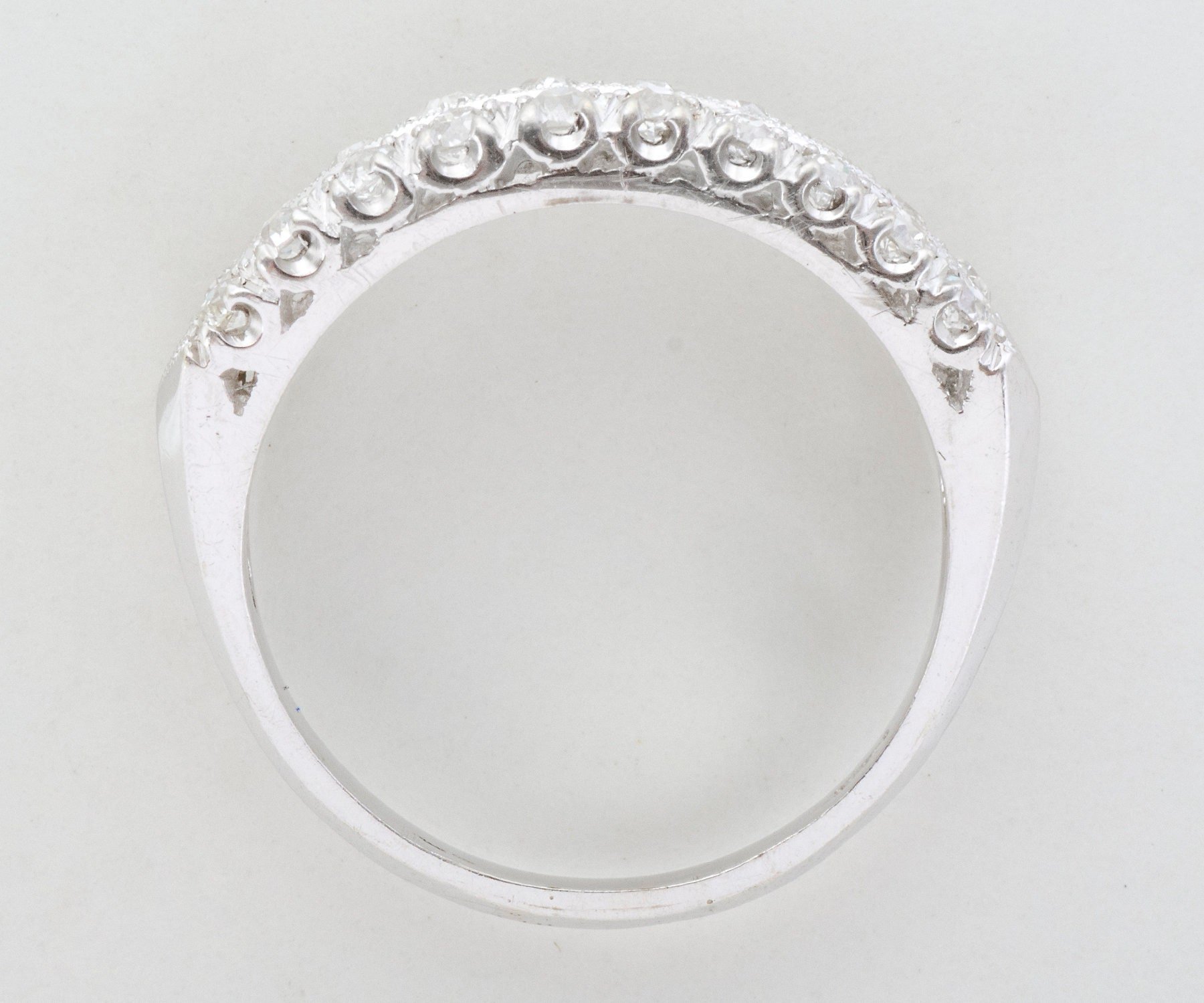 Antique Diamond Band - Antique 14k White Gold Double Row European Cut Diamond Band 14k White Gold 20 European Cut Diamonds =.80cts VS1-SI1/G-H Ring Size 8 (sizable) Band measures approximately 6.2mm wide at center, back of band is 2.7mm wide.