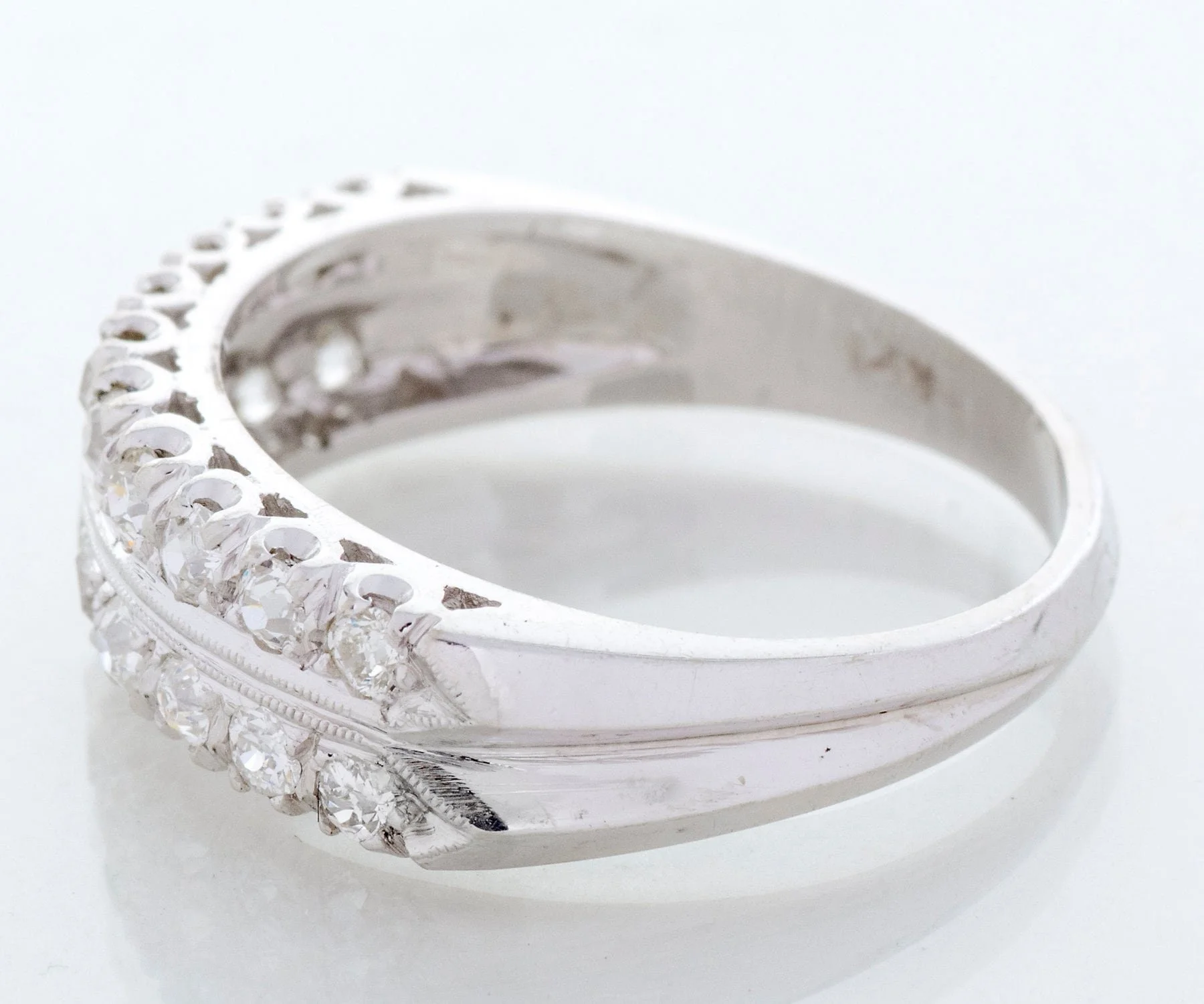 Antique Diamond Band - Antique 14k White Gold Double Row European Cut Diamond Band 14k White Gold 20 European Cut Diamonds =.80cts VS1-SI1/G-H Ring Size 8 (sizable) Band measures approximately 6.2mm wide at center, back of band is 2.7mm wide.