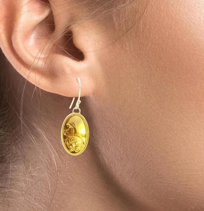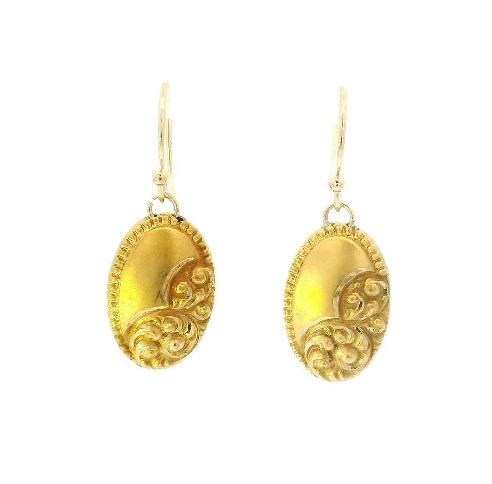 Very early 1900's cufflinks in their first life and now stunning dangle earrings! In beaming 10k yellow gold with a delightful floral swirl motif, these gorgeous conversion earrings will certainly make a nice statement! Perfect for the day of the wedding and everyday thereafter.