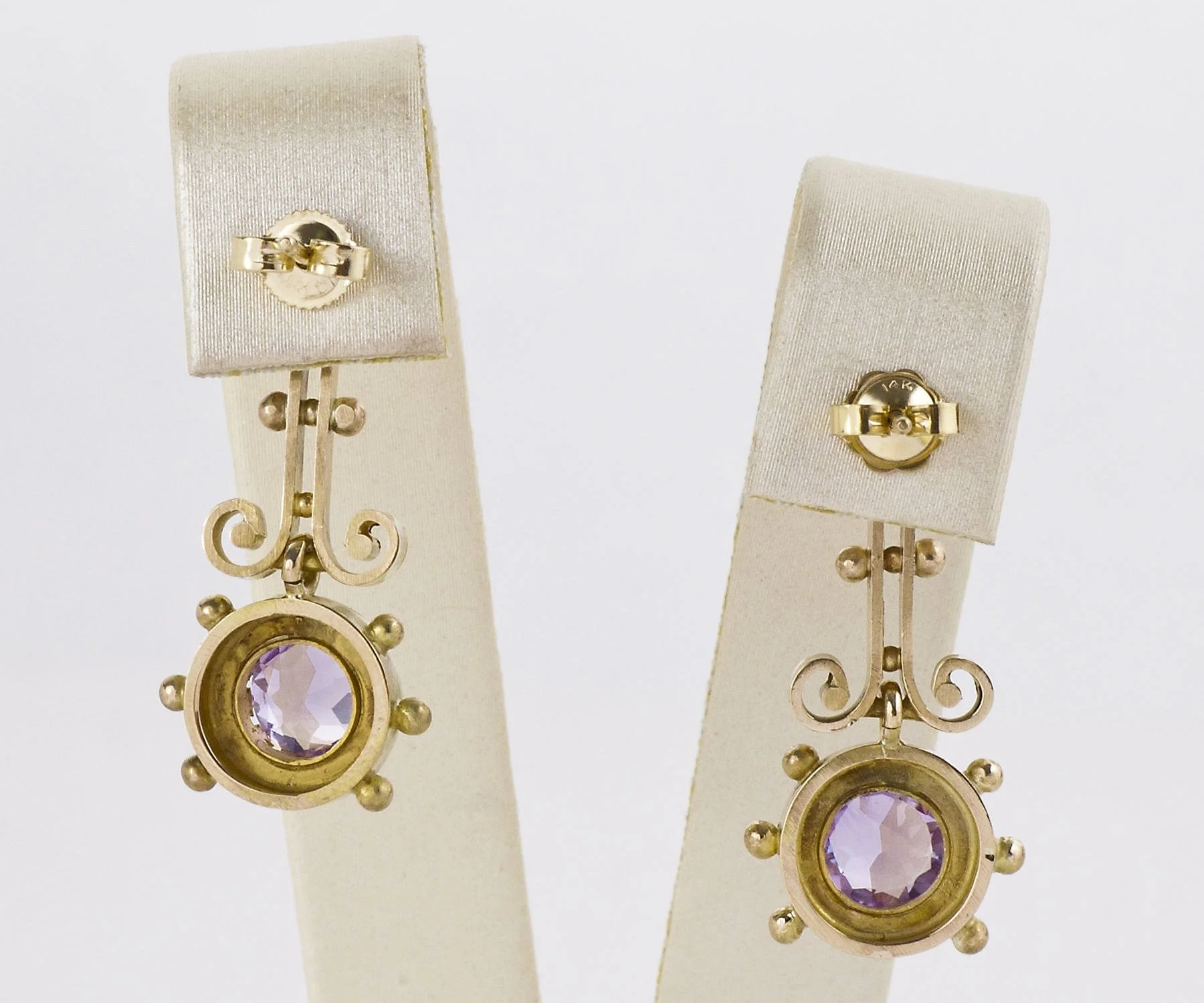 Crafted by our goldsmith from an original Arts and Crafts antique bracelet, these dangle amethyst earrings are not only delectable, but unique! So feminine, any woman would swoon over them. In lovely yellow gold, these earrings are just delightful!