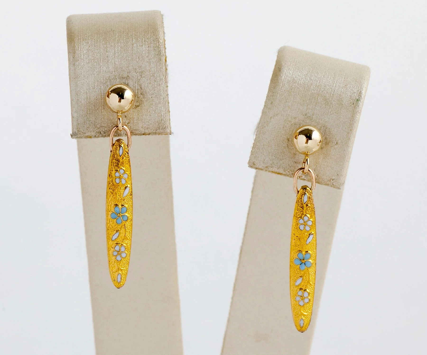 It's not easy to find two matching Victorian lingerie pins that are also in fabulous condition. When we find them, we convert them into earrings! This pair features lovely light blue and white flowers in enamel with a background of beaming 14k yellow gold. In our shop, we are proud to have converted these, giving them a second life. Wear them daily, or for a special occasion. Perhaps your "something blue" and then continue to enjoy them throughout your life.