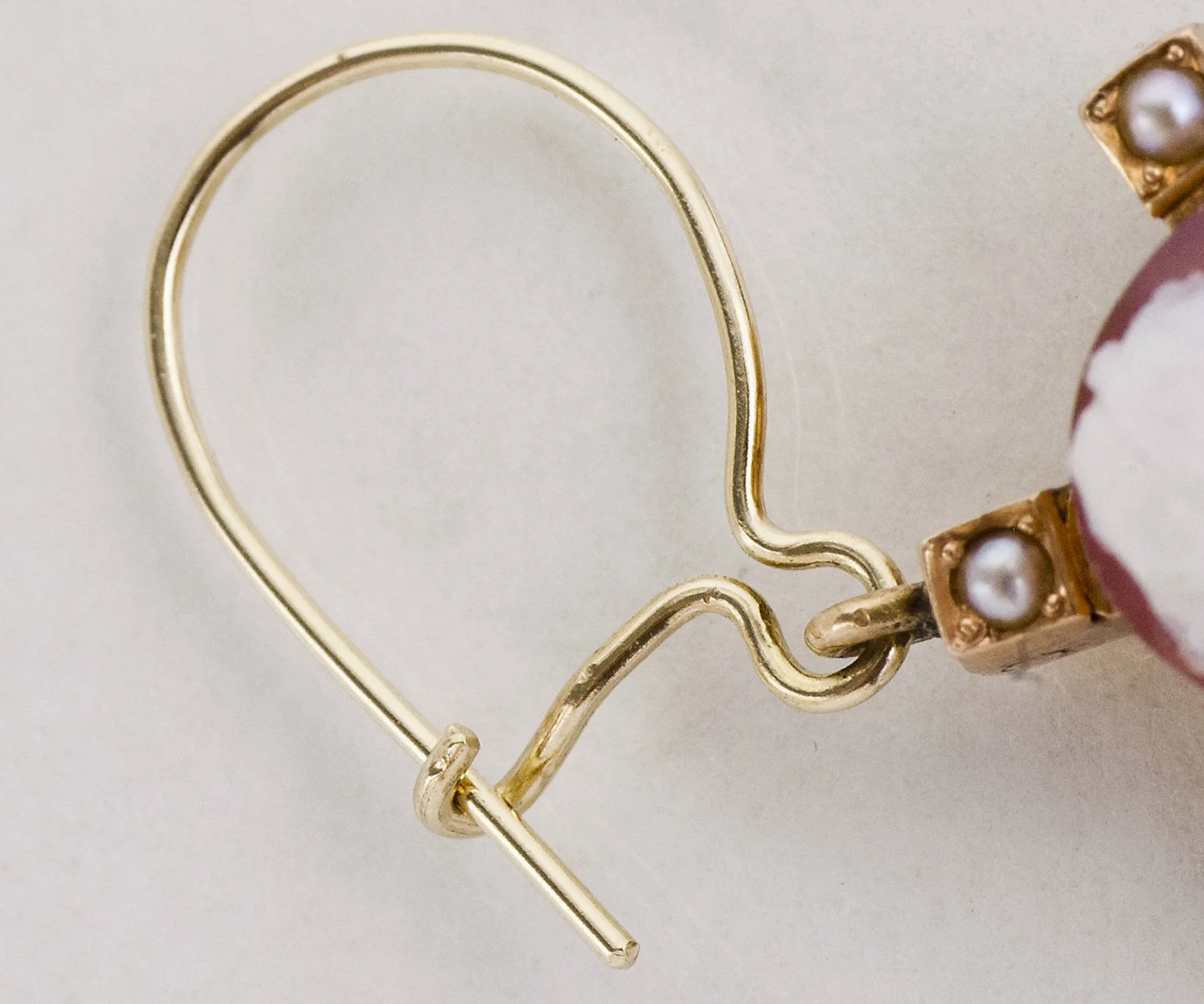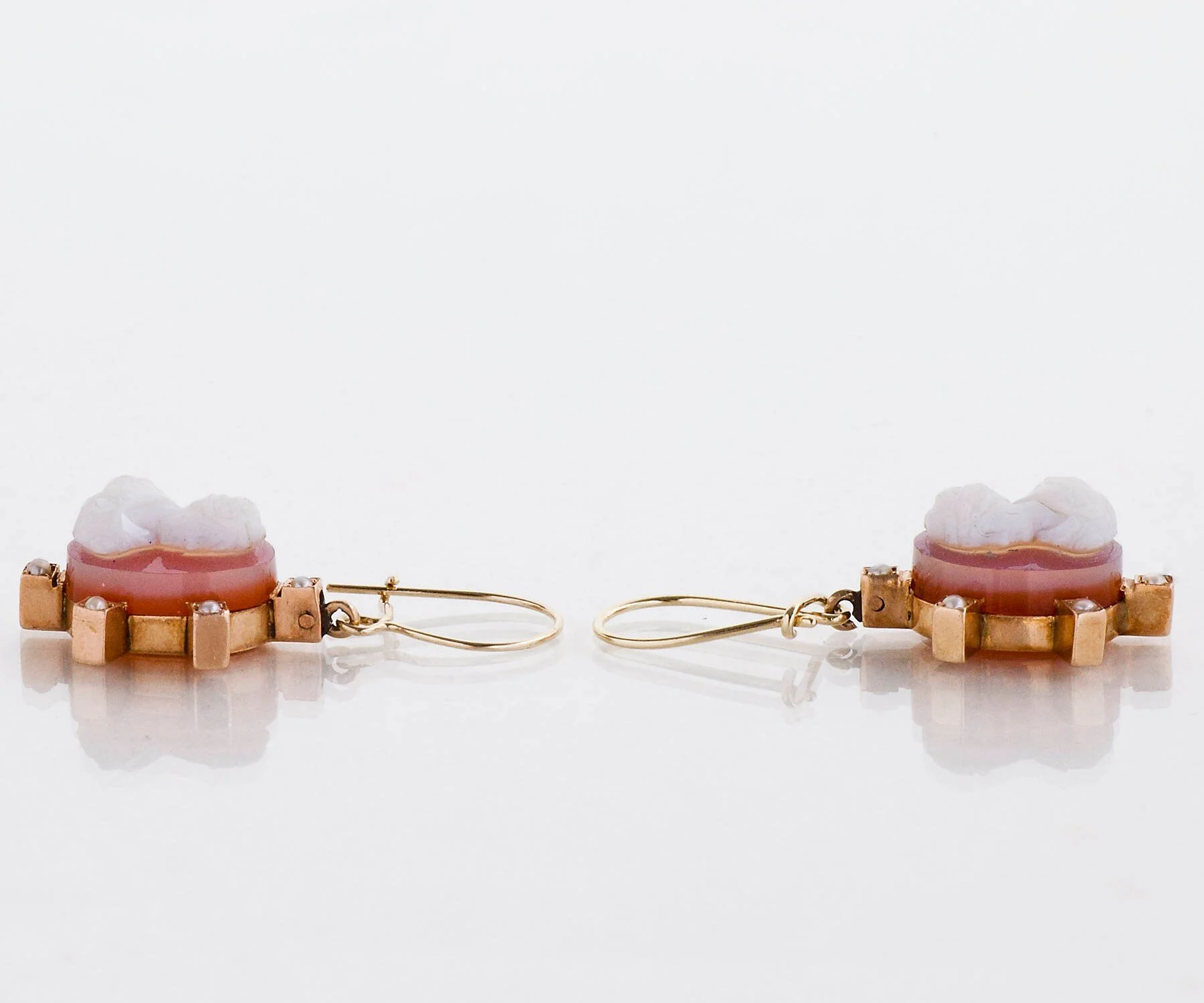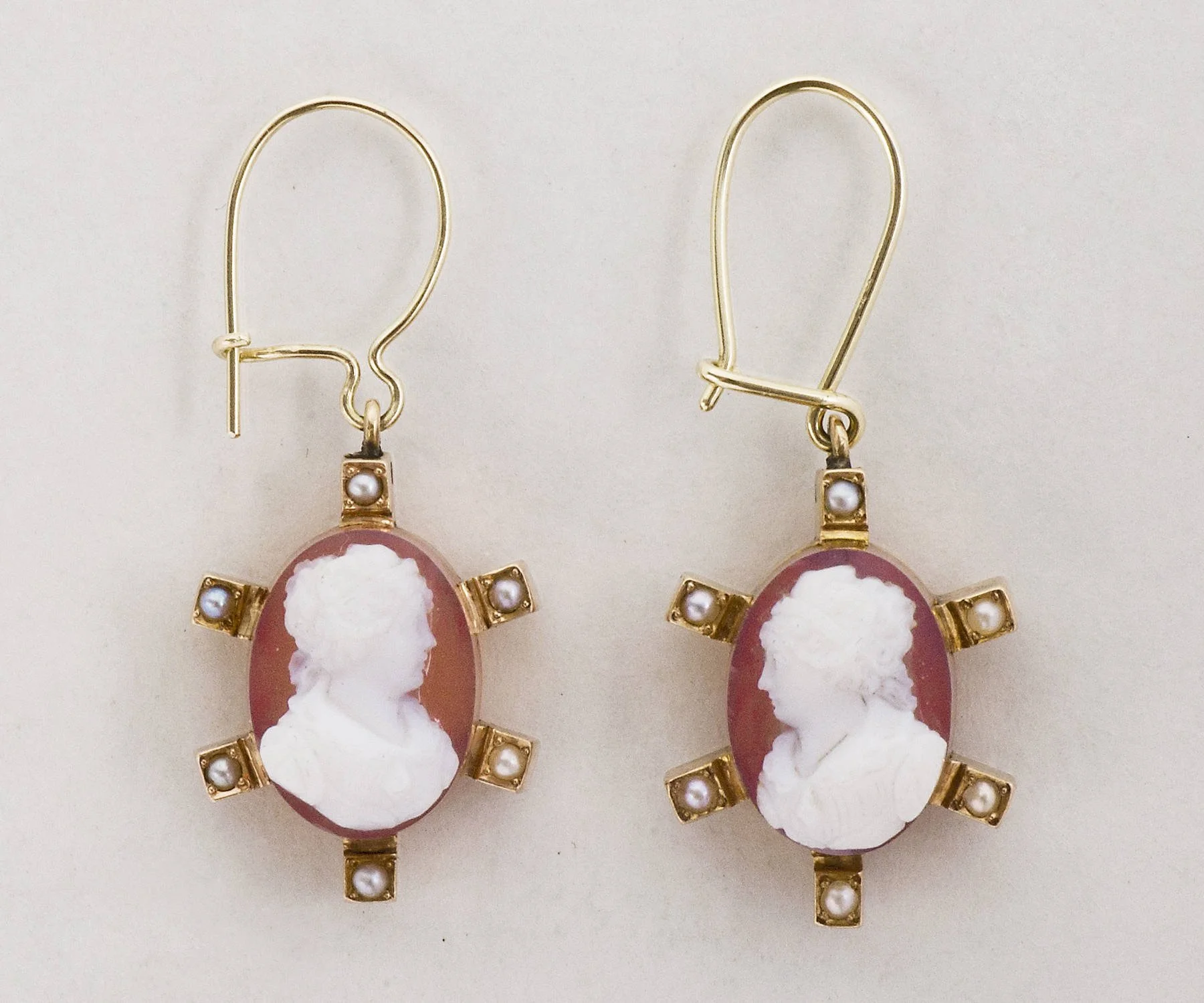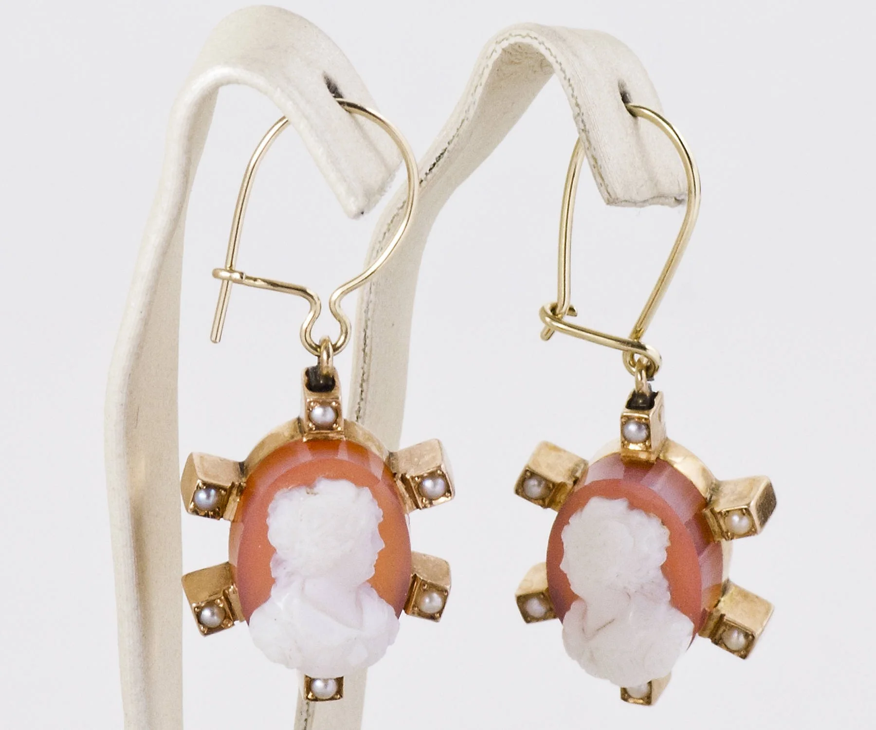 Bright, bold and statement making are these antique 14 k yellow gold cameo dangle earrings. Carved in onyx and adorned with natural seed pearls, these could be your new signature earrings as they would enhance anything you wear. When worn, the cameo's face the toward the sides.