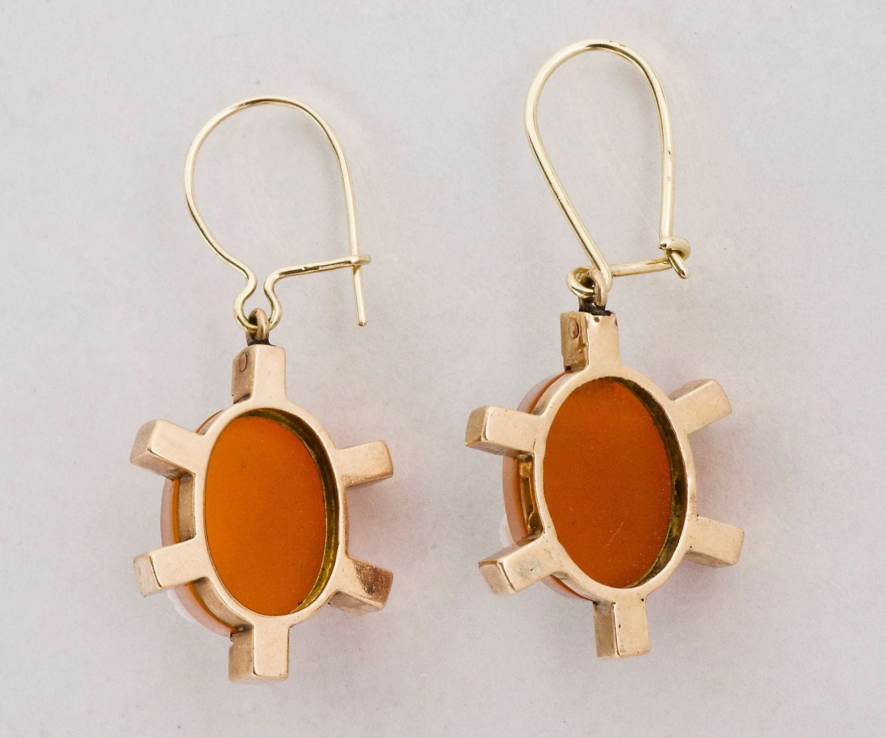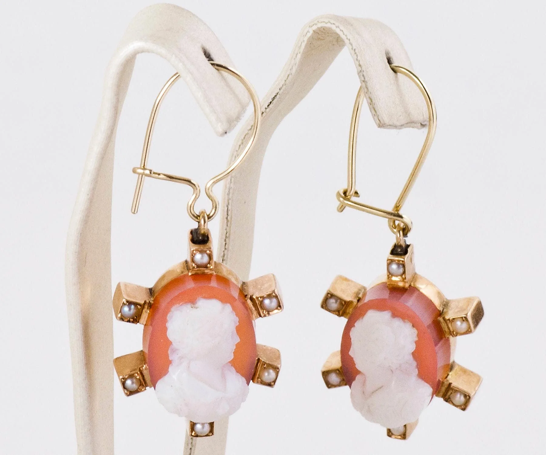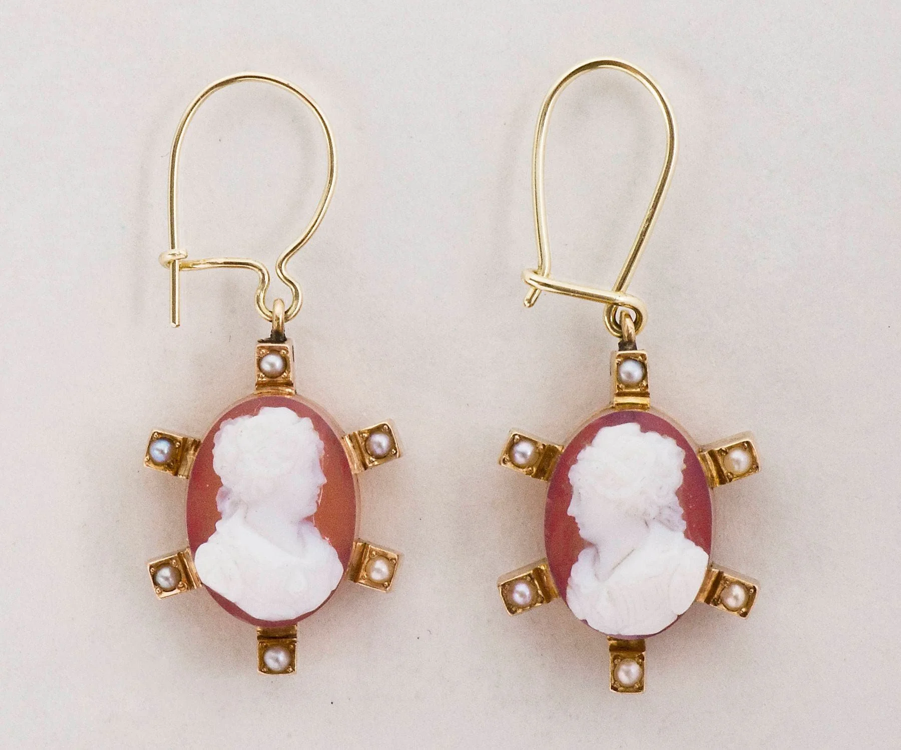 Bright, bold and statement making are these antique 14 k yellow gold cameo dangle earrings. Carved in onyx and adorned with natural seed pearls, these could be your new signature earrings as they would enhance anything you wear. When worn, the cameo's face the toward the sides.