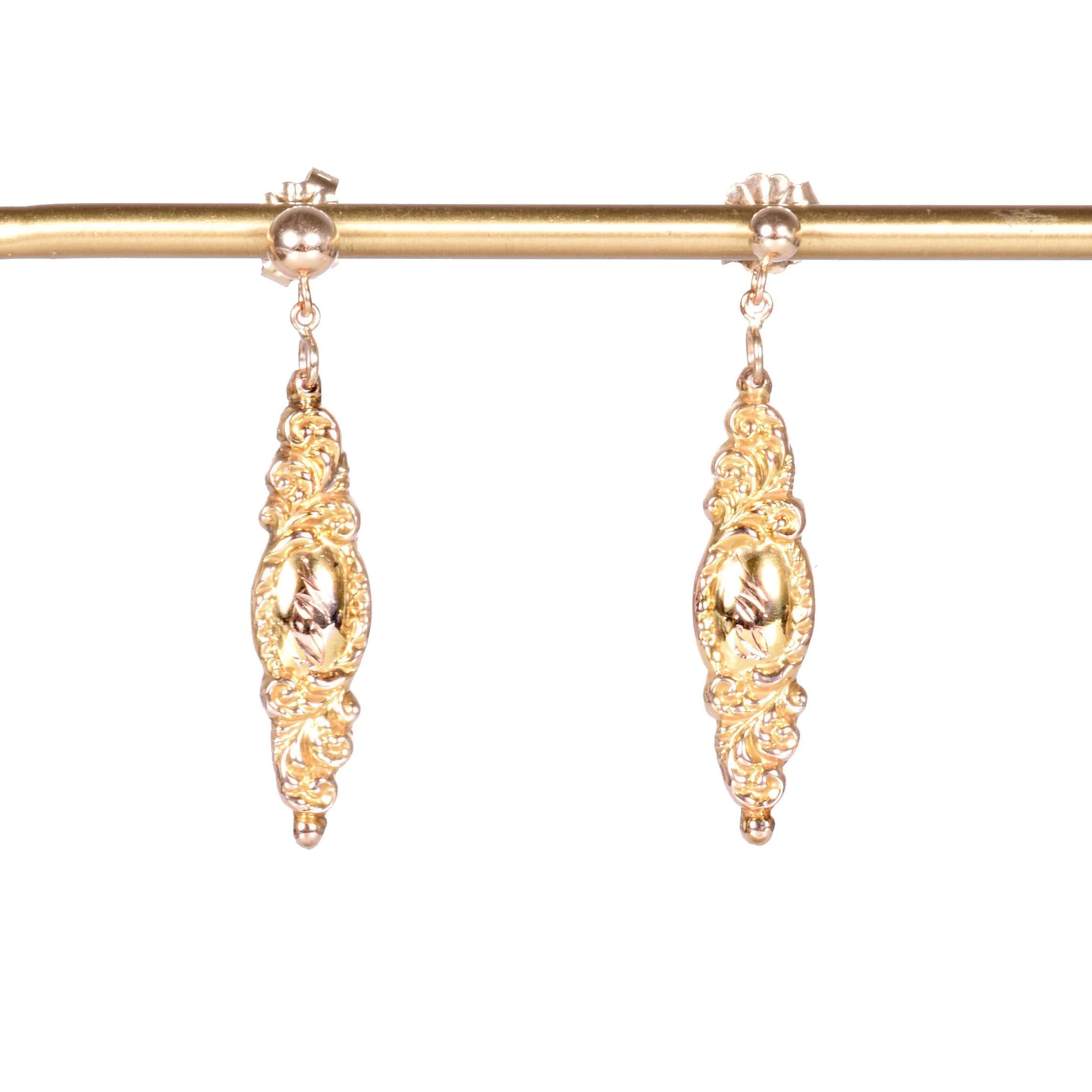 In our shop, we convert antique pieces into more wearable pieces for today's world. In this case, lingerie pins are no longer a necessity as in the Victorian times. Hence....earrings! And very unique ones at that. These dangling 14k beaming yellow gold beauties are defined by their curvy feminine lines and can be worn on the daily! Make them your one-of-a-kind antique treasure!