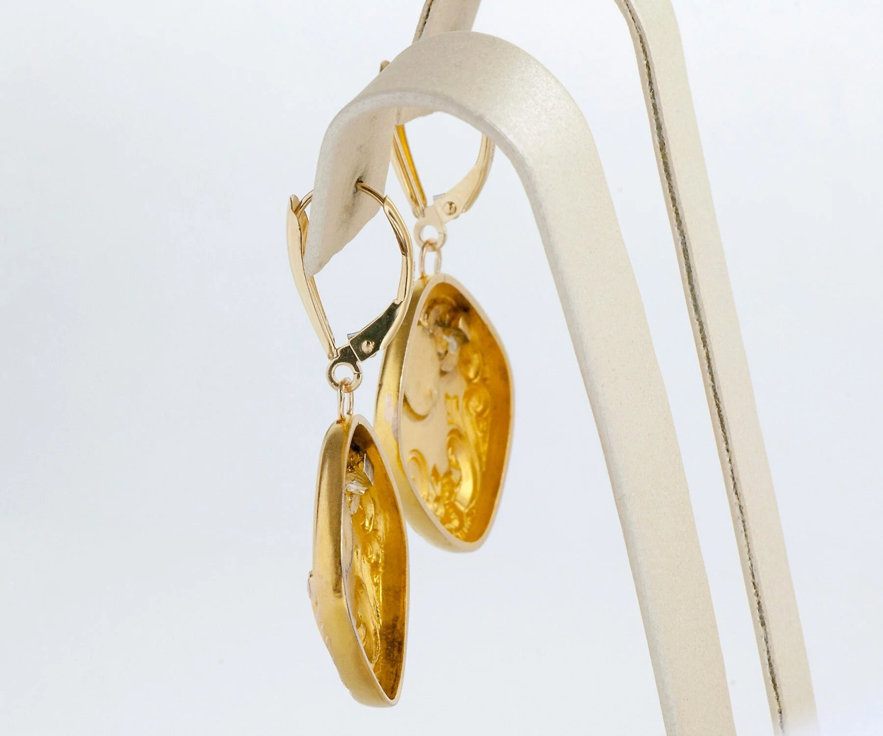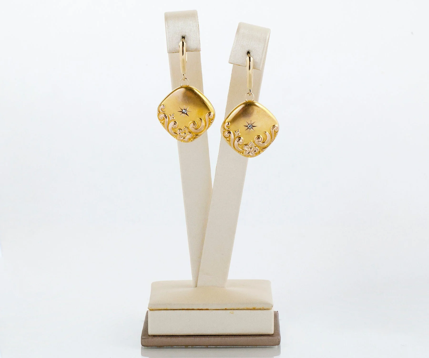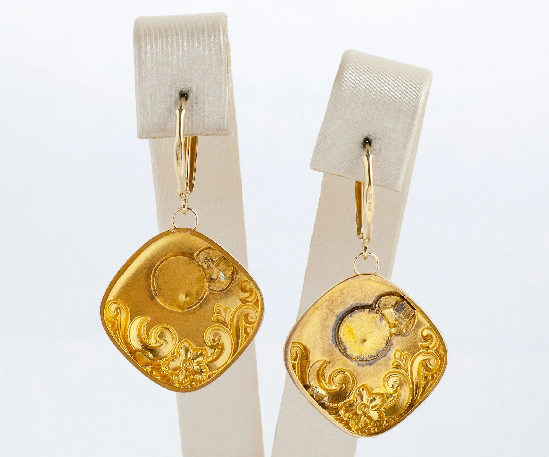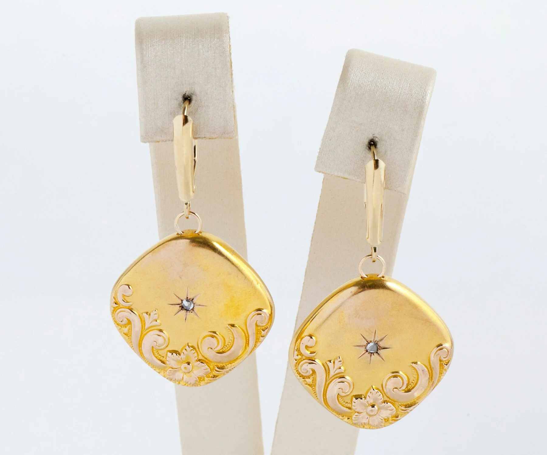 Very early 1900's cufflinks in their first life and now stunning dangling earrings! In beaming 14k yellow gold with a delightful floral motif and a sparkling rose cut diamond at the center, these gorgeous Victorian earrings will certainly make a nice statement! Perfect for the day of the wedding and everyday thereafter.