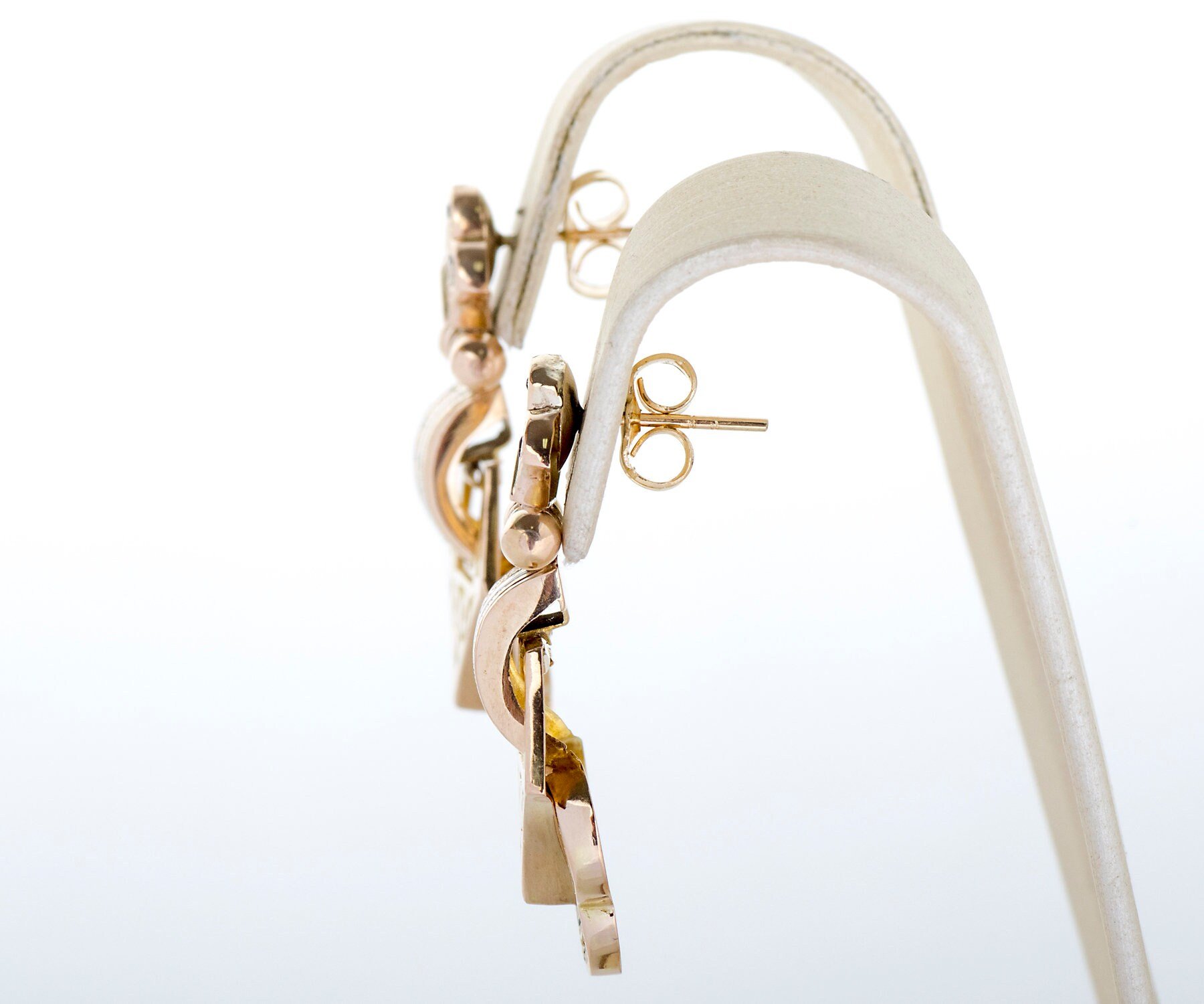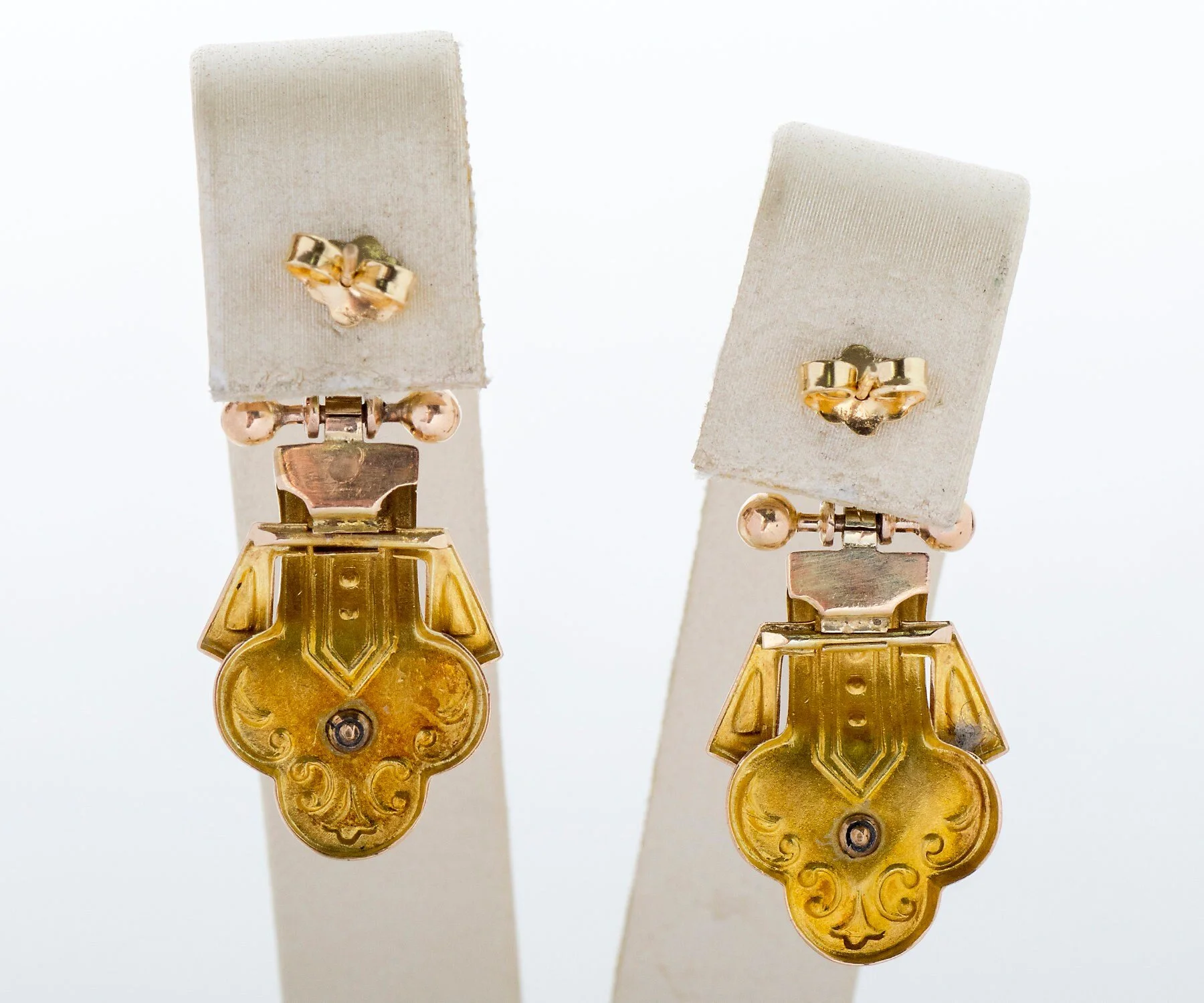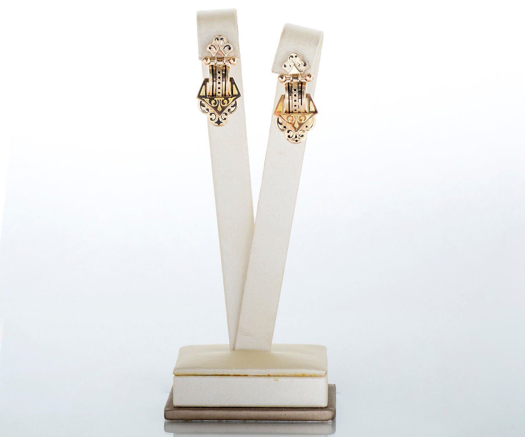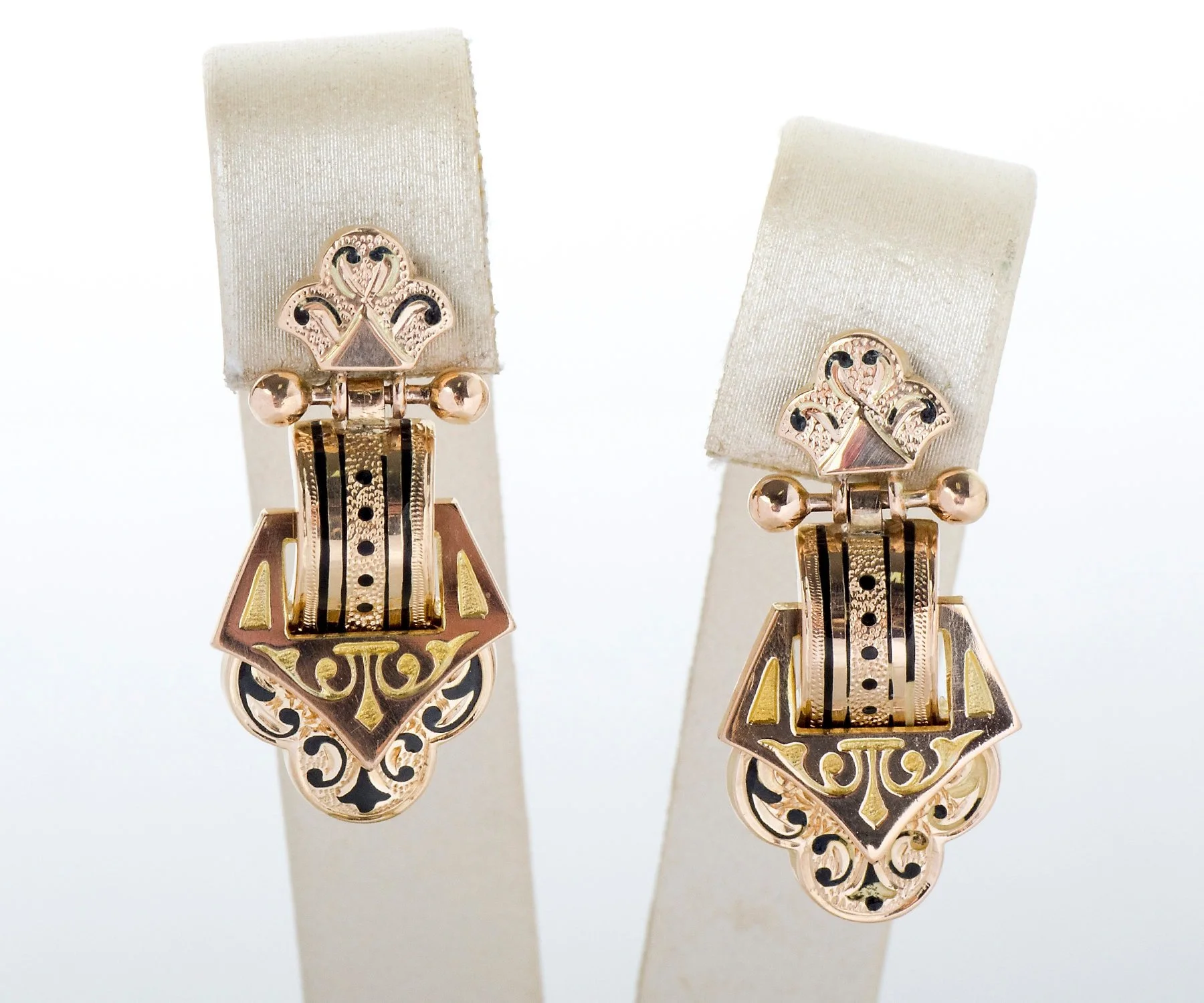 These dynamite Victorian earrings in a buckle design are simply to die for. So very eye-catching and we even have a necklace that matches! In bright 14 k yellow gold, with striking black enamel work.