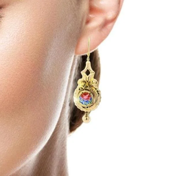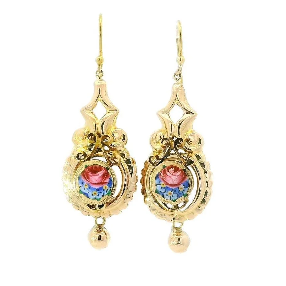 Do you love Roses? Then these beautifully unique antique 14k yellow gold dangle enamel earrings are for you! These are the most beautiful and feminine earrings with small painted roses and possible pansy flowers with enameling on the bottom. Also note the gorgeous bow atop the painted flowers. Delicate, feminine, but also a bit of a statement. Simply lovely!