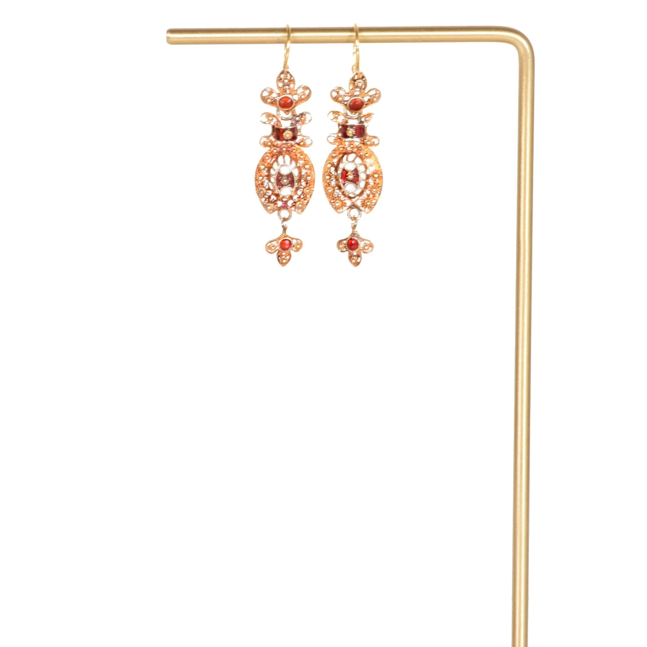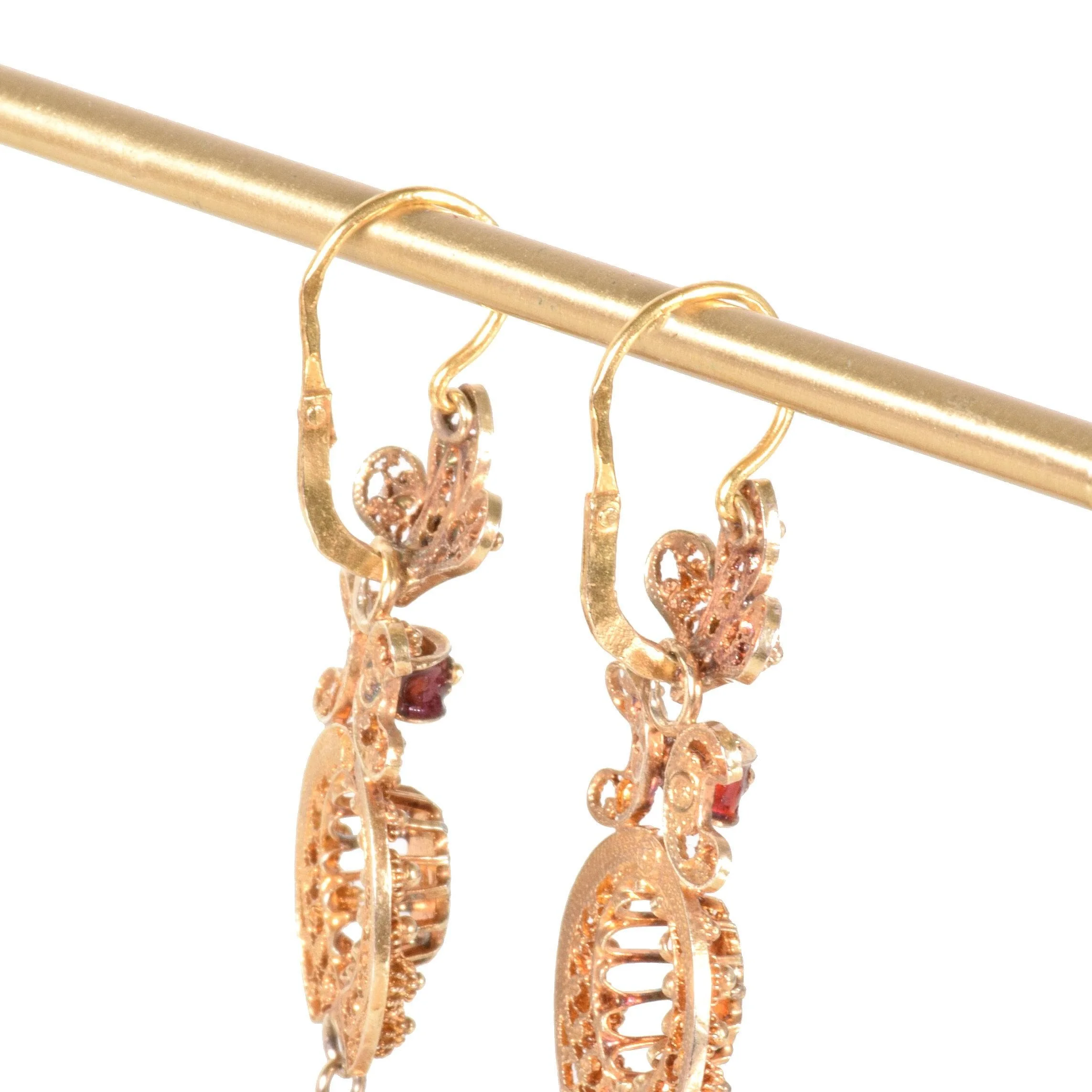 Spectacular are these dangling earrings from the Victorian era found in Portugal! Historically the Portuguese are well known for their incredible filigree work. In beaming 19k rose gold, adorned with red and white enamel work. Coming to us from so, so long ago....can you even imagine the life this pair of earrings have seen?