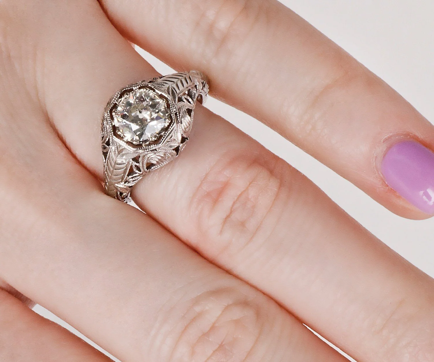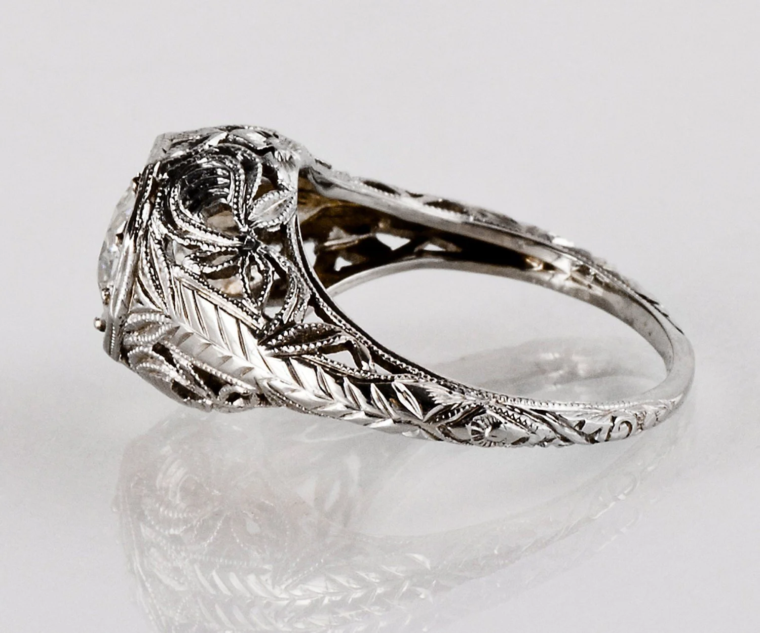 An amazing example of finely crafted intricate filigree! This is an Edwardian Era 18k White Gold diamond ring with a European cut diamond in the center. This captivating ring is a delight for the eyes!