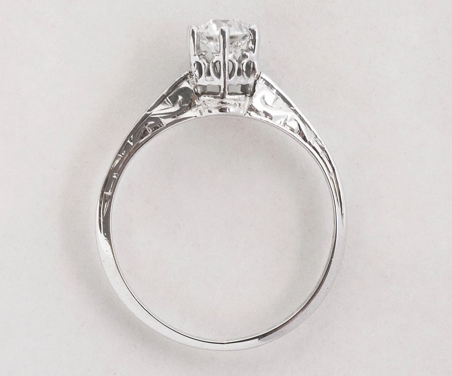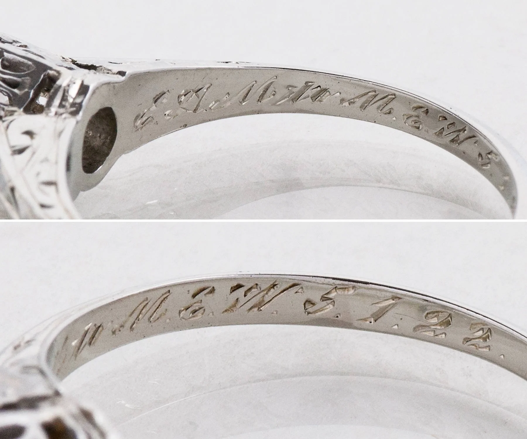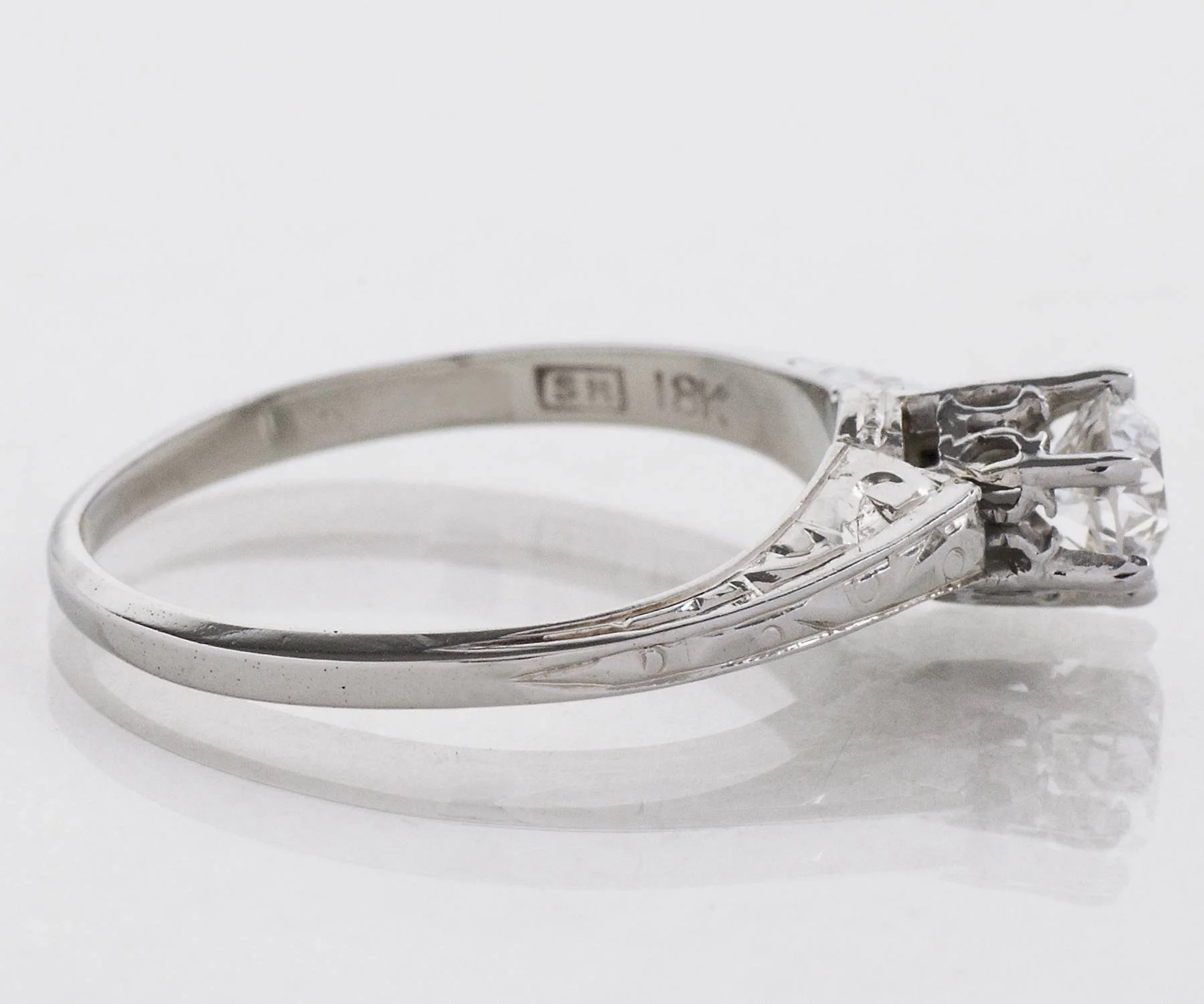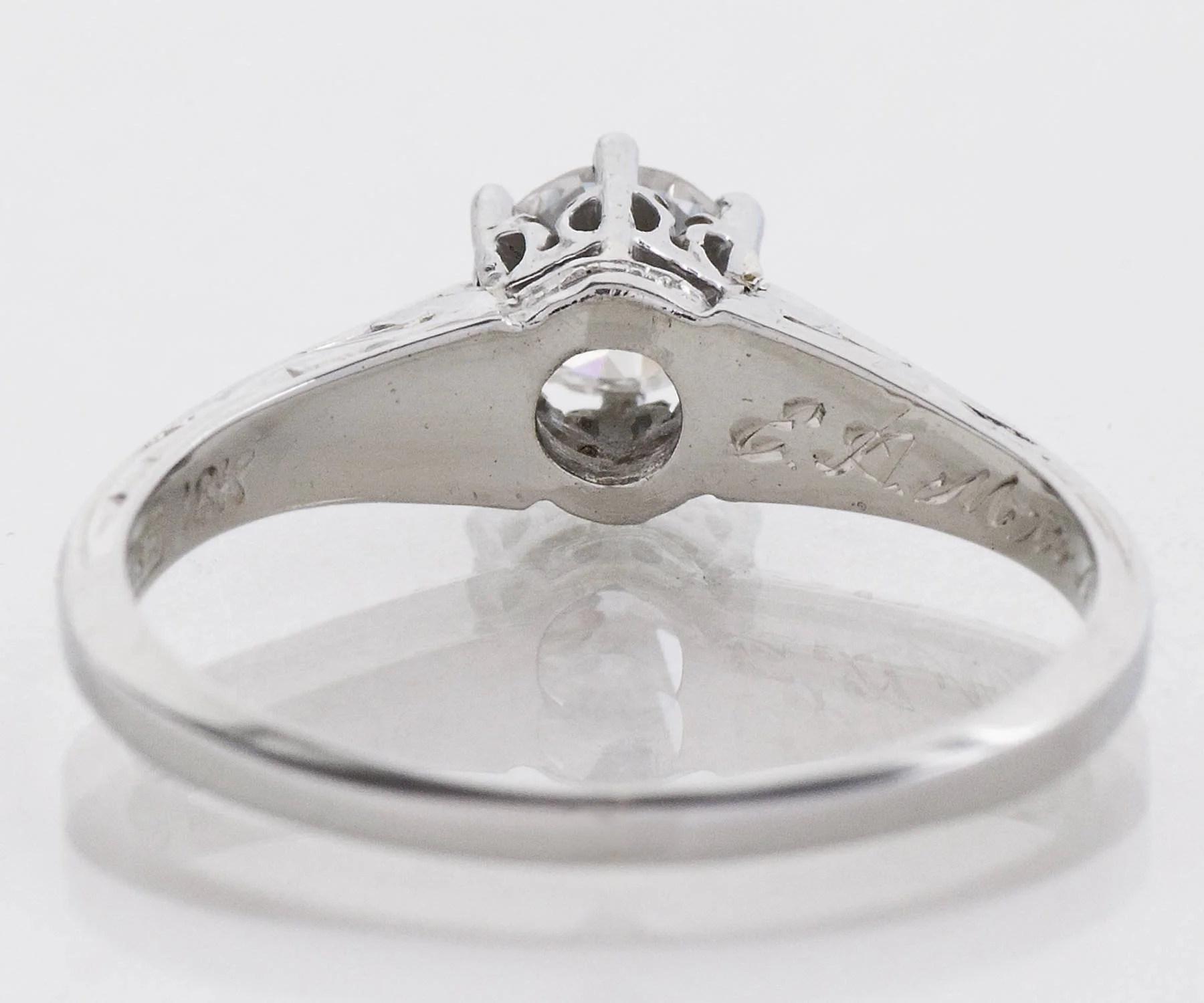 Antique Engagement Ring - Antique 18k White Gold Engraved "1922" Diamond Solitaire Engagement Ring 18k White Gold Engraved "E.A.M. to M.E.W. 5.1.22" European Cut Diamond =.40ct VS1/F Ring Size 5.5 (ring is sizable) Ring measures approximately 5.5mm at center, back of band is 1.5mm wide.
