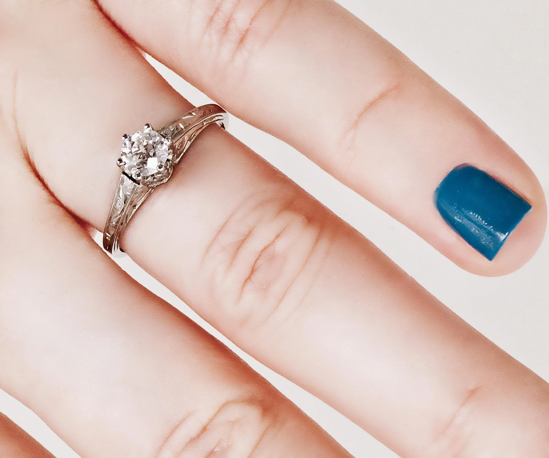 The solitaire diamond engagement ring is a classic style that has been around for many years. Two things make this one very special. First, it is engraved with initials of the couple and the date. Second, this ring houses within 6 high polished prongs a spectacular European cut diamond. We at our shop absolutely love seeing engraving inside of our rings...it allows us to dream of a wonderful romance of long ago!