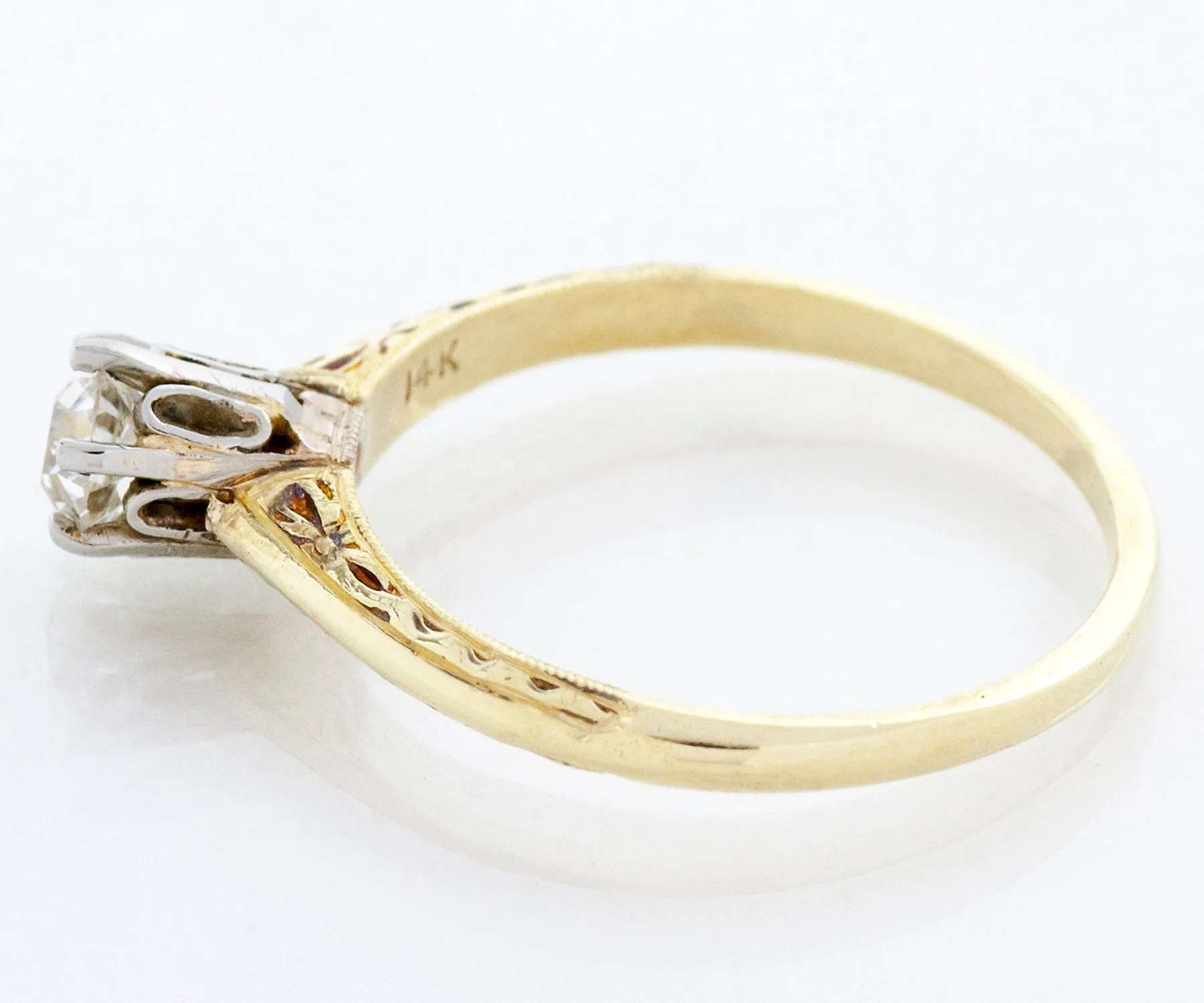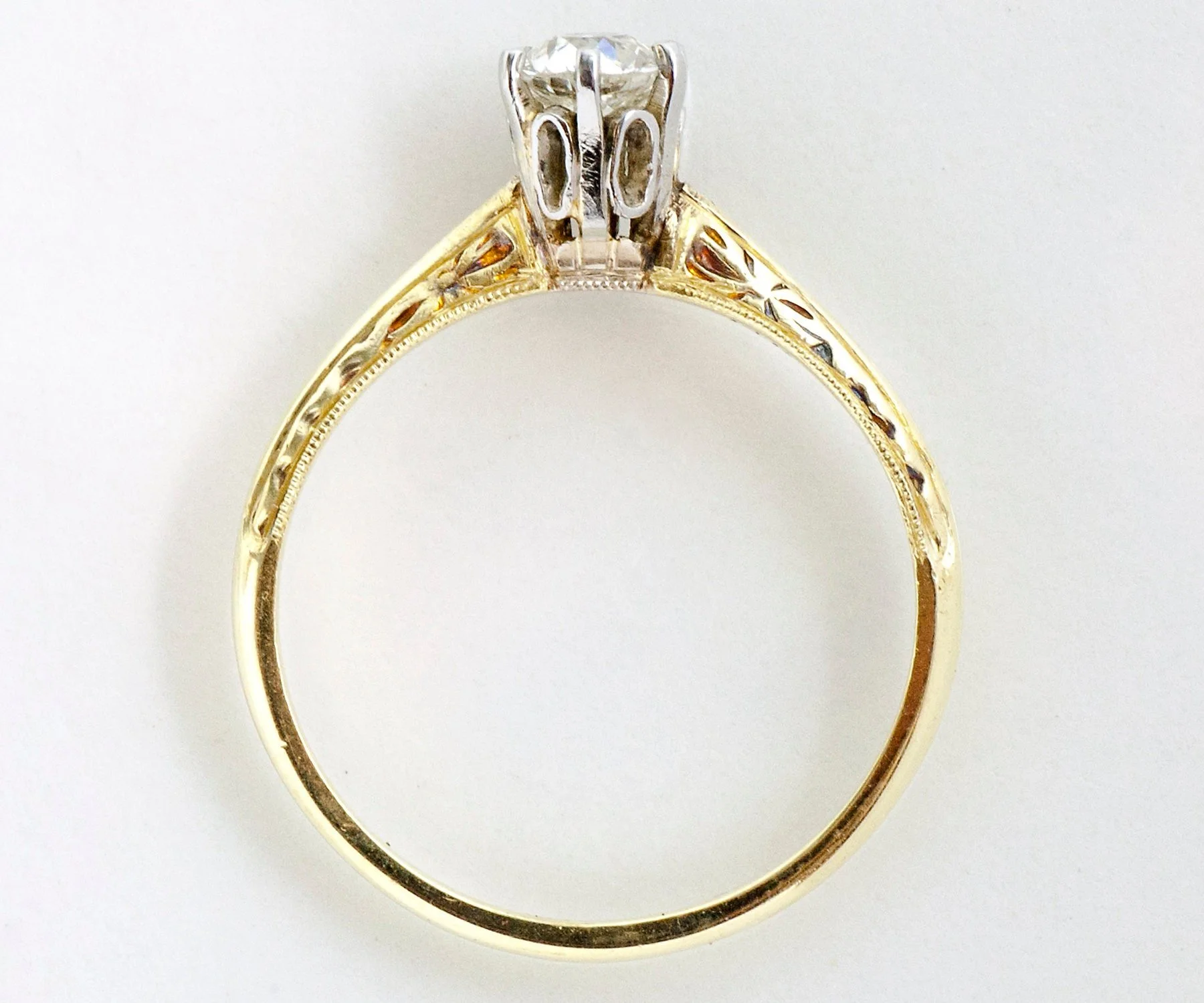 Antique Engagement Ring - Antique 14k Two-Tone Diamond Solitaire Engagement Ring 14k Yellow & White Gold European Cut Diamond =.35ct VS1/G Ring Size 6 (ring is sizable) Ring measures approximately 5.3mm at center, back of band is 1.4mm wide.