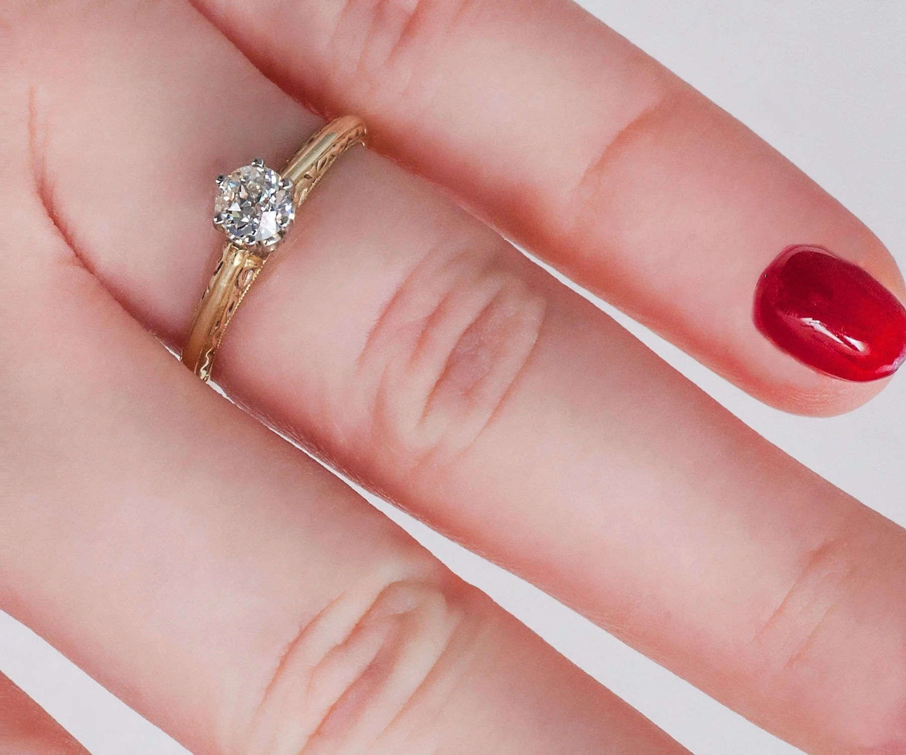 Some girls just love the simplicity and the classic feel of a diamond solitaire engagement ring. This one from the very early 1900's garners some extra interest due to it being crafted in two-tone 14 k gold, and the lovely open work design featured on the ring's shank. A gorgeous European cut diamond sits front and center. Any wedding band of any era will look amazing with this beauty.