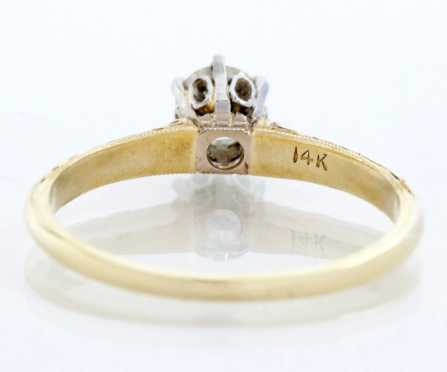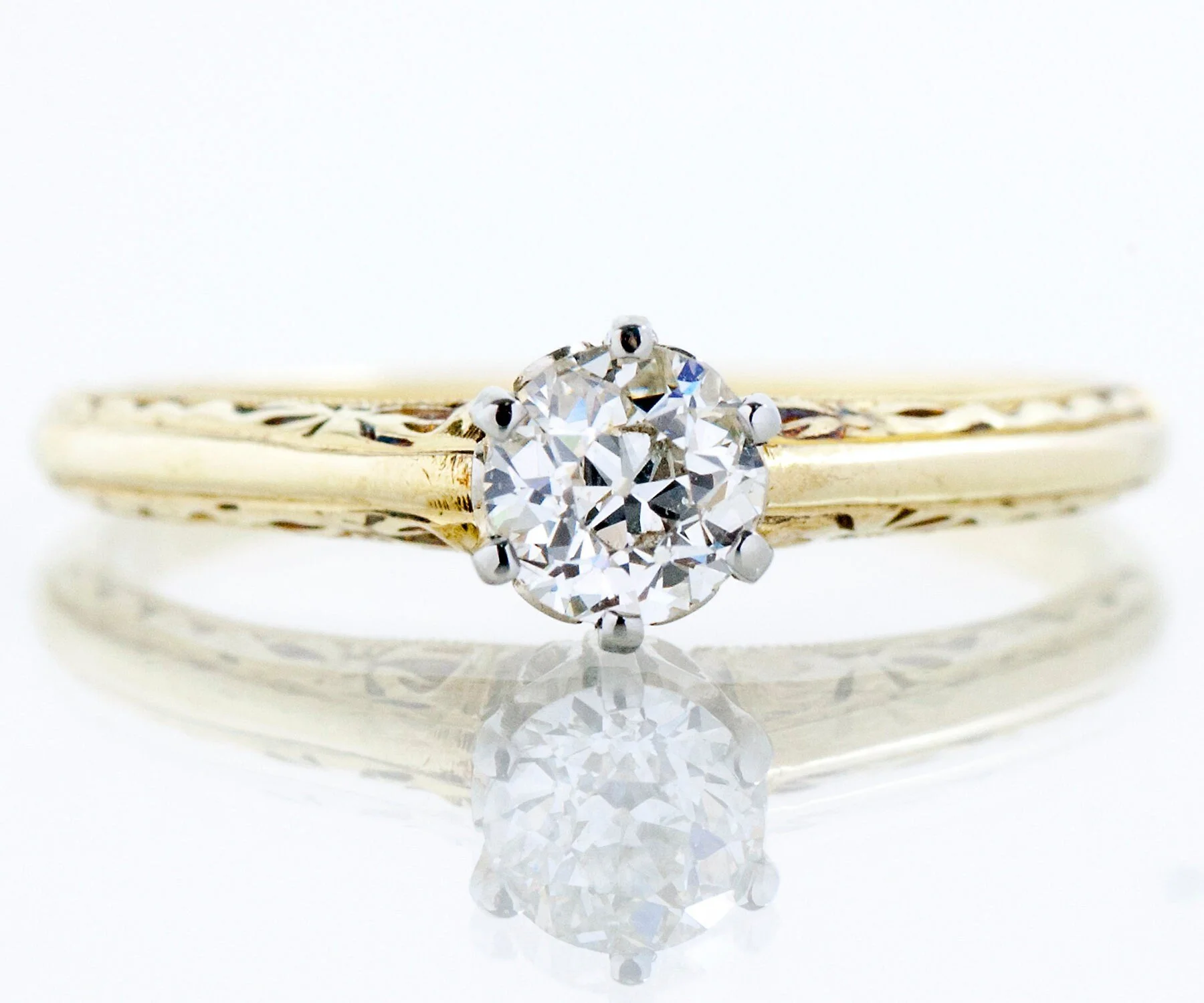 Antique Engagement Ring - Antique 14k Two-Tone Diamond Solitaire Engagement Ring 14k Yellow & White Gold European Cut Diamond =.35ct VS1/G Ring Size 6 (ring is sizable) Ring measures approximately 5.3mm at center, back of band is 1.4mm wide.