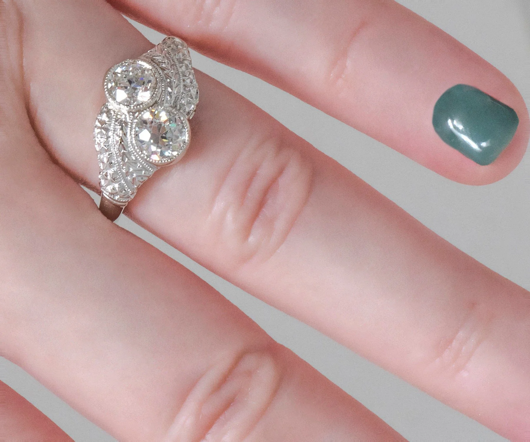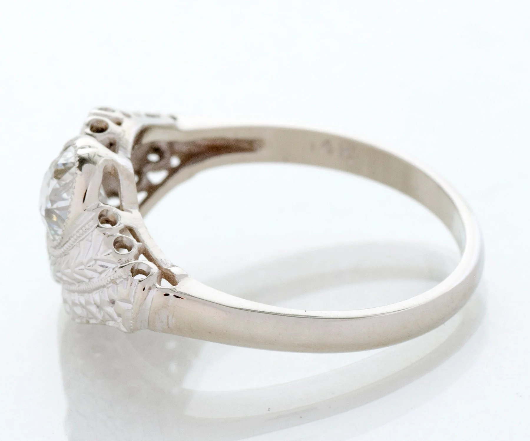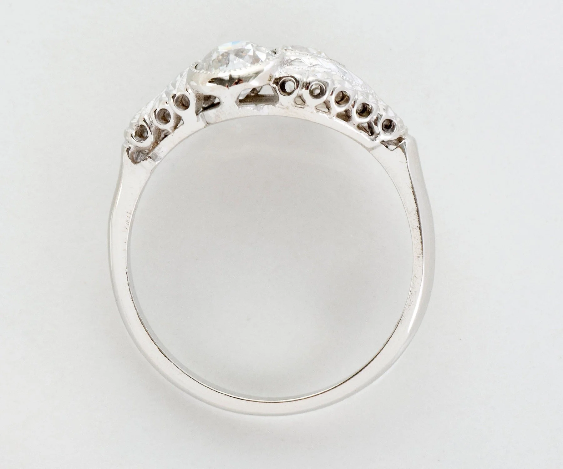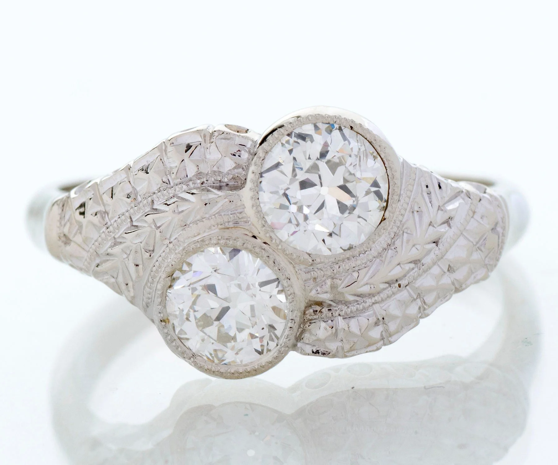 Ah the romance of the toi-et-moi! Or in English..."you and me". This Art Deco design period 14k white gold beauty houses two stunning European cut diamonds totaling over 1.12 carats. Engraved on this ring is the popular wheat pattern, the wheat pattern was thought to signify a few things including a bountiful harvest, a connection to the natural world and fertility! Who doesn't want all that?!