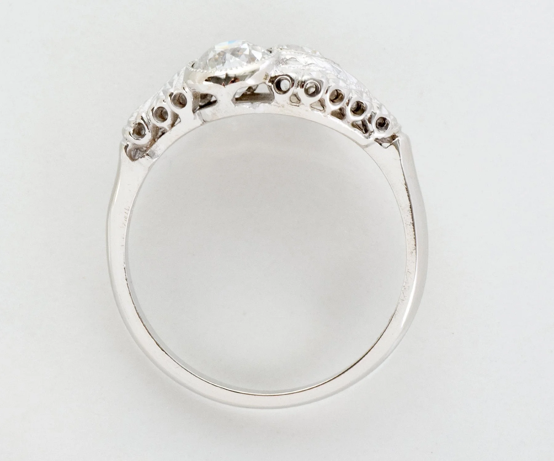 Ah the romance of the toi-et-moi! Or in English..."you and me". This Art Deco design period 14k white gold beauty houses two stunning European cut diamonds totaling over 1.12 carats. Engraved on this ring is the popular wheat pattern, the wheat pattern was thought to signify a few things including a bountiful harvest, a connection to the natural world and fertility! Who doesn't want all that?!