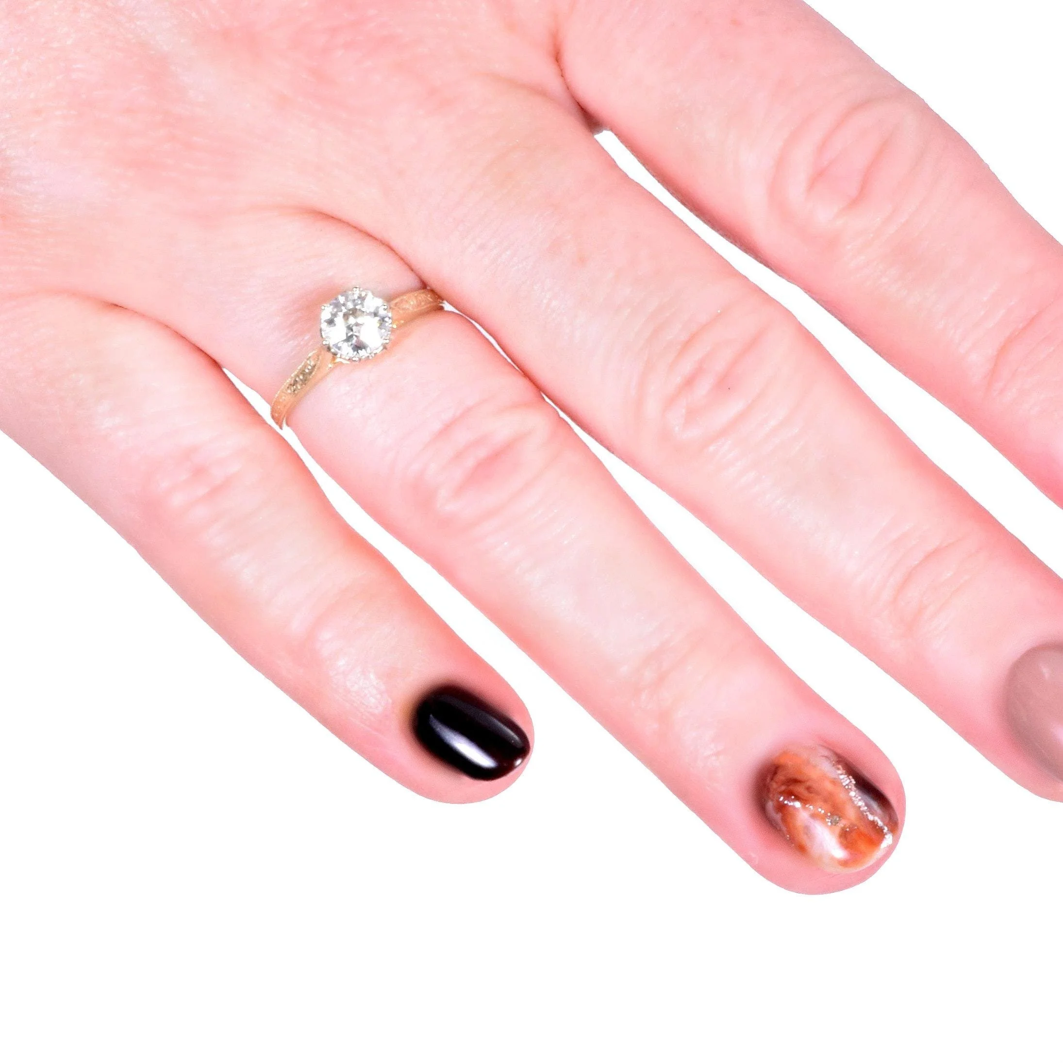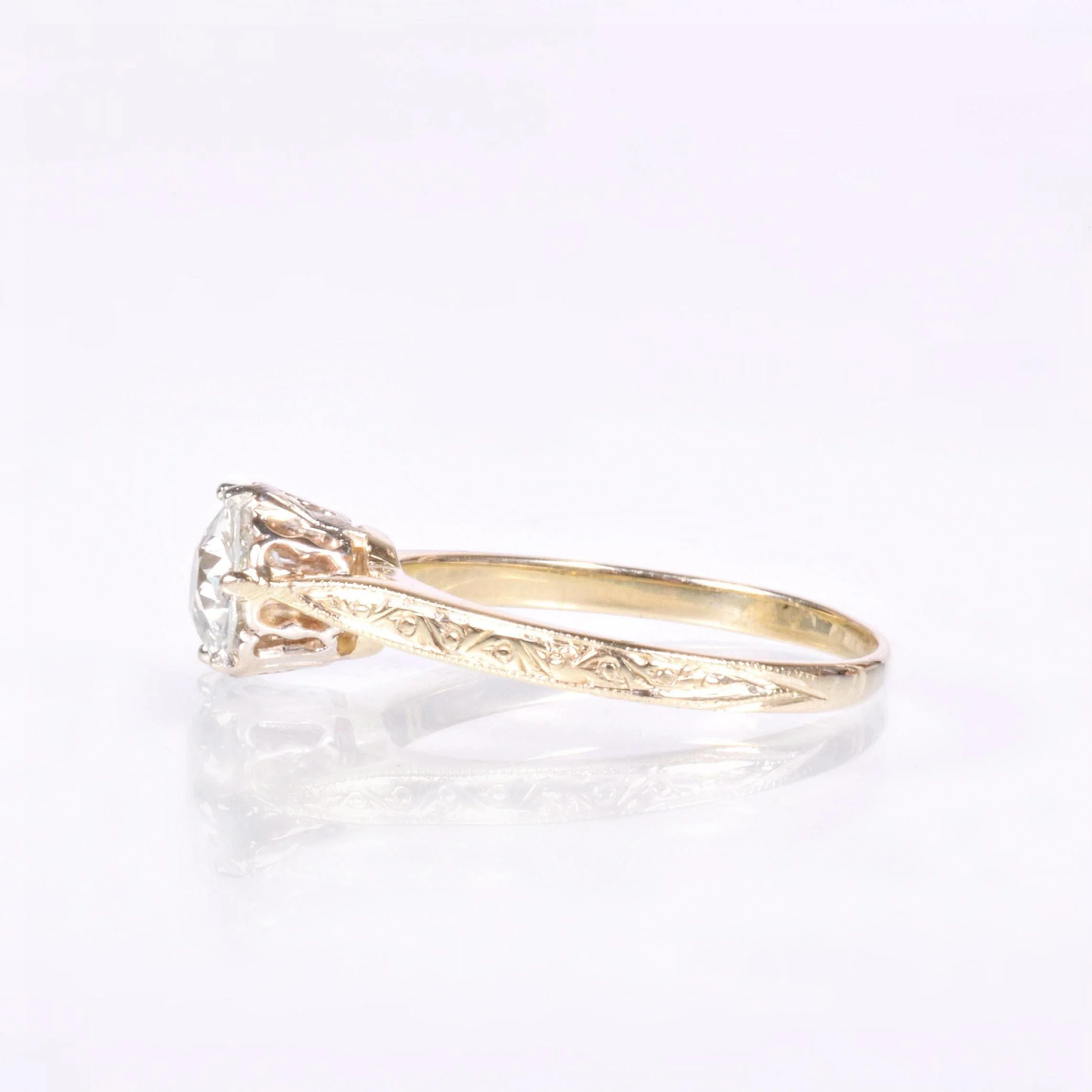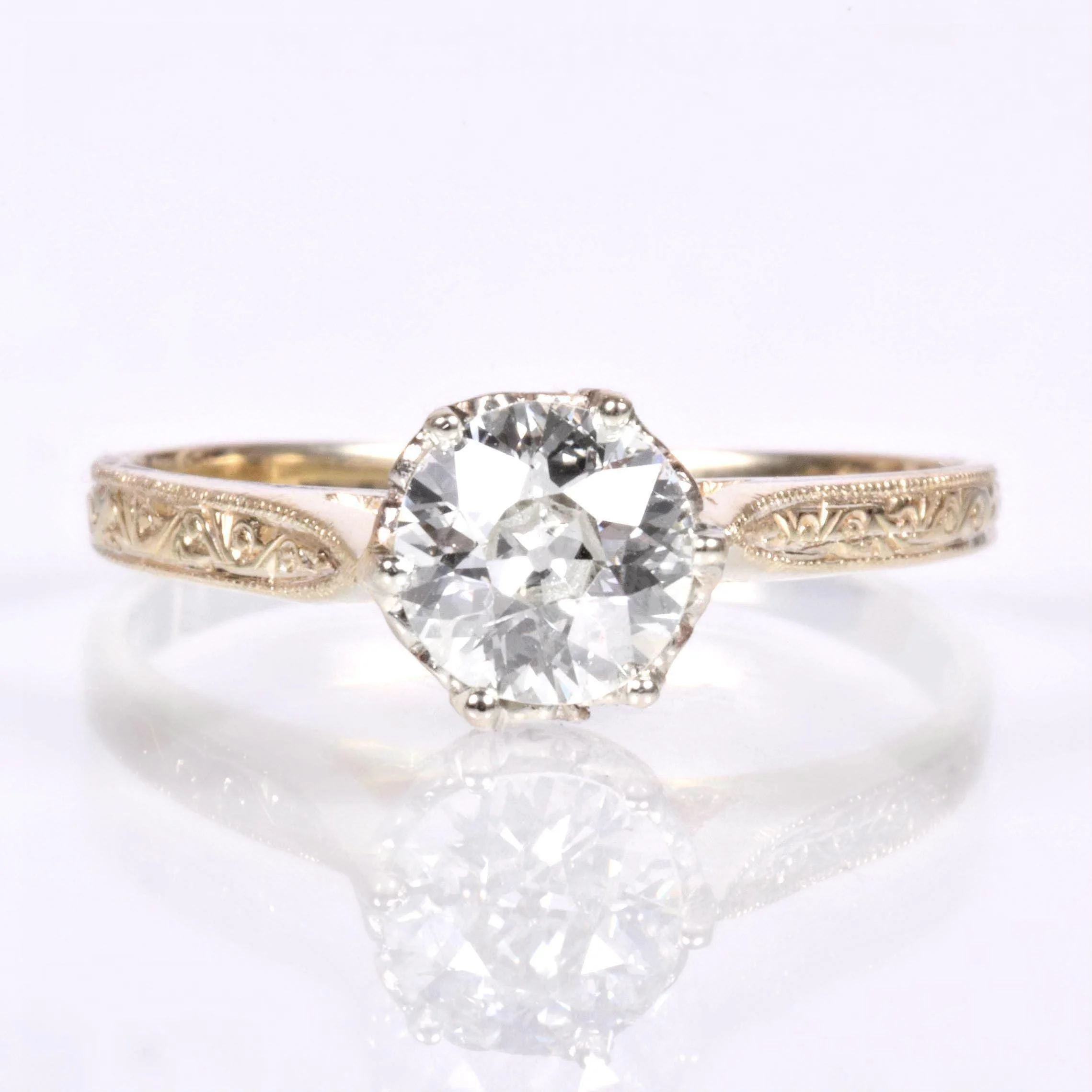 Bold and lively is this antique diamond solitaire ring! Classic in design, this ring will never get "old". Crafted in beaming 14k yellow gold with still very crisp decorative engraving and milgrain, this ring has held its age quite well! A gorgeous European cut diamond highlights the center of this treasure and the ring will pair very well with a wedding band be it antique or modern.