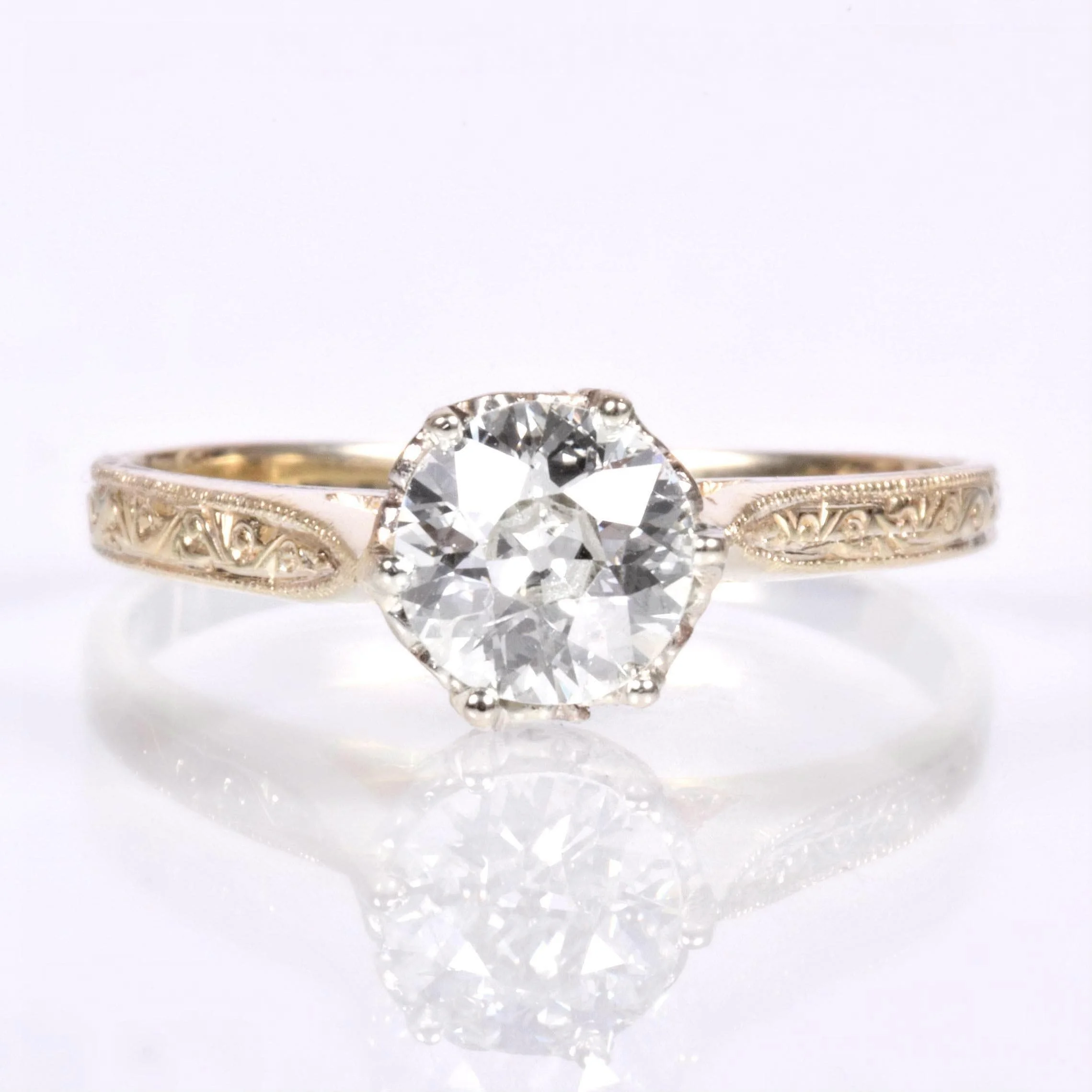 Bold and lively is this antique diamond solitaire ring! Classic in design, this ring will never get "old". Crafted in beaming 14k yellow gold with still very crisp decorative engraving and milgrain, this ring has held its age quite well! A gorgeous European cut diamond highlights the center of this treasure and the ring will pair very well with a wedding band be it antique or modern.