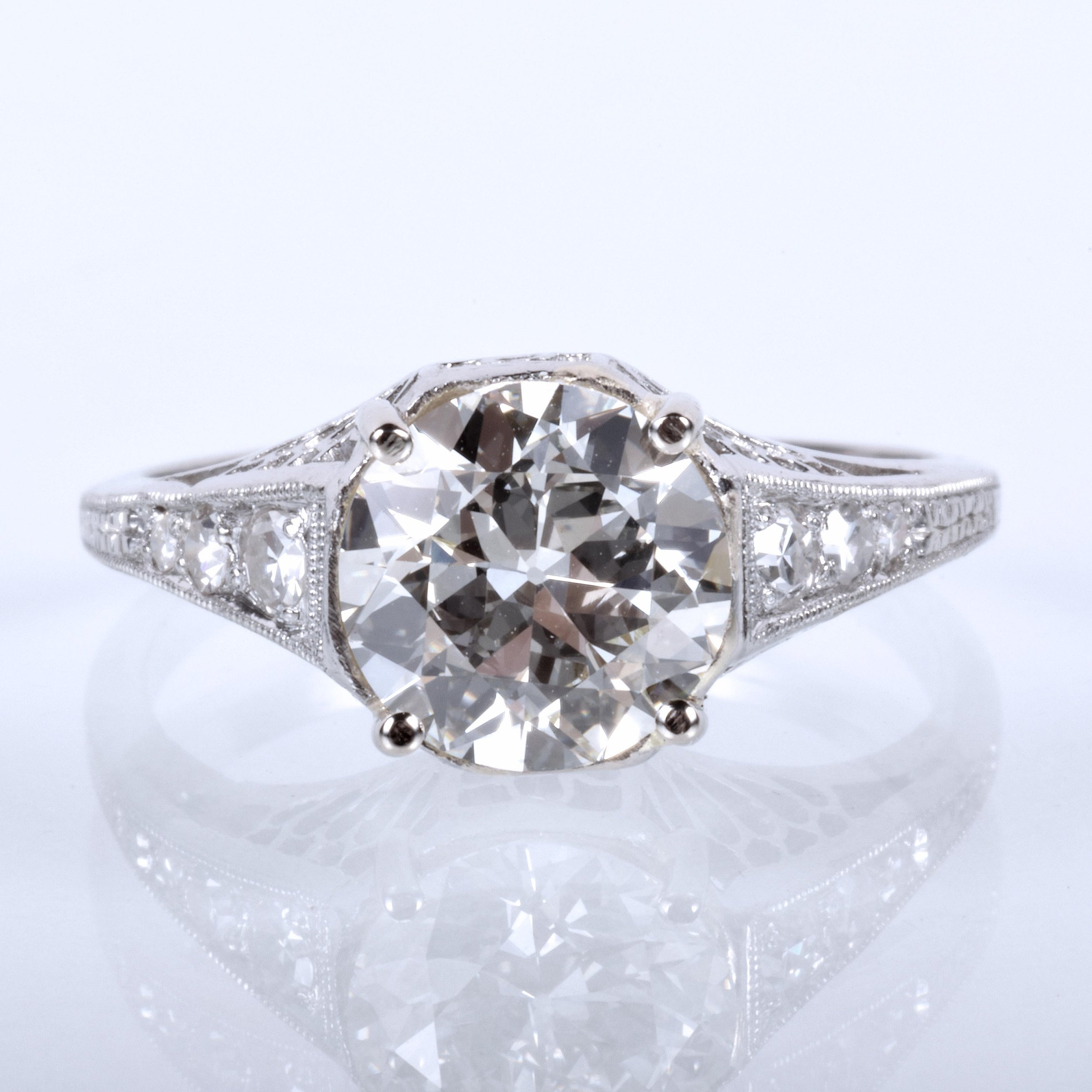 Can you say GORGEOUS? Upon gazing at this 18k white gold engagement ring, you only see diamonds, an you know what they say about diamonds! The center is a European cut diamond at 1.38 cts, and it is showcased by a row of sparkling diamonds on either side. We can help you pair this raving beauty with a equally amazing antique wedding band from our vast collection.