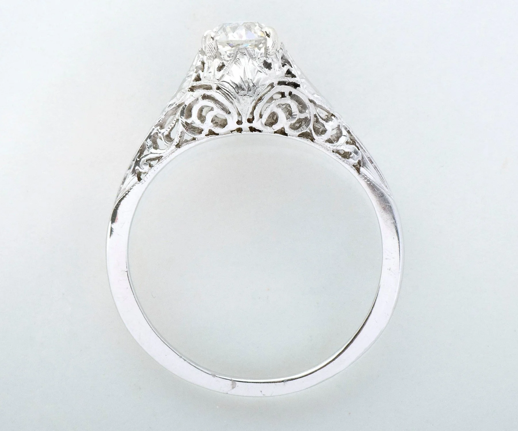 Delicate, scrolling open work is featured in this charming antique diamond engagement ring. From the 1920's and crafted in beaming 18k white gold. A stunning European cut diamond peeks out from the center. Make this beauty the one you propose with.
