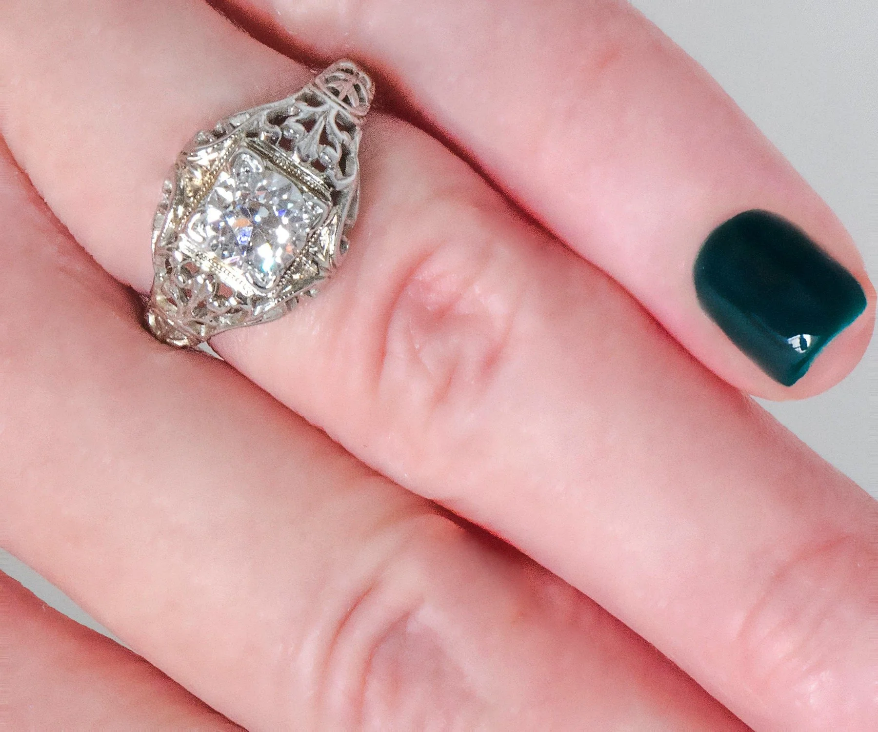This antique ring from 1935 precisely, is quite the looker. It can stand alone, no problem...on either hand, but certainly no one would turn this one away as her engagement ring! The engraving inside of this treasure of a ring is still very visible, which we love to see in our shop. Crafted by hand, in bright 18k white gold, a glorious 3/4 carat European cut diamond is undoubtedly the star of the show, however the setting is magnificent!