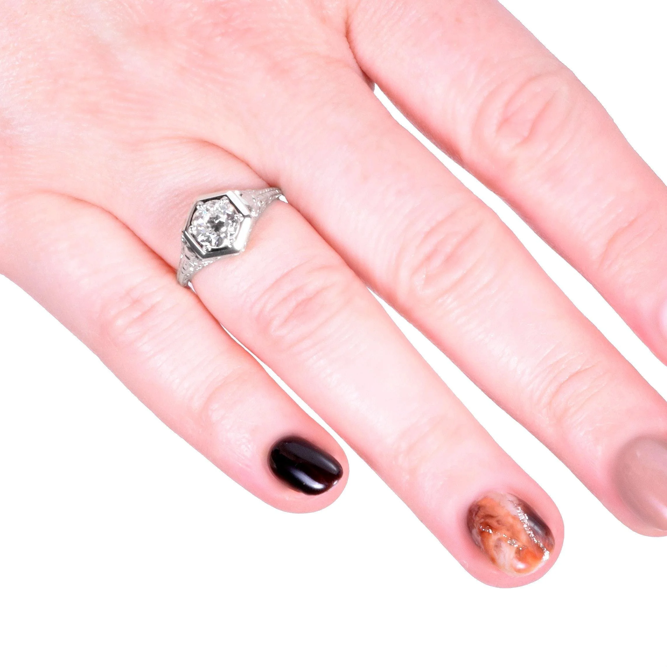 Showstopper alert! This early 1900's 18k white gold diamond engagement ring is sure to turn heads. An old European cut diamond of 1 carat resides happily within 6 prongs and a 6 sided high polished framework. Among the glorious details are floral and leafy cutouts as well as the coveted and popular for the time period engraved wheat pattern. The wheat pattern was thought to signify a few things including a bountiful harvest, a connection to the natural world and fertility! Who doesn't want all that?!