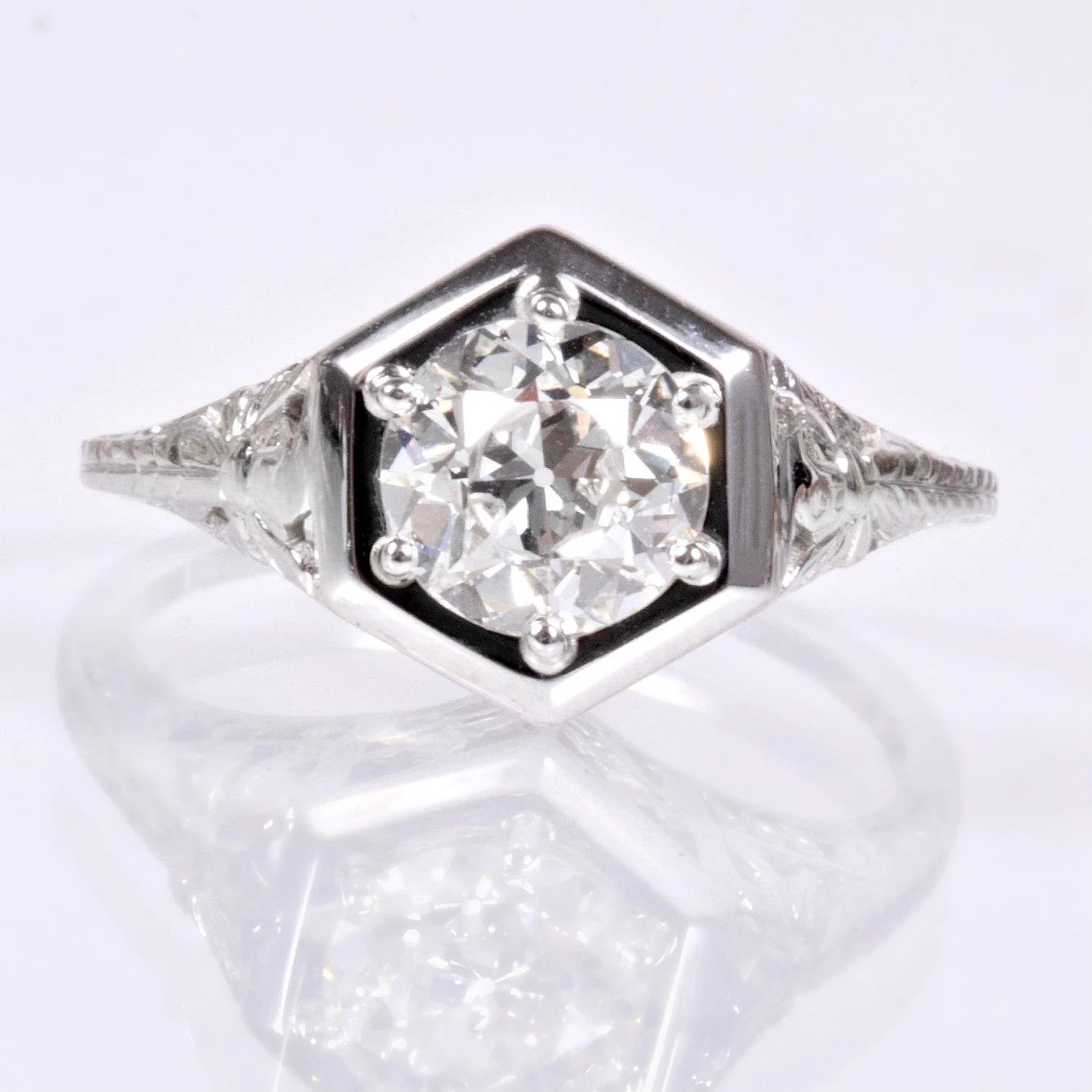 Showstopper alert! This early 1900's 18k white gold diamond engagement ring is sure to turn heads. An old European cut diamond of 1 carat resides happily within 6 prongs and a 6 sided high polished framework. Among the glorious details are floral and leafy cutouts as well as the coveted and popular for the time period engraved wheat pattern. The wheat pattern was thought to signify a few things including a bountiful harvest, a connection to the natural world and fertility! Who doesn't want all that?!