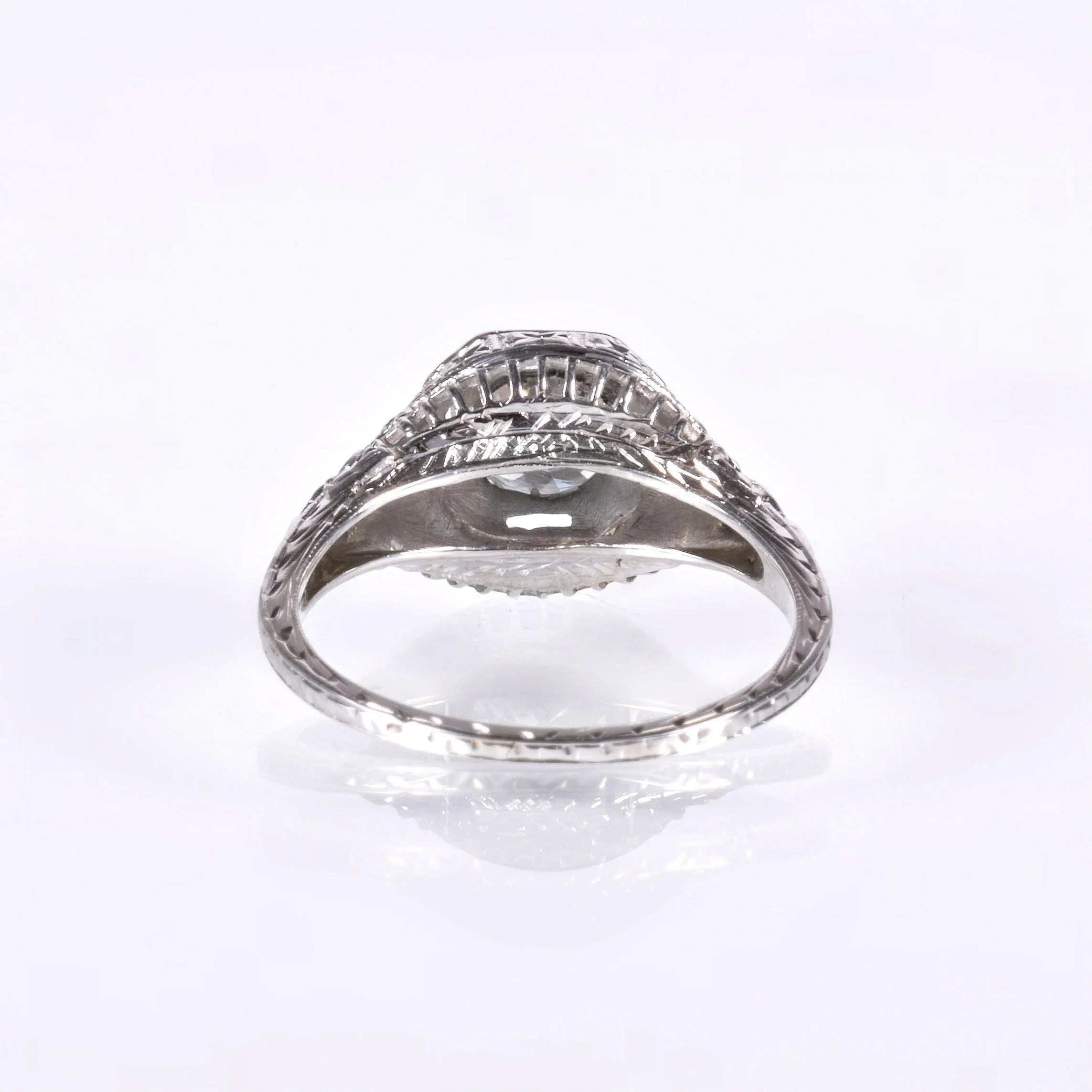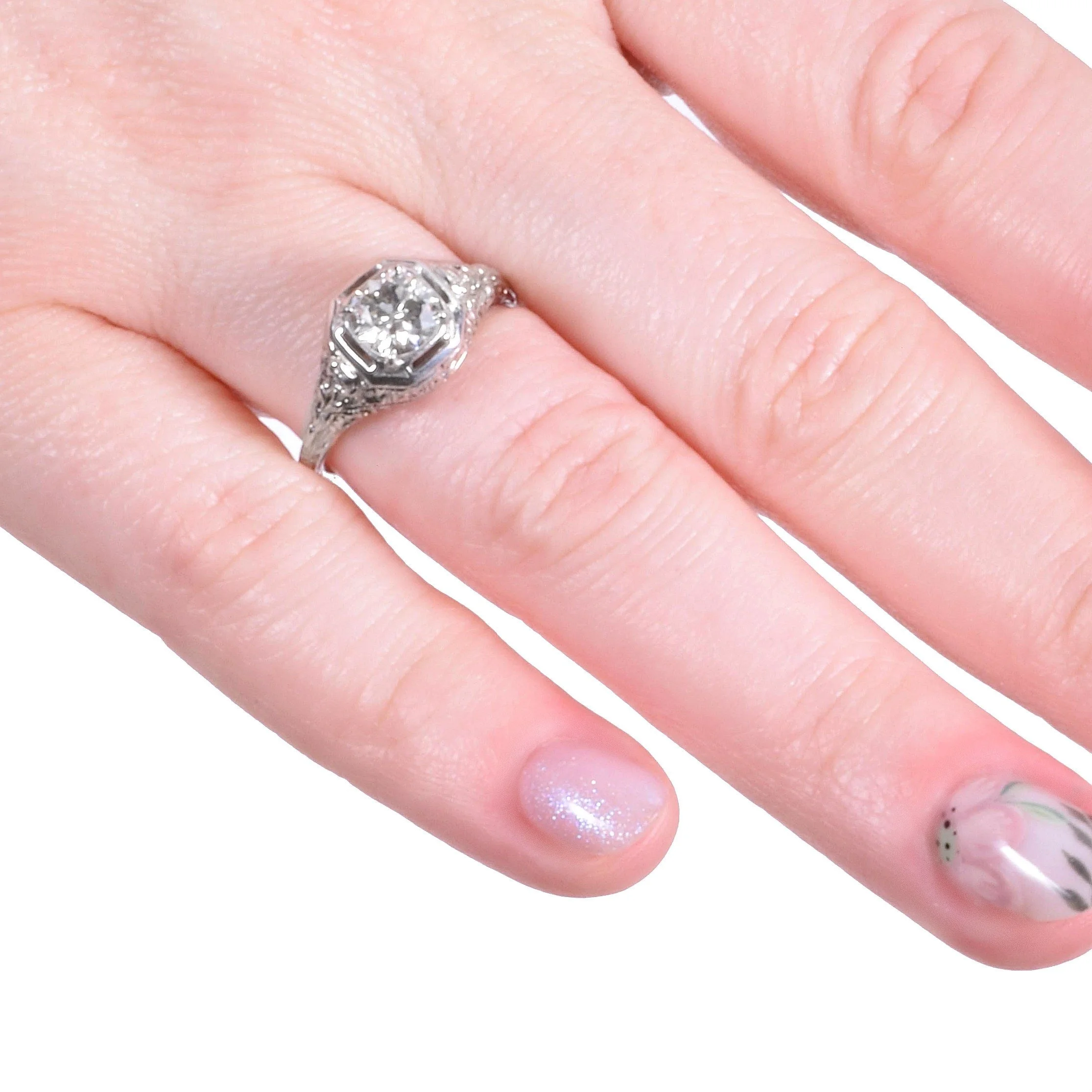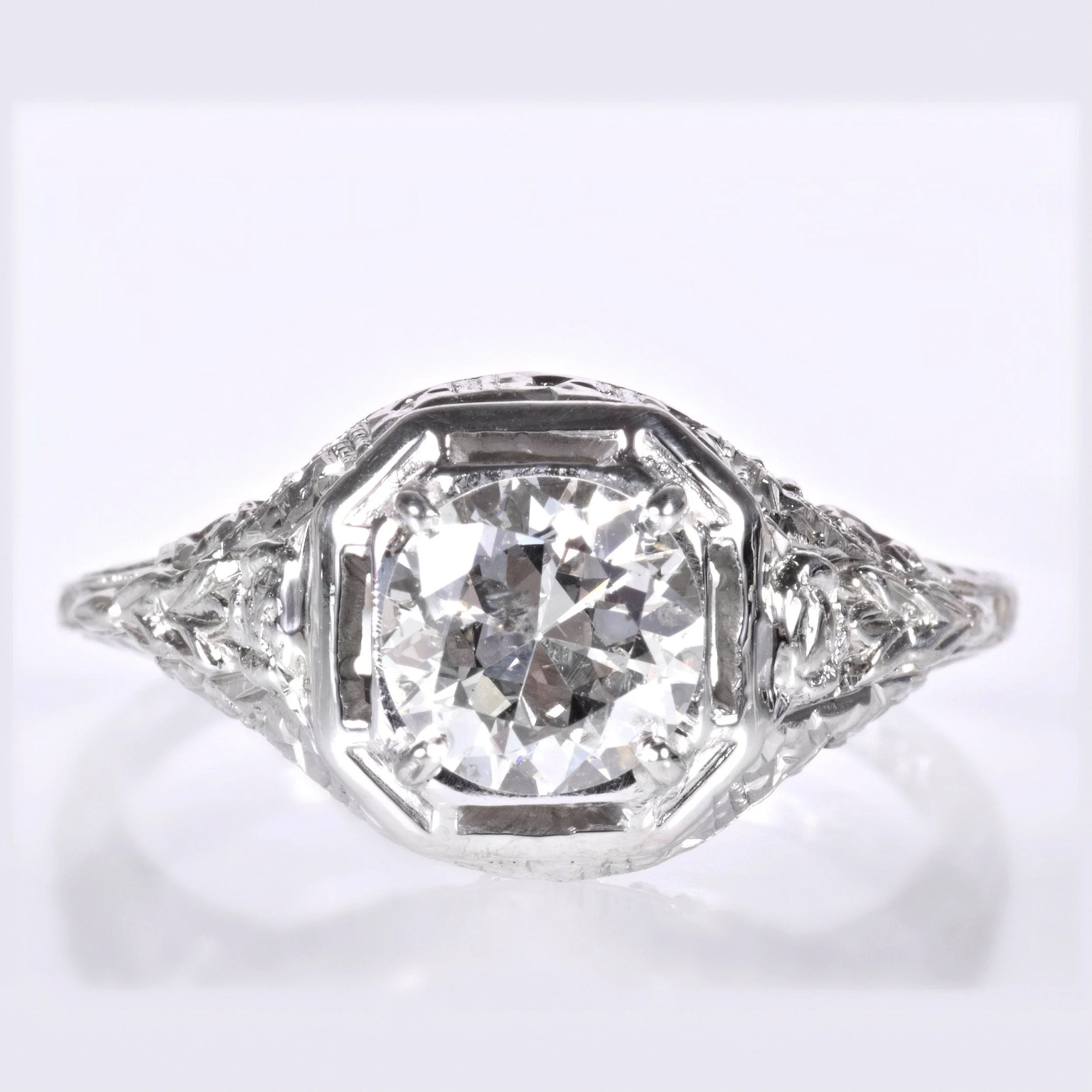 It's all in the details, are we right? Just gazing at our photos will draw you in to each and every one of those special details that make this lovely antique diamond engagement ring as unique as it is. At over 100 years old, she doesn't show her age! This highly decorative ring was crafted in beaming 18k white gold with crisp nature motif engraving, an octagonal framework, delicate wirework and more. The engraving is displayed all the way around the ring shank. This glorious setting is the perfect showcase for an exceptional European cut diamond at .89 carats. Make it yours!