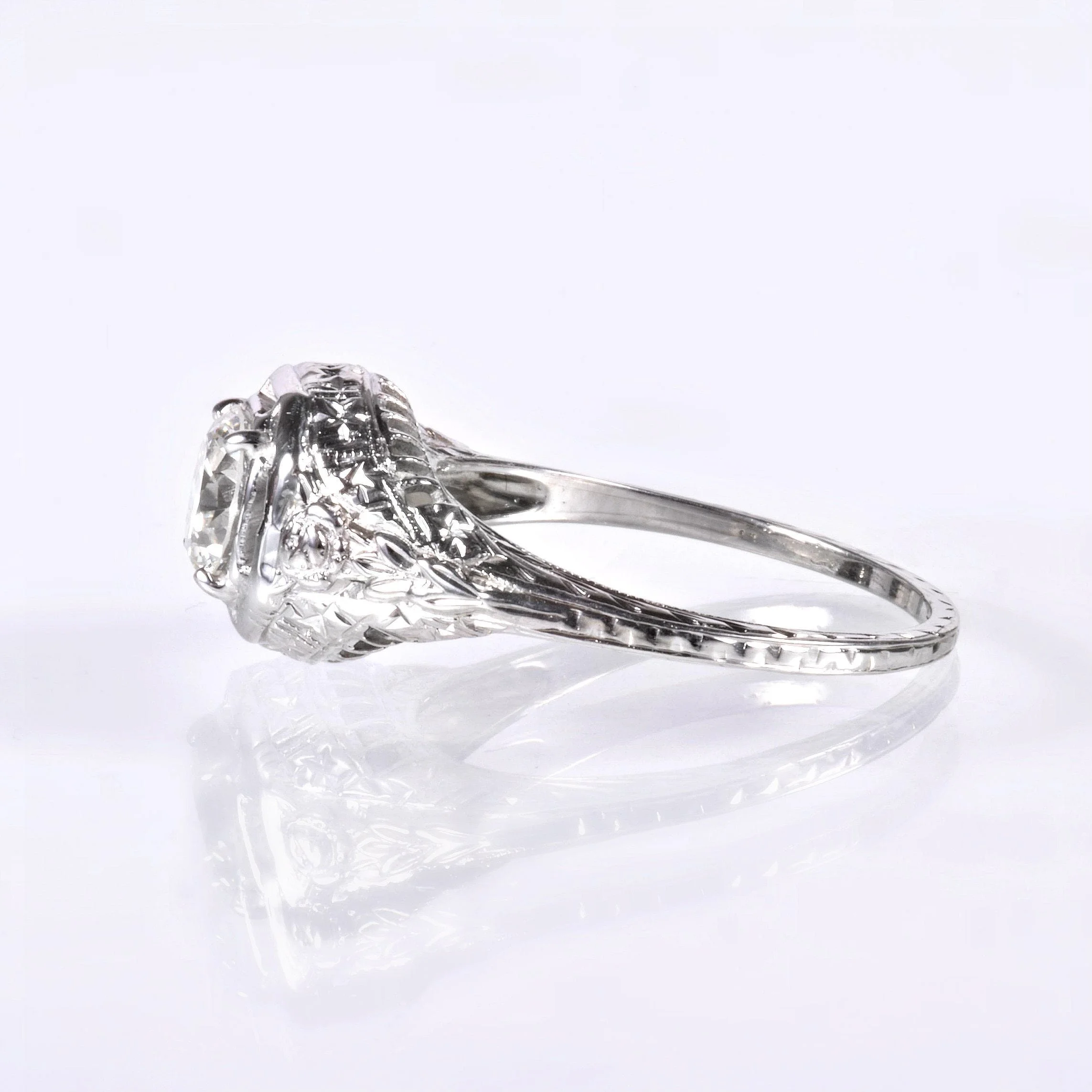 It's all in the details, are we right? Just gazing at our photos will draw you in to each and every one of those special details that make this lovely antique diamond engagement ring as unique as it is. At over 100 years old, she doesn't show her age! This highly decorative ring was crafted in beaming 18k white gold with crisp nature motif engraving, an octagonal framework, delicate wirework and more. The engraving is displayed all the way around the ring shank. This glorious setting is the perfect showcase for an exceptional European cut diamond at .89 carats. Make it yours!