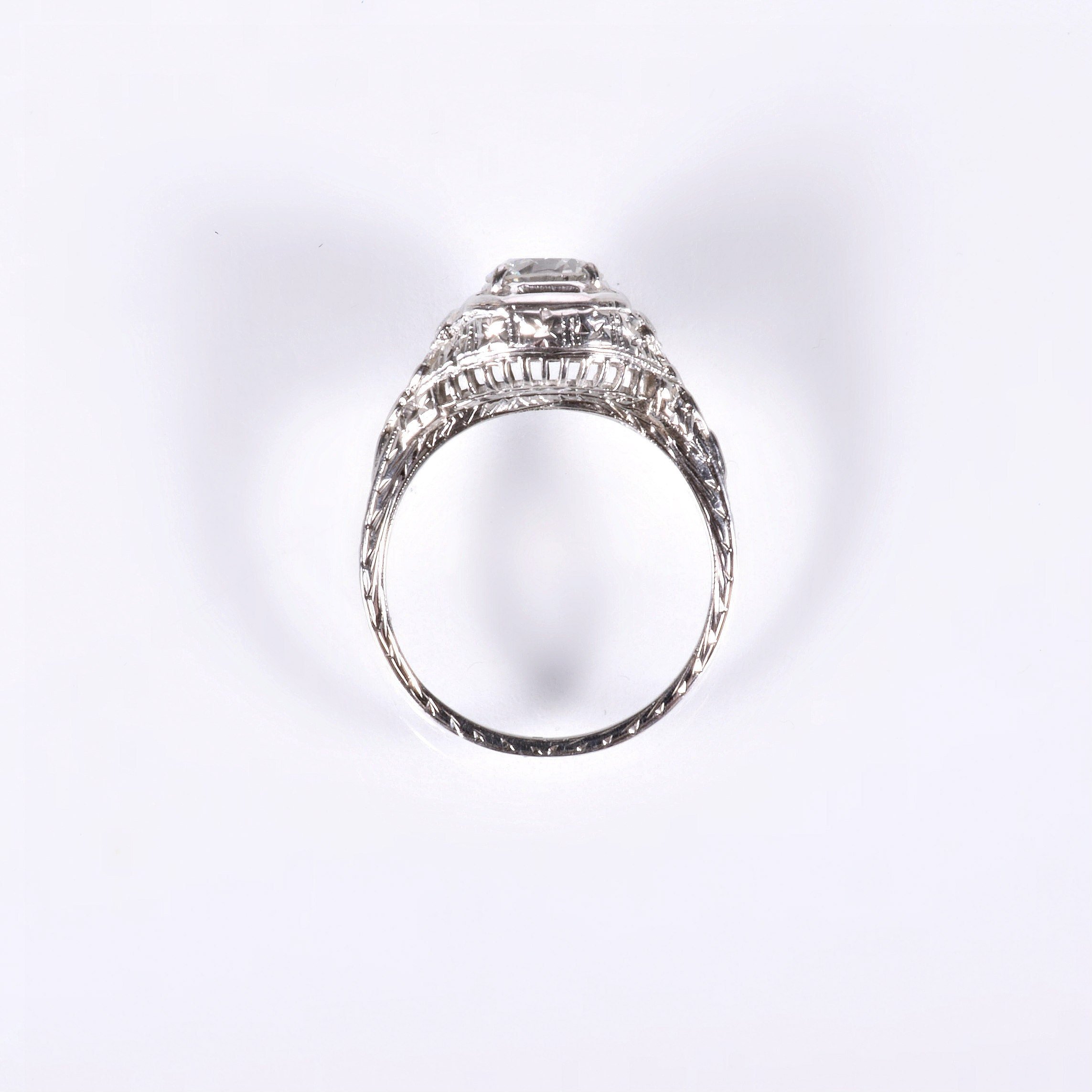It's all in the details, are we right? Just gazing at our photos will draw you in to each and every one of those special details that make this lovely antique diamond engagement ring as unique as it is. At over 100 years old, she doesn't show her age! This highly decorative ring was crafted in beaming 18k white gold with crisp nature motif engraving, an octagonal framework, delicate wirework and more. The engraving is displayed all the way around the ring shank. This glorious setting is the perfect showcase for an exceptional European cut diamond at .89 carats. Make it yours!