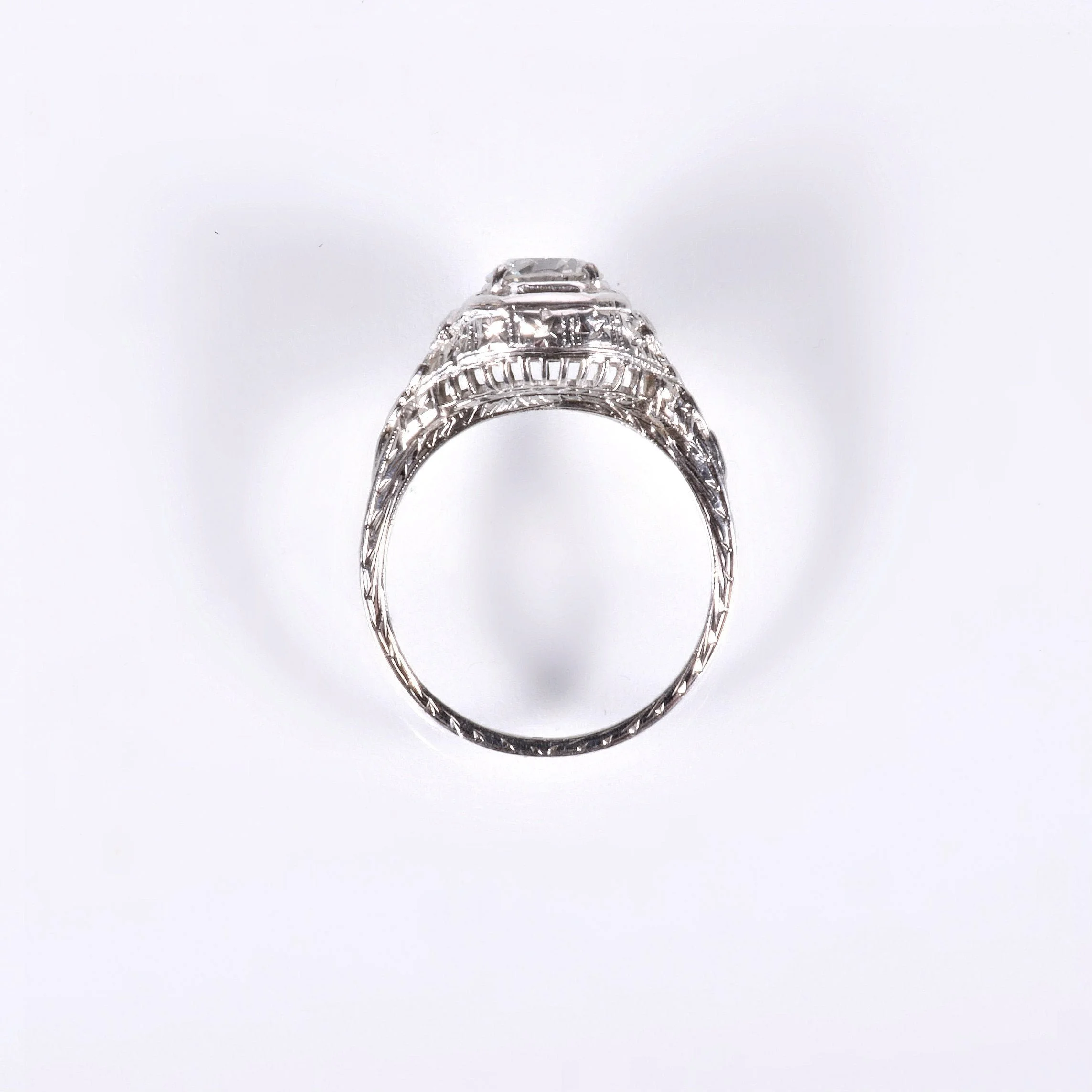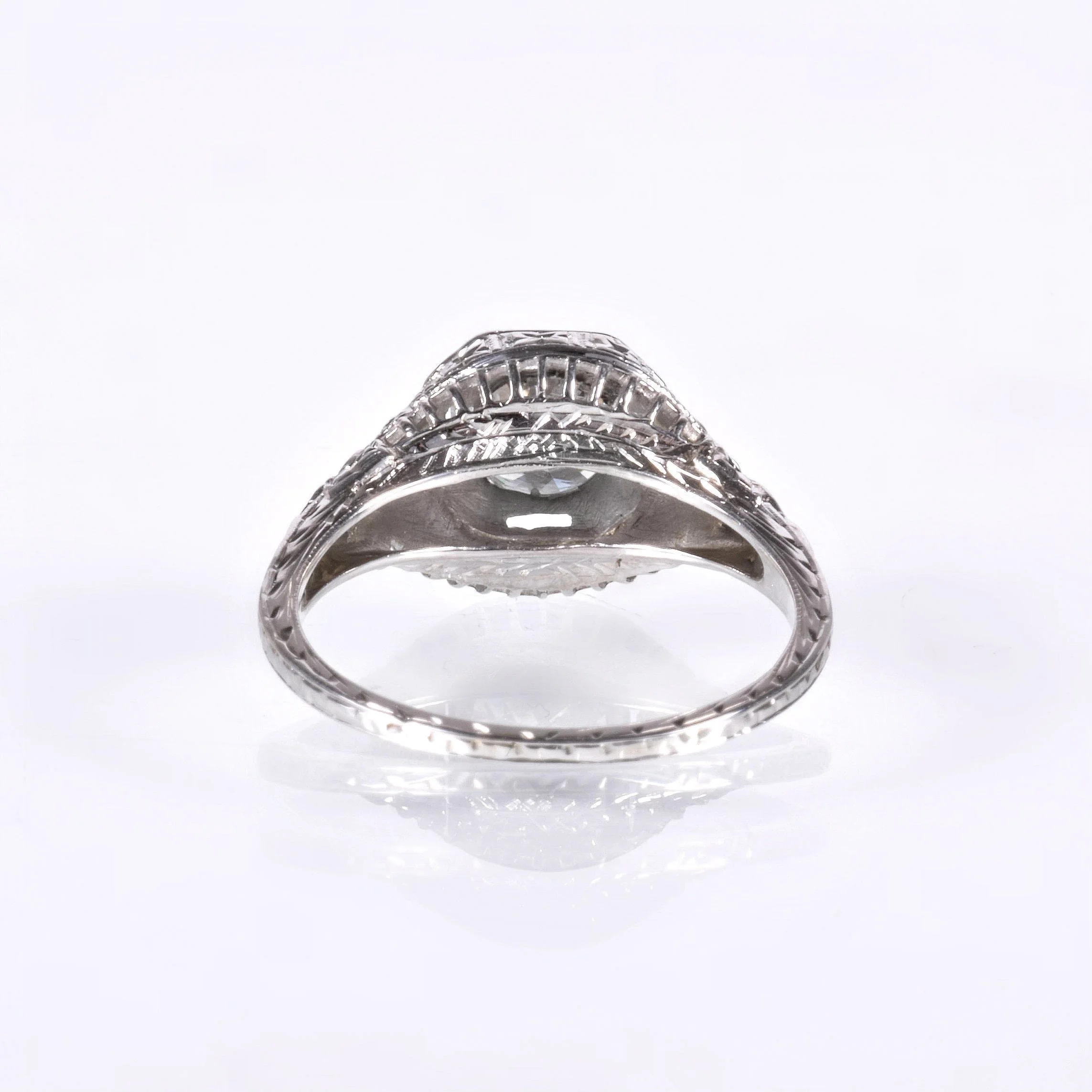 It's all in the details, are we right? Just gazing at our photos will draw you in to each and every one of those special details that make this lovely antique diamond engagement ring as unique as it is. At over 100 years old, she doesn't show her age! This highly decorative ring was crafted in beaming 18k white gold with crisp nature motif engraving, an octagonal framework, delicate wirework and more. The engraving is displayed all the way around the ring shank. This glorious setting is the perfect showcase for an exceptional European cut diamond at .89 carats. Make it yours!