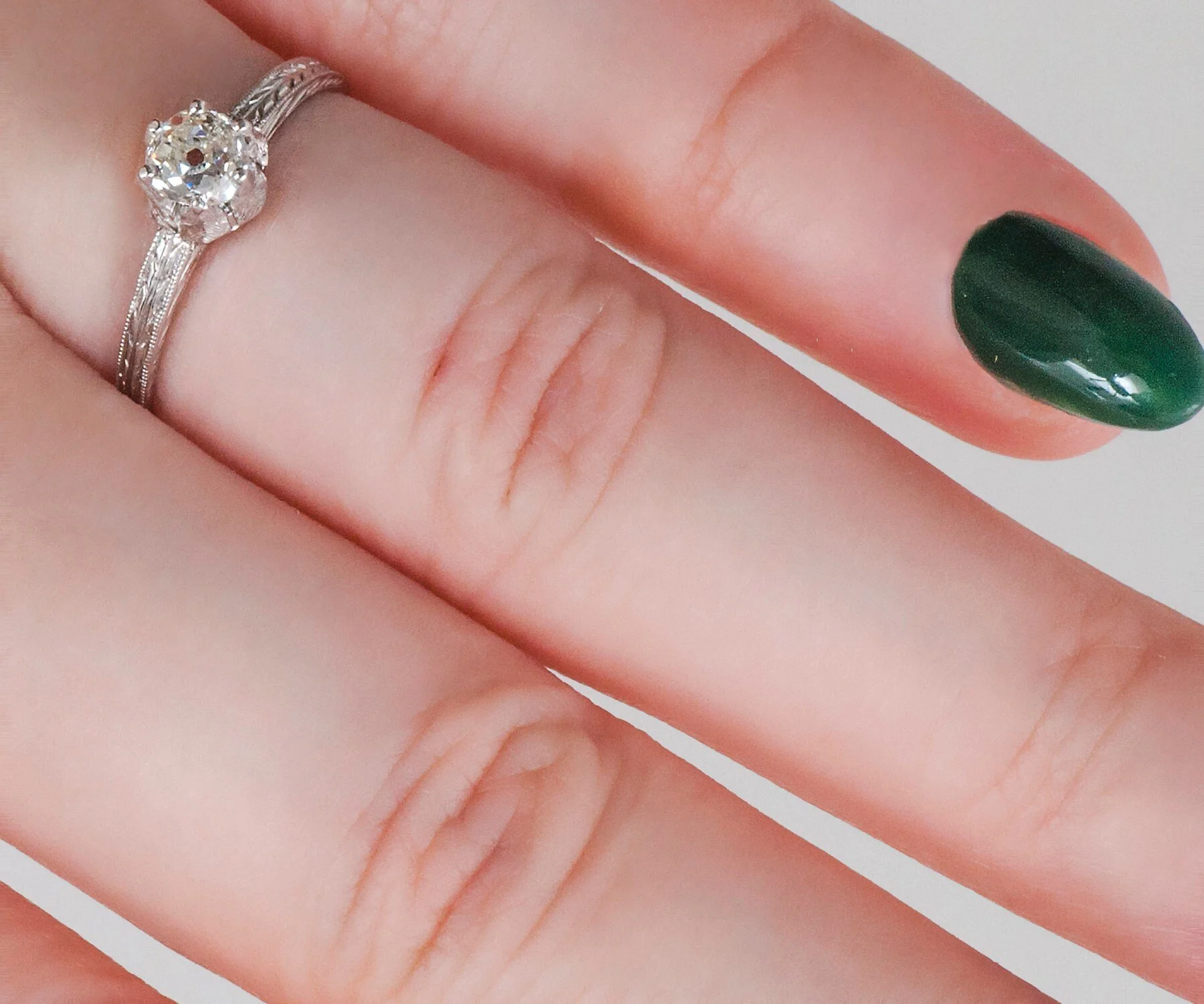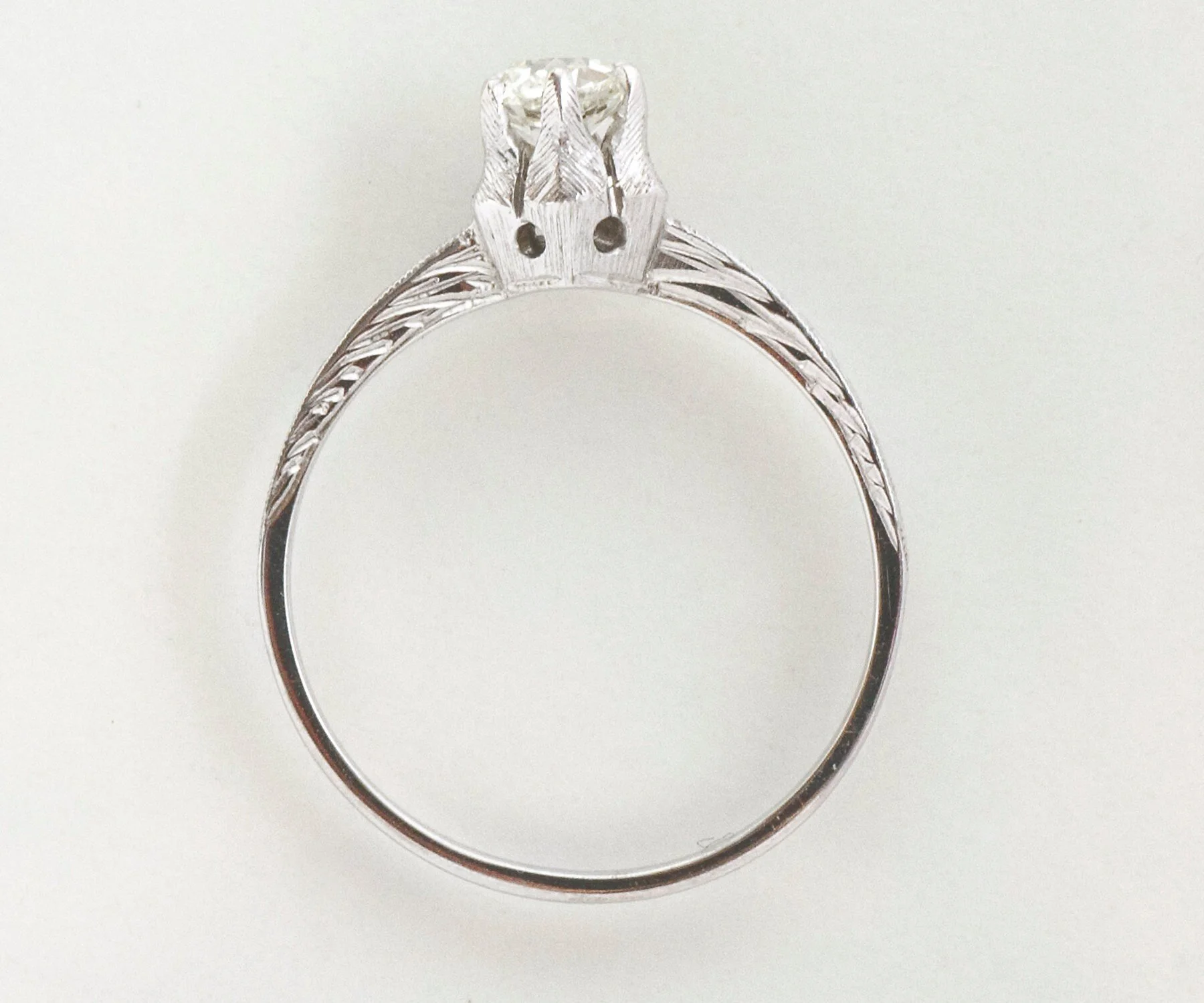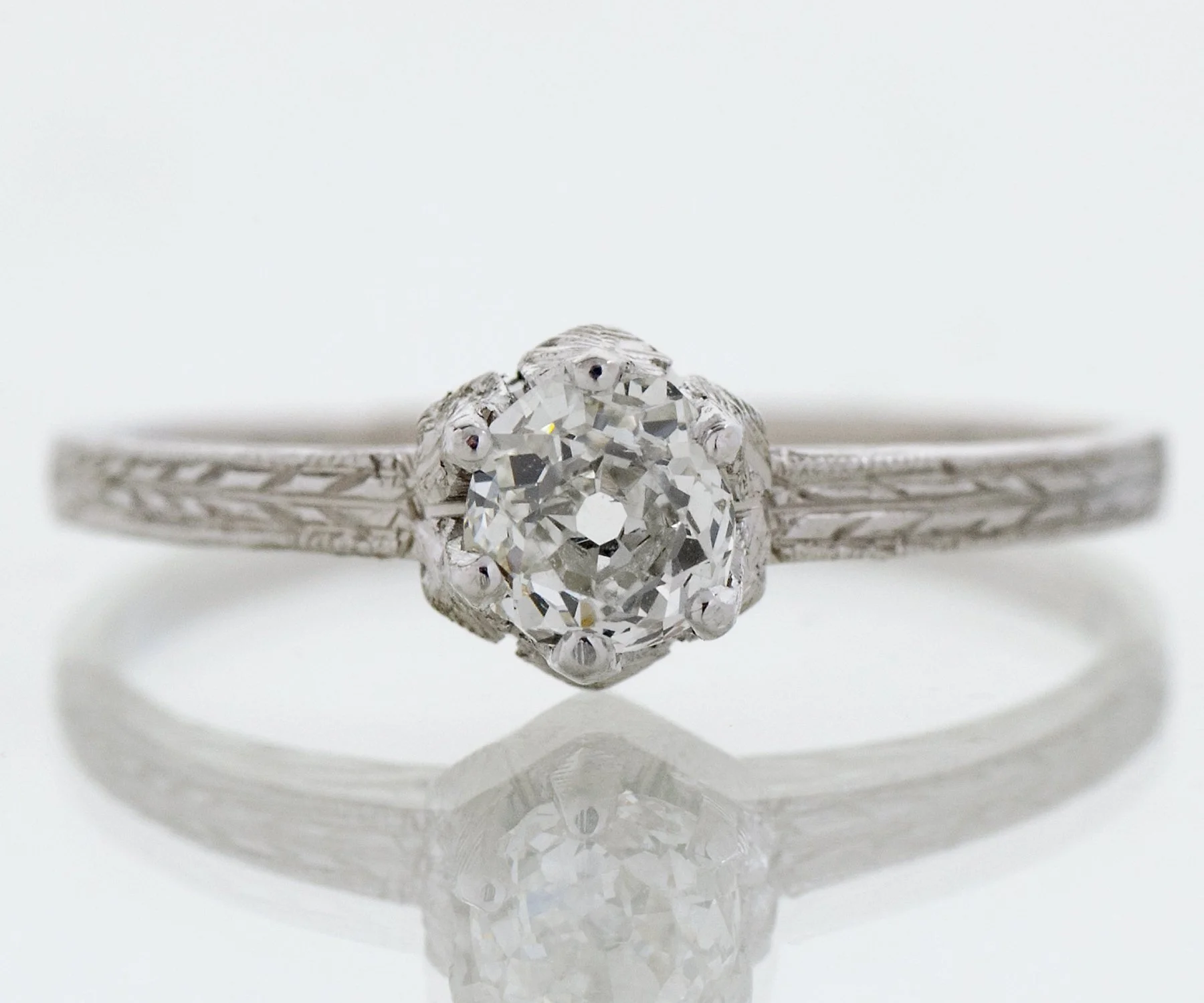 This lovely 18k white gold antique diamond engagement ring has so many wonderful attributes. One is that it was created by Belais. Owning a highly collectible and coveted Belais ring is really like wearing a piece of jewelry history because the company which began in 1873 is considered to be one of the first US manufacturers to use white gold and they came up with their very own formula in 1917. It was sometimes referred to as "Belais Metal". Next is that this ring displays the wheat pattern, which thought to signify a few things including a bountiful harvest, a connection to the natural world and fertility! Lastly, this sweet ring holds a mine cut diamond of wonderful quality at its center, and the setting resembles a flower. So very romantic. What a beauty to wear and enjoy!