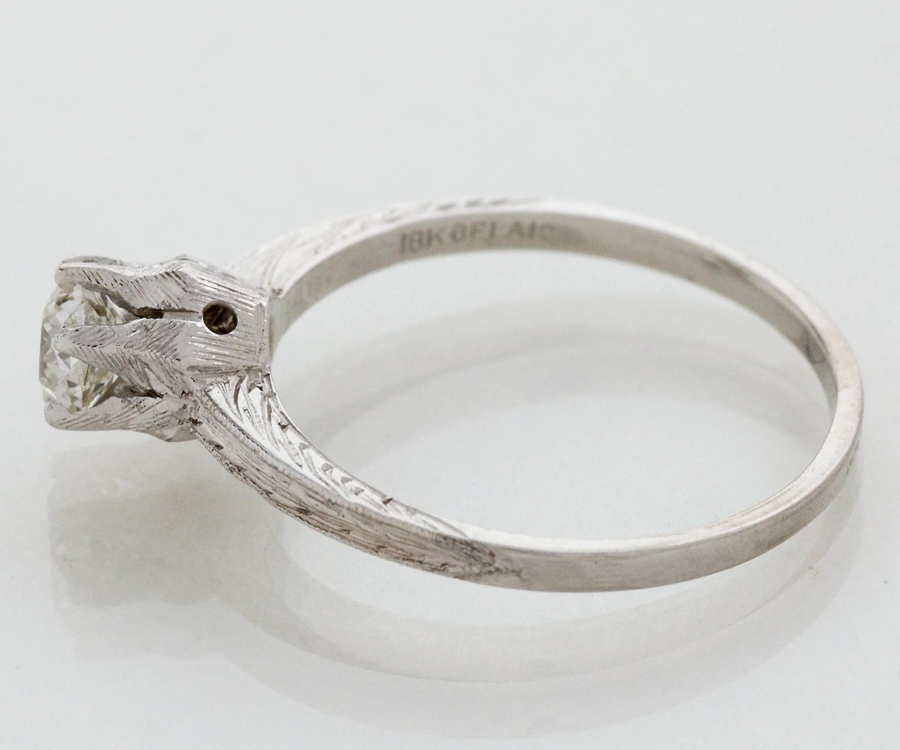 Antique Engagement Ring - Antique 18k White Gold "Belais" Mine Cut Diamond Engagement Ring 18k White Gold Manufacturer - Belais Mine Cut Diamond =.35ct SI1/H Ring Size 5.25 (ring is sizable) Ring measures approximately 5.6mm at center, back of band is 1.3mm wide.