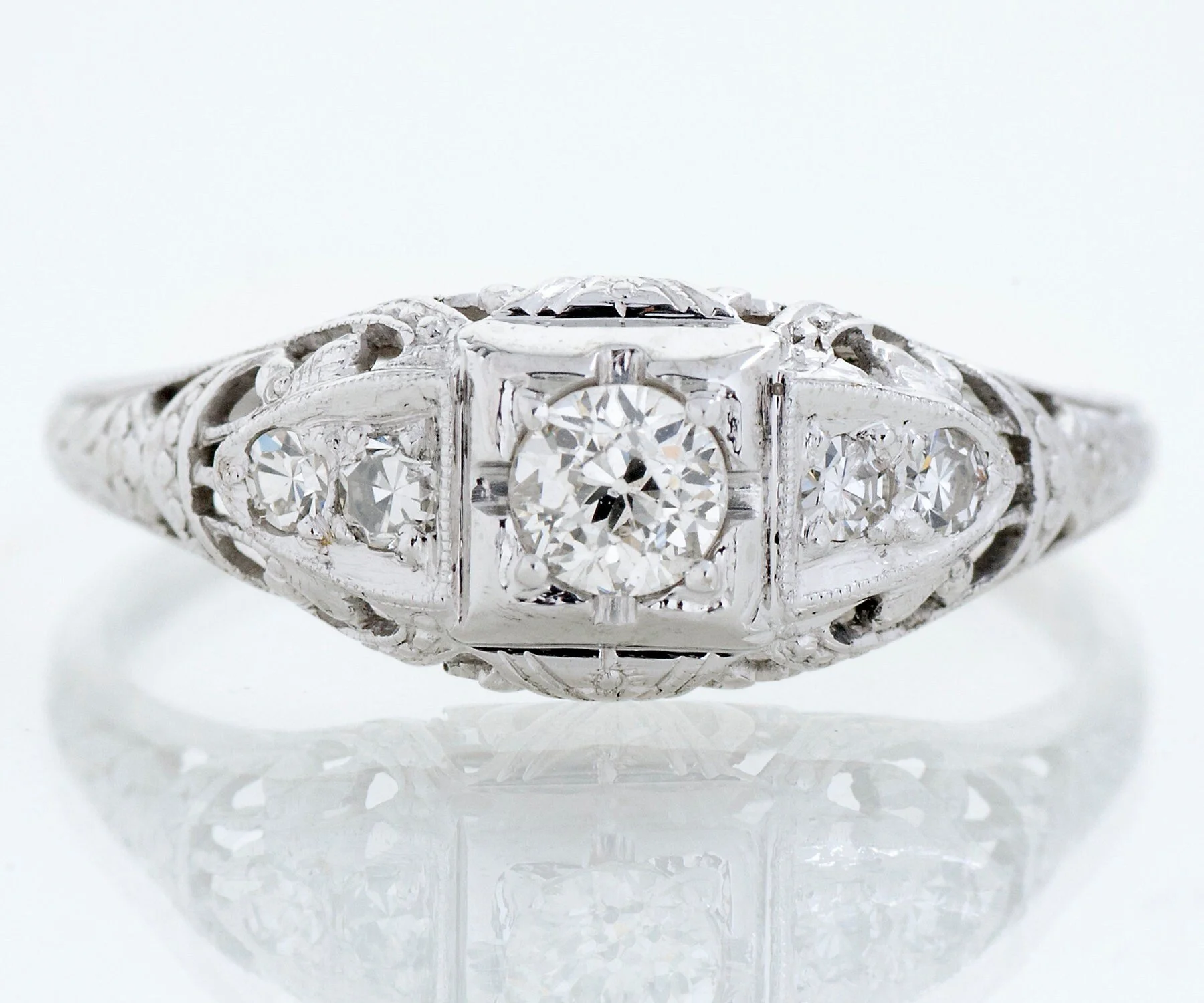 This clean and crisp five stone antique diamond engagement ring comes from the designer Jabel. In 18k white gold, this ring sits very low profile and will look lovely on its own or alongside an antique or vintage wedding band.