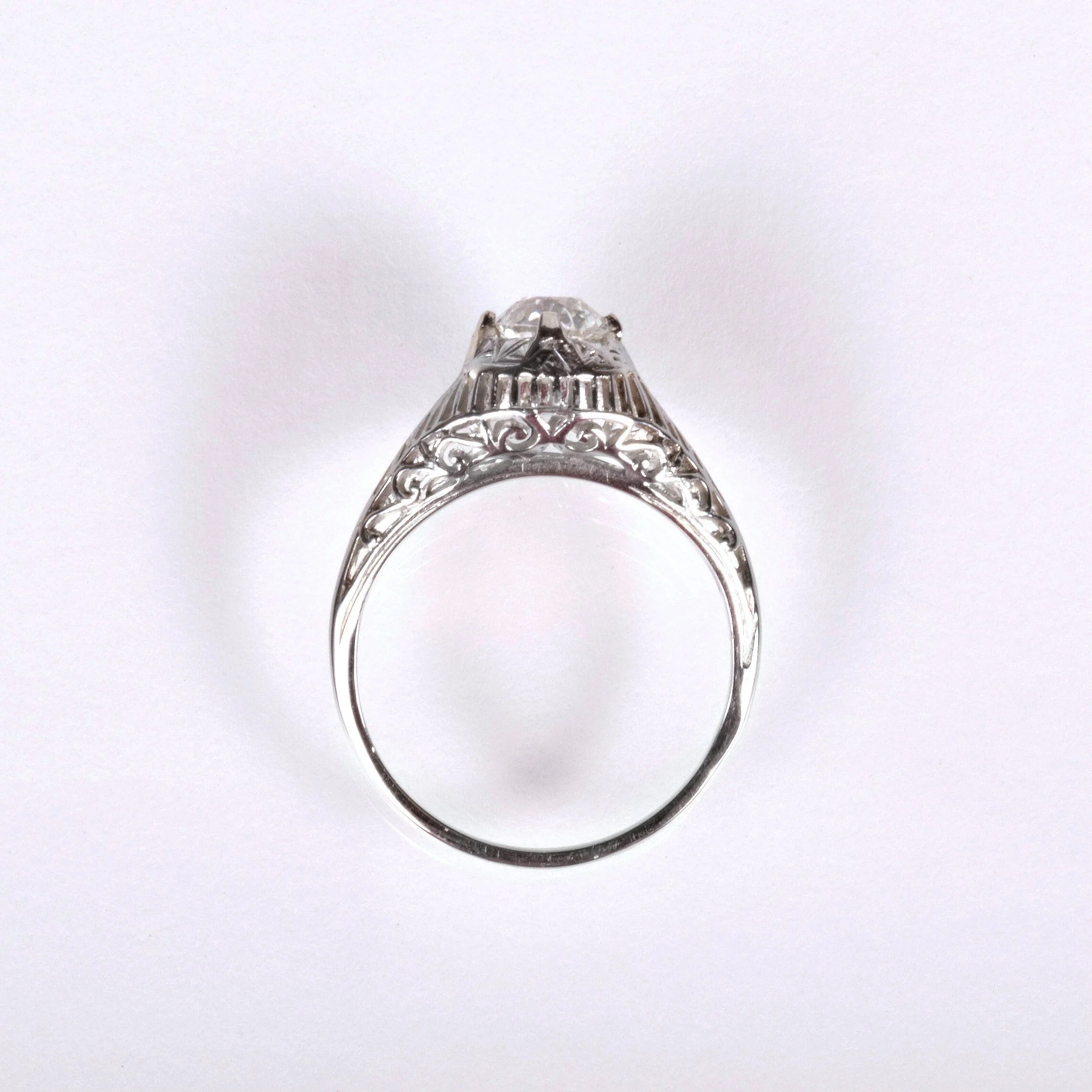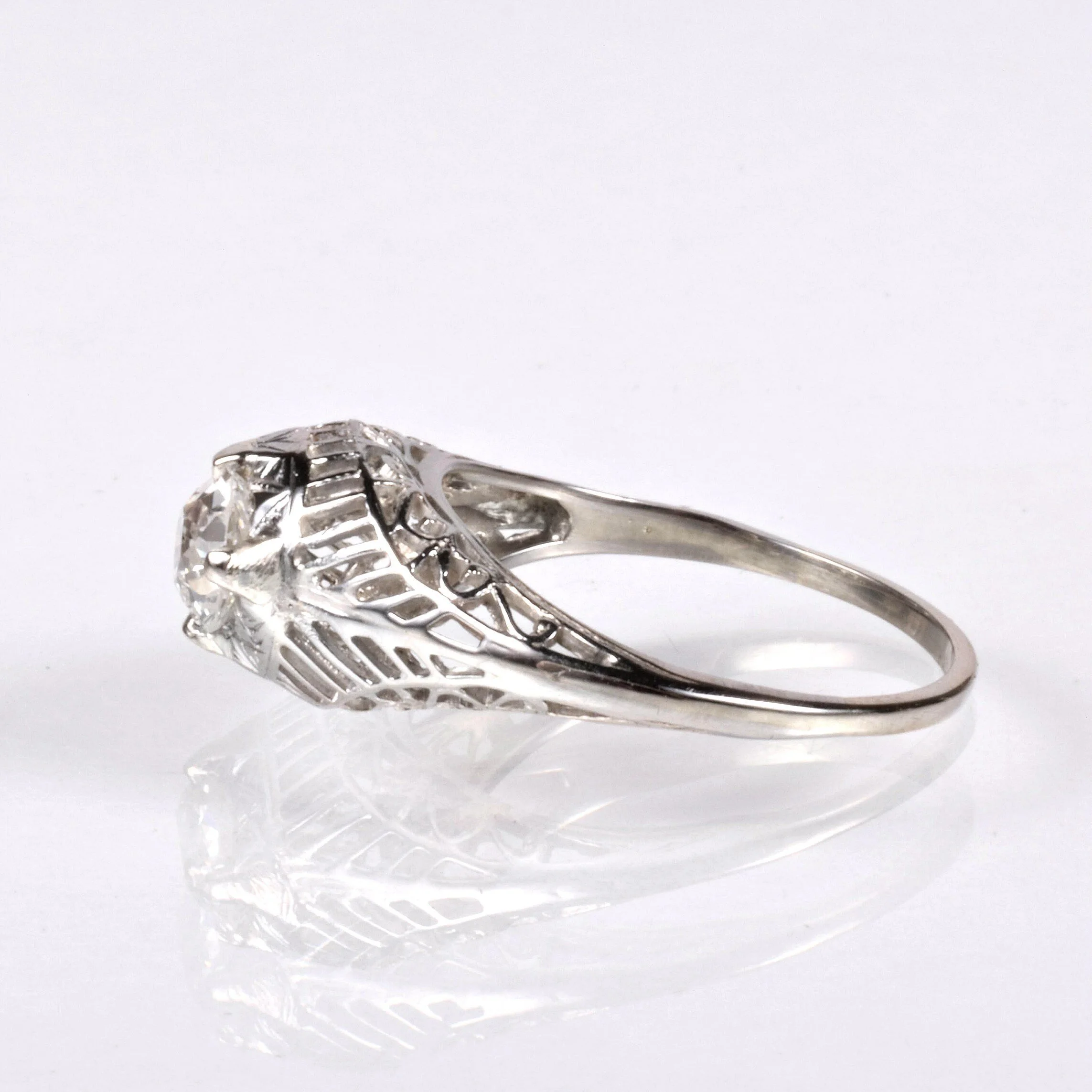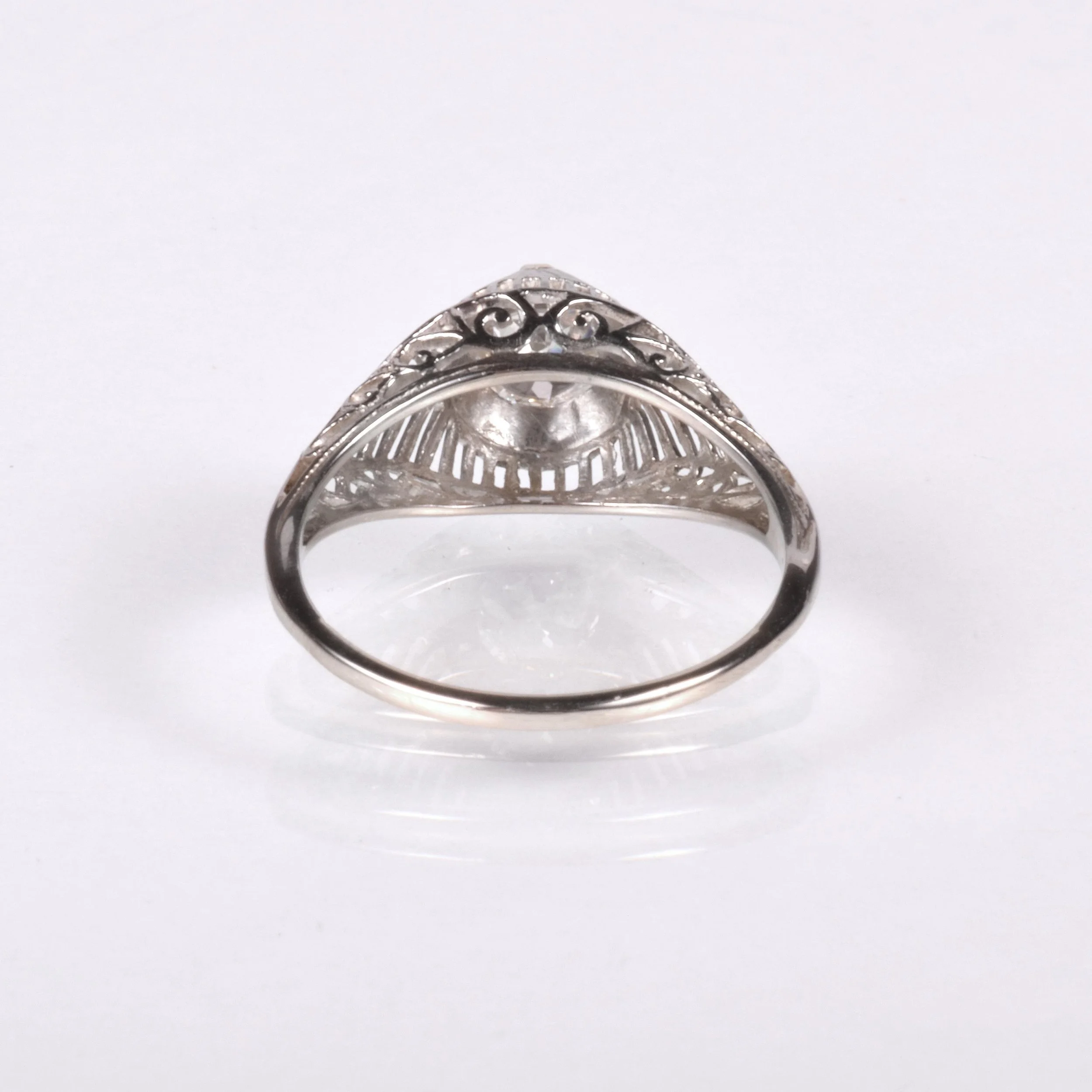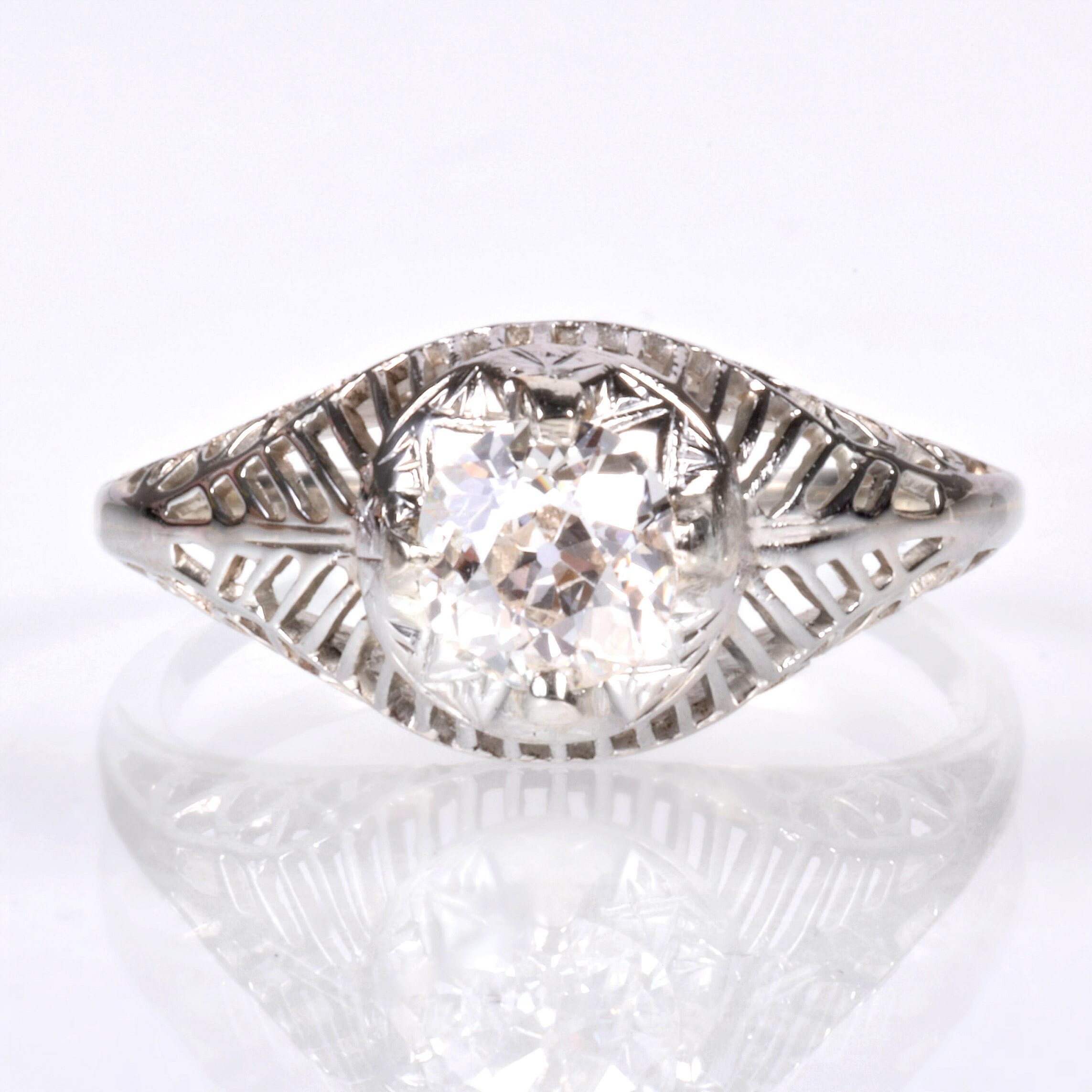 Antique Engagement Ring - Antique 18k White Gold Edwardian Filigree Engagement Ring 1910's 18k White Gold European Cut Diamond =.56ct VS2/H Ring Size 5.75 (sizable) Ring measures approximately 8.5mm at center, back of band is 1.2mm wide.